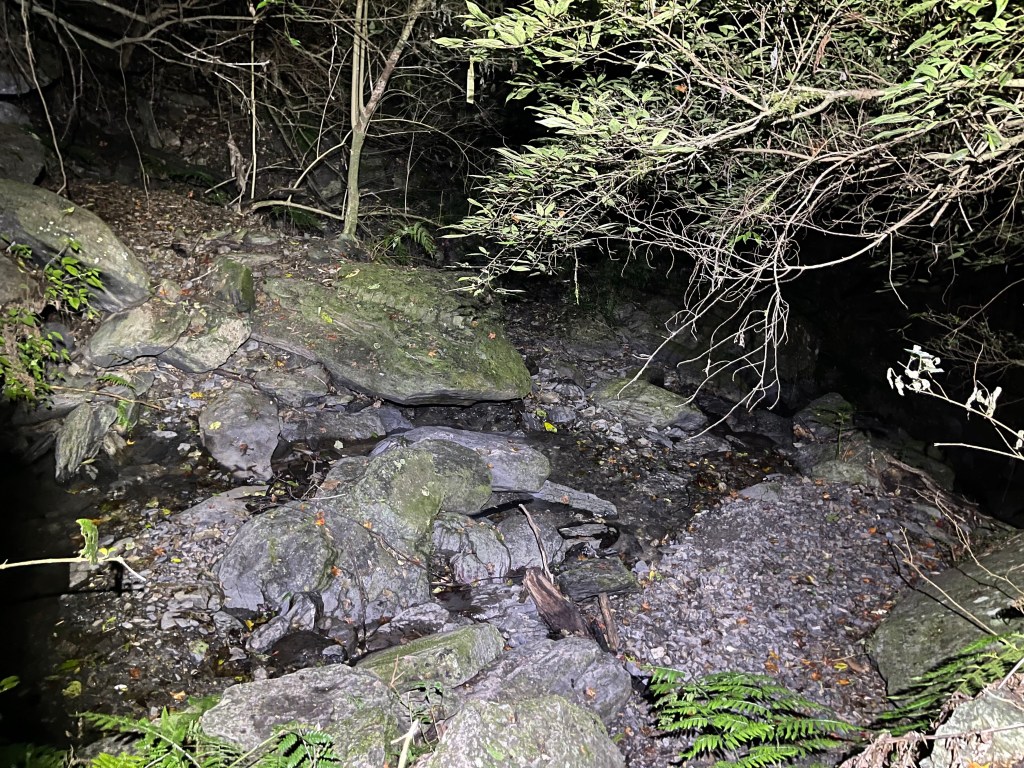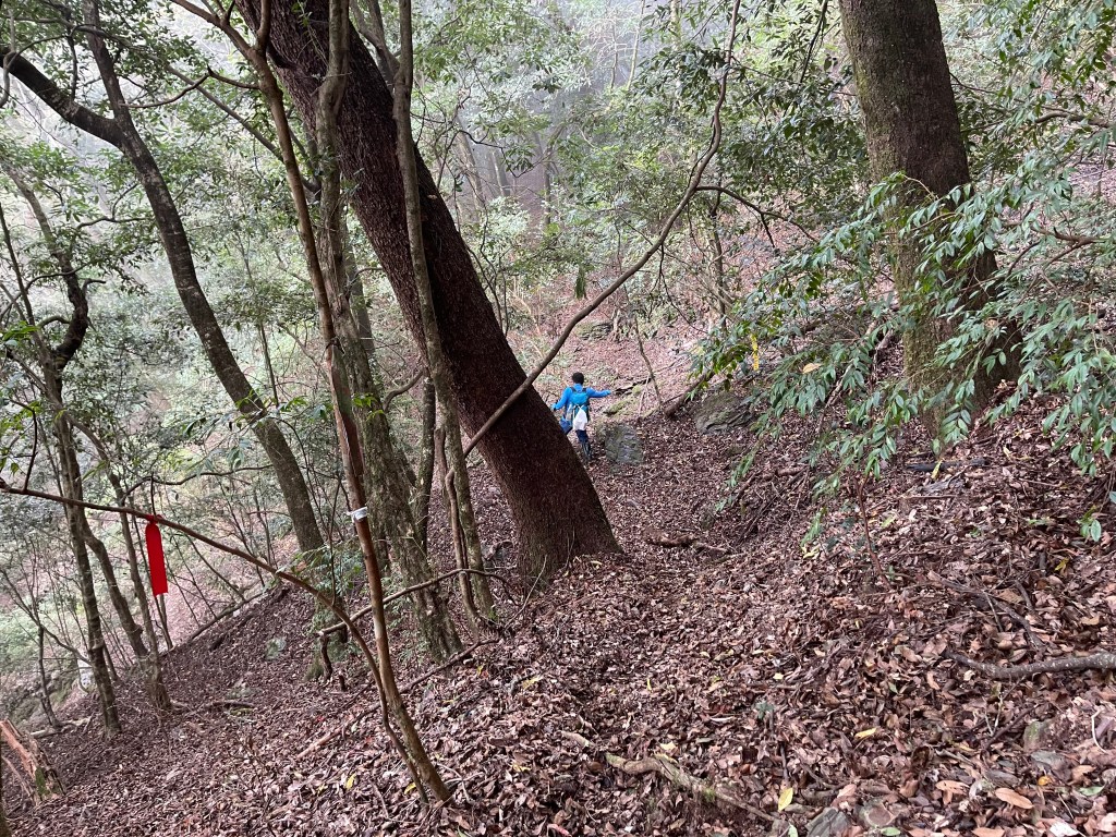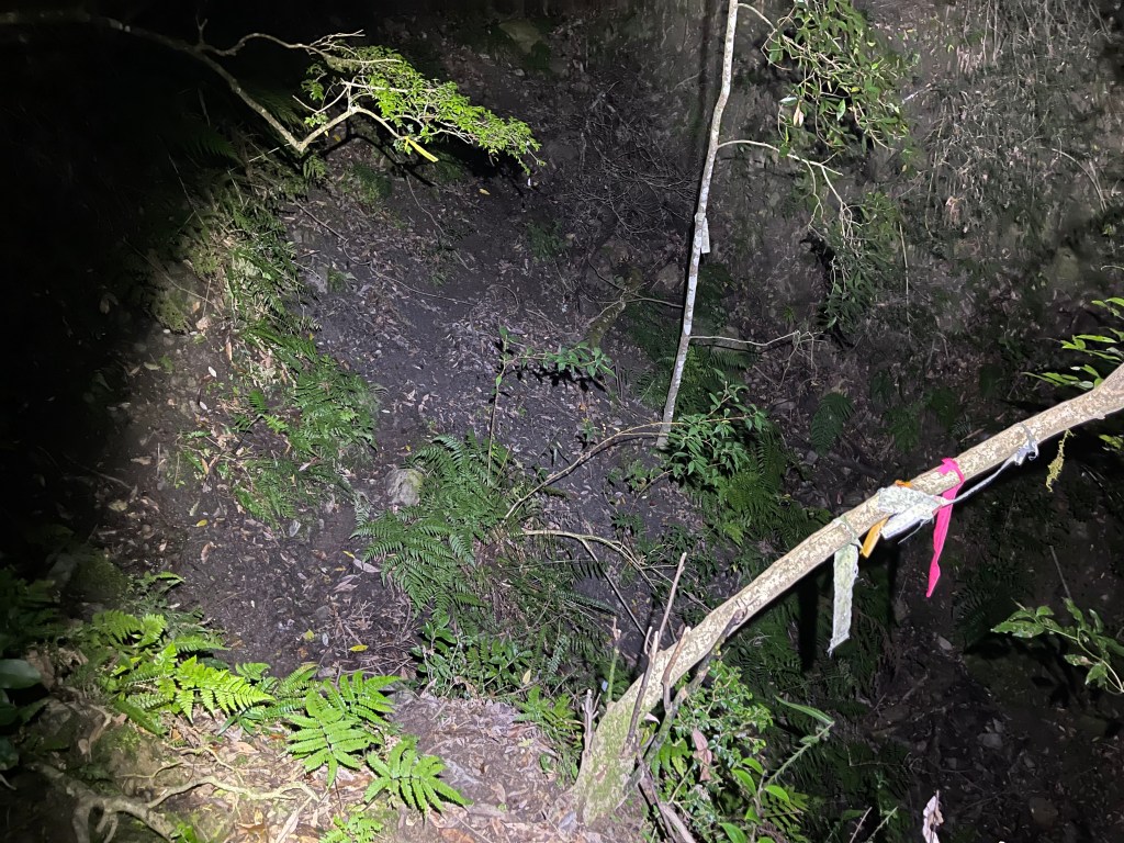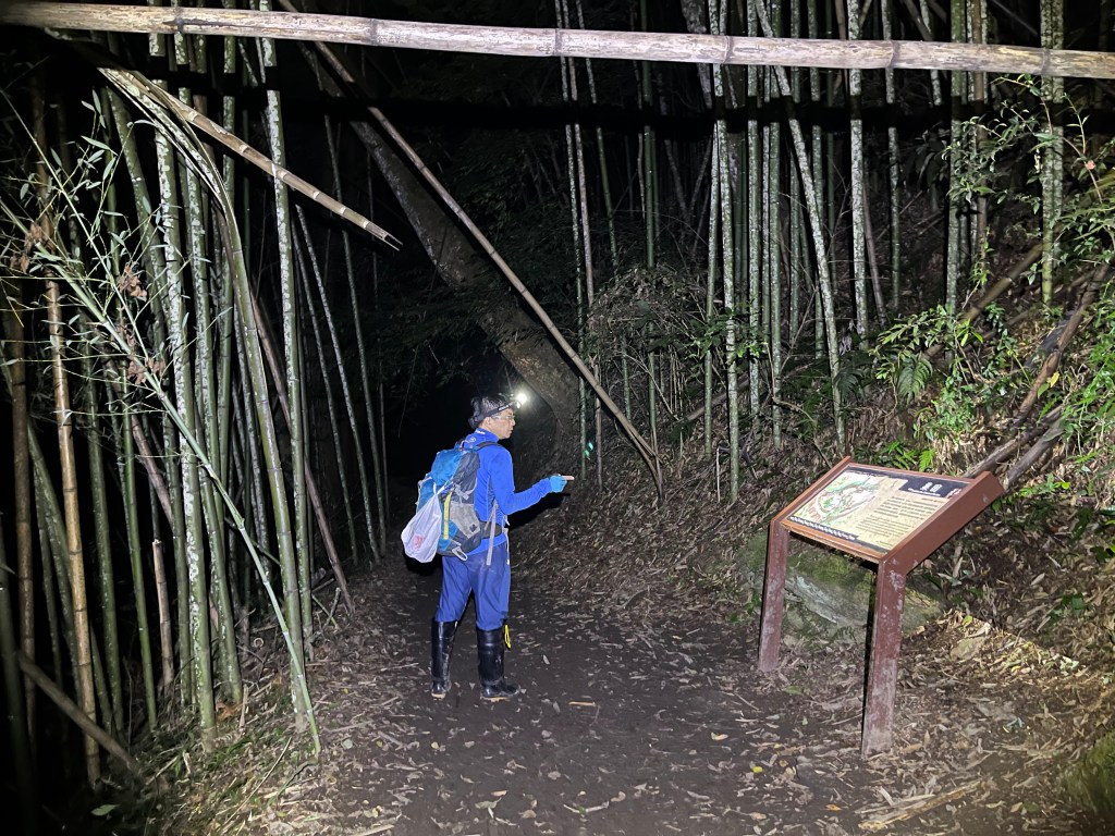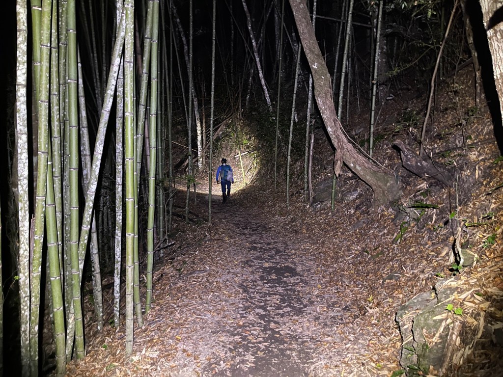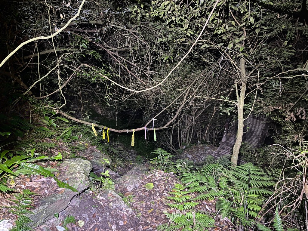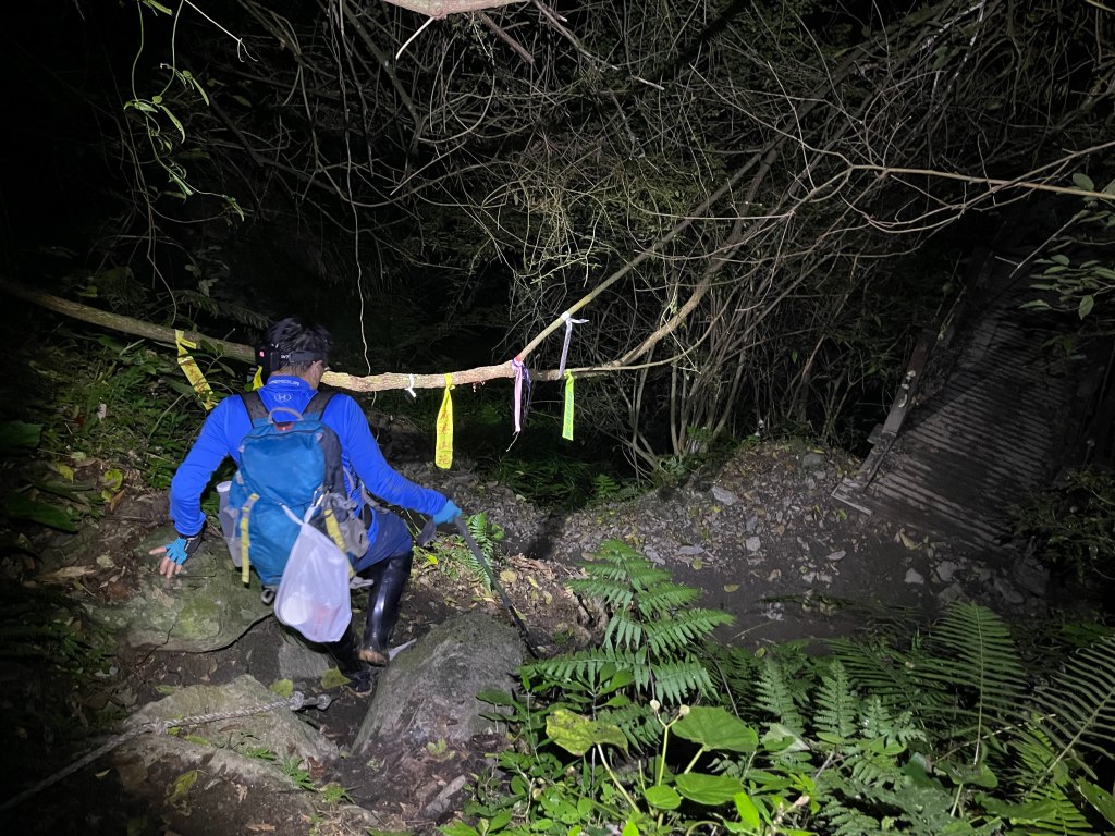 Smile跟我都知道要摸黑,接下來到霞喀羅古道16K木棧橋處還有2K的距離,且一路陡下,我們兩人帶了一點小跑步的速度,走了1.2K後,天邊泛白但樹林內已經昏暗,拿出頭燈,開始放慢速度,走這溼滑的0.8K,陡下至過溪後100m,就接上霞喀羅古道16K的木棧橋,此時已接近晚上六點,冬天的晚間六點已然全黑。