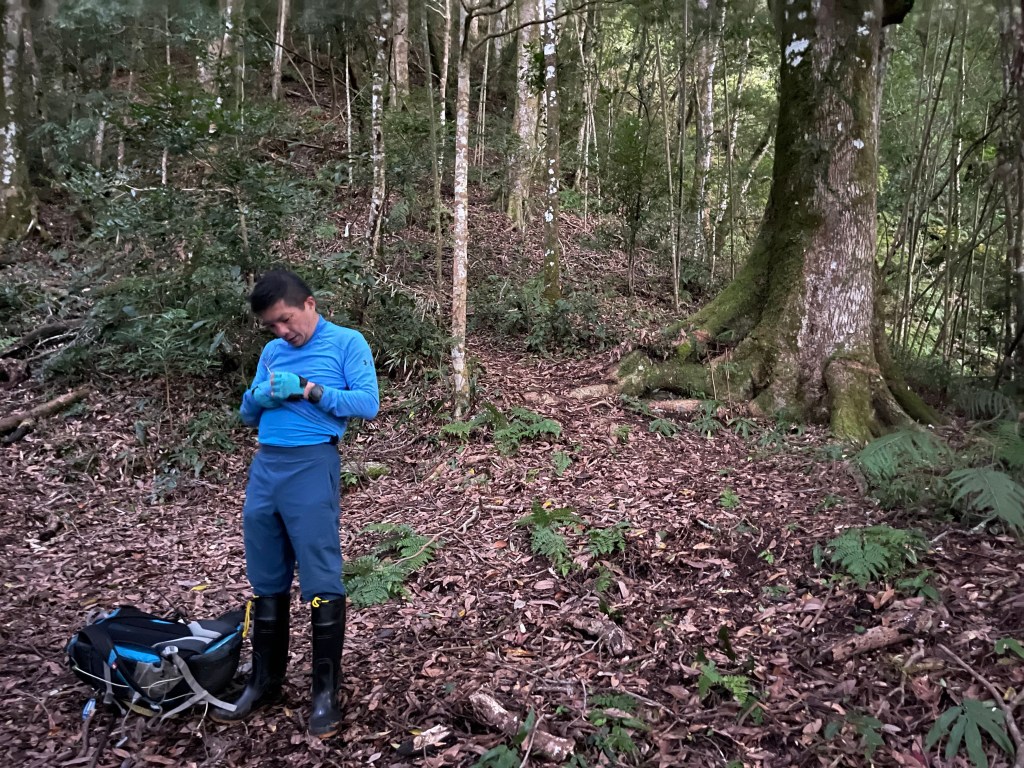 為何稱Leo是友情演出?Smile與我是前一天先來住宿,而Leo是這一天清晨快5點,才由台北開車到養老約7點半再開始起登來追我們,結果只到養老山西北峰就追上啦!陪我們走了3.3K的産業道路,及一段往養老山的陡上路徑後,就先跑到養老山煮水泡茶等我們到達,接著又先攻到基那吉山幫我們泡麵。