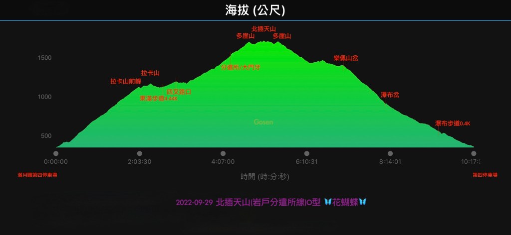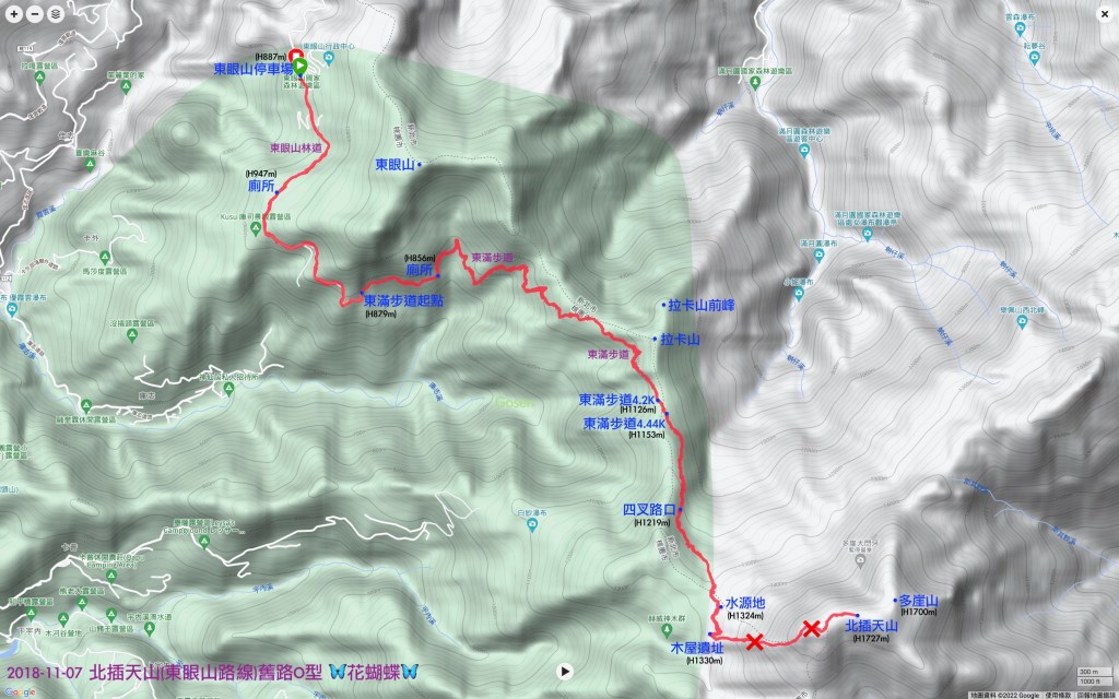 06:21 滿月圓第四停車場(H360m) (總里程0.0K) 07:48 岩石(H785m) (總里程1.7K) 09:01-09:09 拉卡山前峰 (H1145m) (總里程2.9K) 09:33-09:51 拉卡山(H1150m) (總里程3.2k) 10:06-10:09 東滿步道4.2K(H1126m) (總里程3.8K) 10:13 東滿步道4.44K(H1153m) (總里程4.0K) 10:32 四叉路口(H1219m) (總里程4.9K) 12:16-12:33 大門牙/岩戶分遣所(午餐 )(H1507m) (總里程6.75K) 13:08 三岔路口(22號)(H1677m) (總里程7.1K) 13:18-13:25 多崖山(H1700m) (總里程7.25K) 13:53-14:03 北插天山(H1727m) (總里程7.7K) 14:28-14:33 多崖山(H1700m) (總里程8.15K) 14:39 三岔路口(22號)(H1677m) (總里程8.3K) 15:27 東滿步道岔(H1422m) (總里程9.2K) 16:24 樂佩山岔(H1402m) (總里程9.8K) 16:40 木炭古道岔(H1311m) (總里程10.2K) 17:37 瀑布岔(H906m) (總里程11.3K) 19:19 滿月圓瀑布步道0.4K(H571m) (總里程12.7K) 19:31 森林小舖/廁所(H482m) (總里程13.6K) 20:16-20:21 滿月圓收費站/廁所(H390m) (總里程14.9K) 20:28 滿月圓第四停車場(H360m) (總里程15.2K)