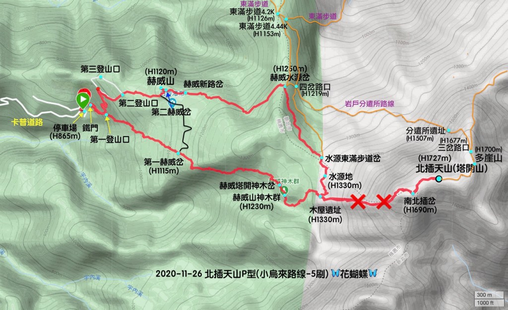 由第一登山口起走,約接近2.9km時可抵達赫威神木群,由卜派神木開始上場,依序可以看到赫威神木與八仙神木等,可以感受到人的渺小,造物者的神奇。再前進陡上約0.6km後可以抵達木屋遺址的平台,一般都會在此休息一下,等待接下來1.3km直上仰攻北插天山的考驗。即圖中打「❌ 」的路線。