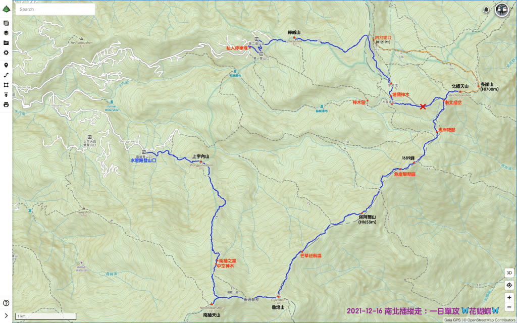 上圖:南北插縱走路線圖。打「❌ 」的路徑,自20220501起暫停開放,要由右上橘色 的岩戶分遣所路線回到四岔路口。在手機上可以自行放大圖片來看 。