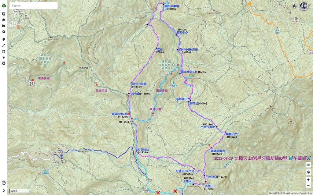 上圖:由Gaia GPS所紀錄的等高線路線圖。紫色 路線即為我們今日的行走過程。左下方的深藍色 路線為由小烏來起登的路線,圖片中最下方打「❌ 」的路徑,由木屋遺址到北插天山之間,2022.05.01起為防止生態環境持續破壞暫時封閉,必須改由岩戶分遣所路線登北插天山。淡青色 路線路線是過去未封閉前由滿月圓登頂北插天山的傳統路線。圖片中間紅色 點軌跡為東滿步道,是相對優良好走的步道。圖中「❓」的路徑為當日伙伴探勘走了一部份,發現極為陡峭且沒有布條的路線。在手機上可以自行放大圖片來看 。