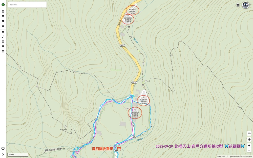 影片:北插天山由滿月圓起登的O型動態移動路程。請點選影片,即可看到游標指引的路徑移動過程。