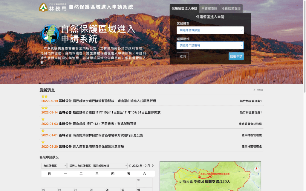 以上各項調整自2022年5月1日起實施,相關進入申請請依「申請進入自然保留區許可辦法」規定辦理,應先由(林務局自然保護區域申請系統 )申請入園,經許可後方能進入。