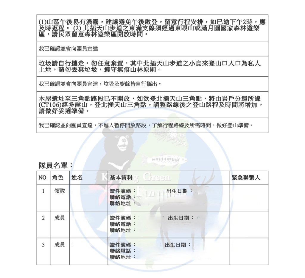上圖:自然保留區進入許可證的第一頁,每次申請至少要3人以上同時申請。本次我們分為兩部份申請,每一部份申請三人。