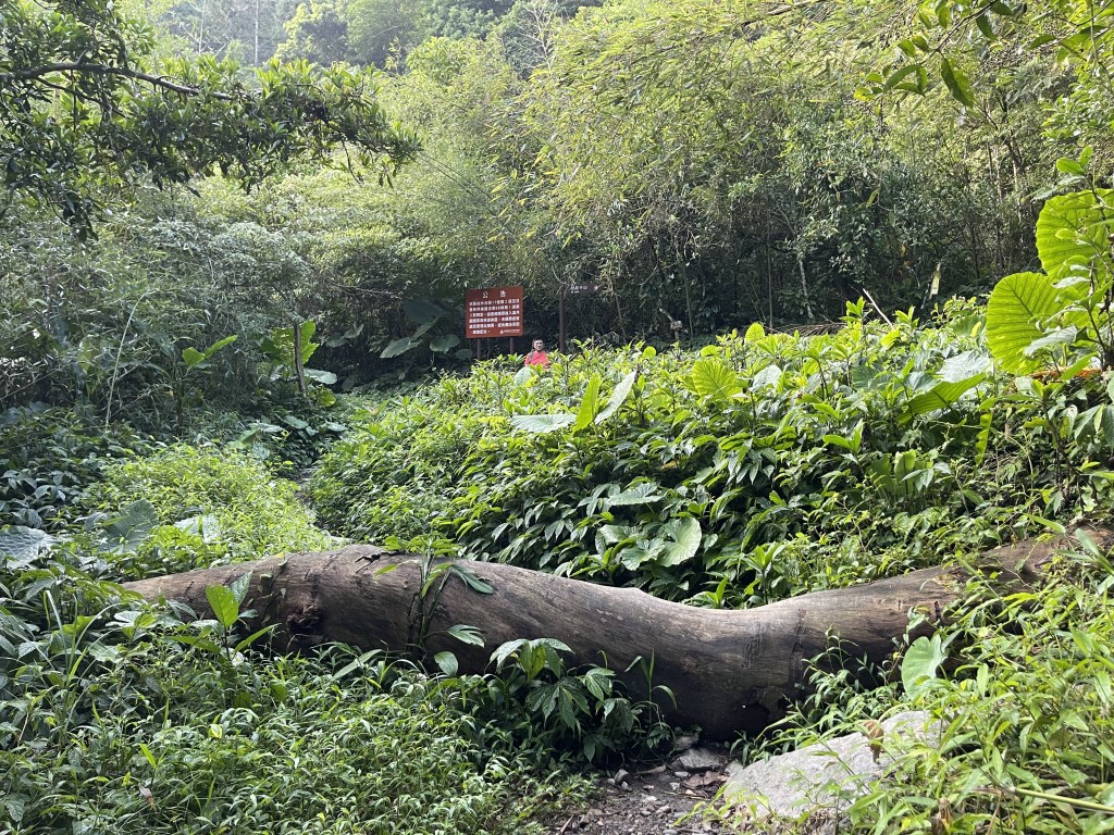 影片:在此木炭古道岔,這裡是十字路口,繼續直直下走就是。接著,要走1.1K的距離,下切到海拔約900m的瀑布岔。