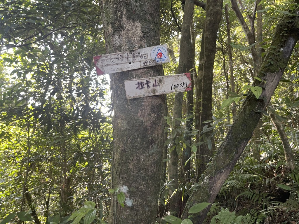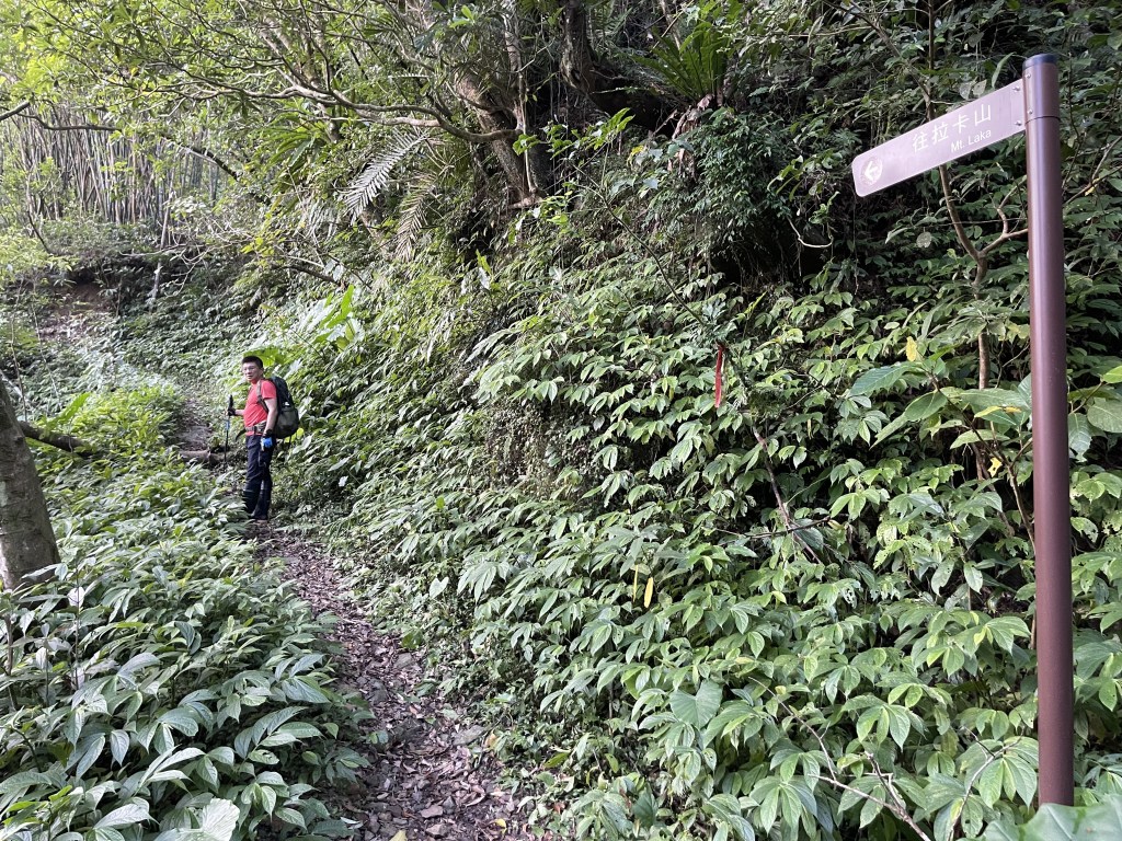 從這一段路徑上,一開始就要過溪,過溪後會遇到岔路,右岔往東眼山,左岔往拉卡山。接著走,就會過第二次溪,接著來到三岔路口,這個三岔路口有立招牌上有警語,要遊園者不要從這裡進入滿月圓,否則觸法將依法究辦!招牌右側有寫著往拉卡山的指示牌,跟著指示牌右轉。接著,一路陡上,路徑非常清楚,特別陡峭的路段都有繩索可以輔助,小宋、采庭、妙妙及嘉鴻四人走得很快,我得等等Smile,一路走走停停,約在早上9點整來到拉卡山前峰,拍完照,再走300m,最後登頂前100m需要垂直拉繩陡上高度約有30m,在早上9點半登上拉卡山,除了Smile與我(Gosen)之外,大伙都比我們早10分鐘就已經抵達。