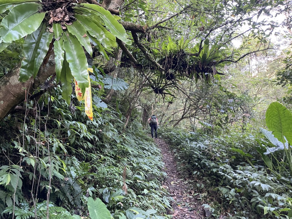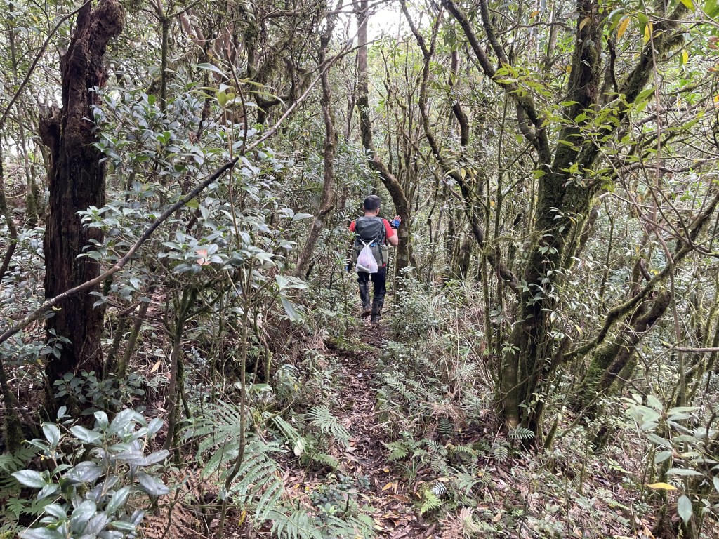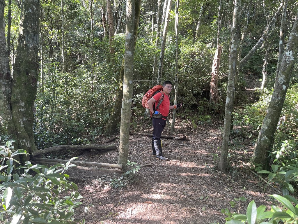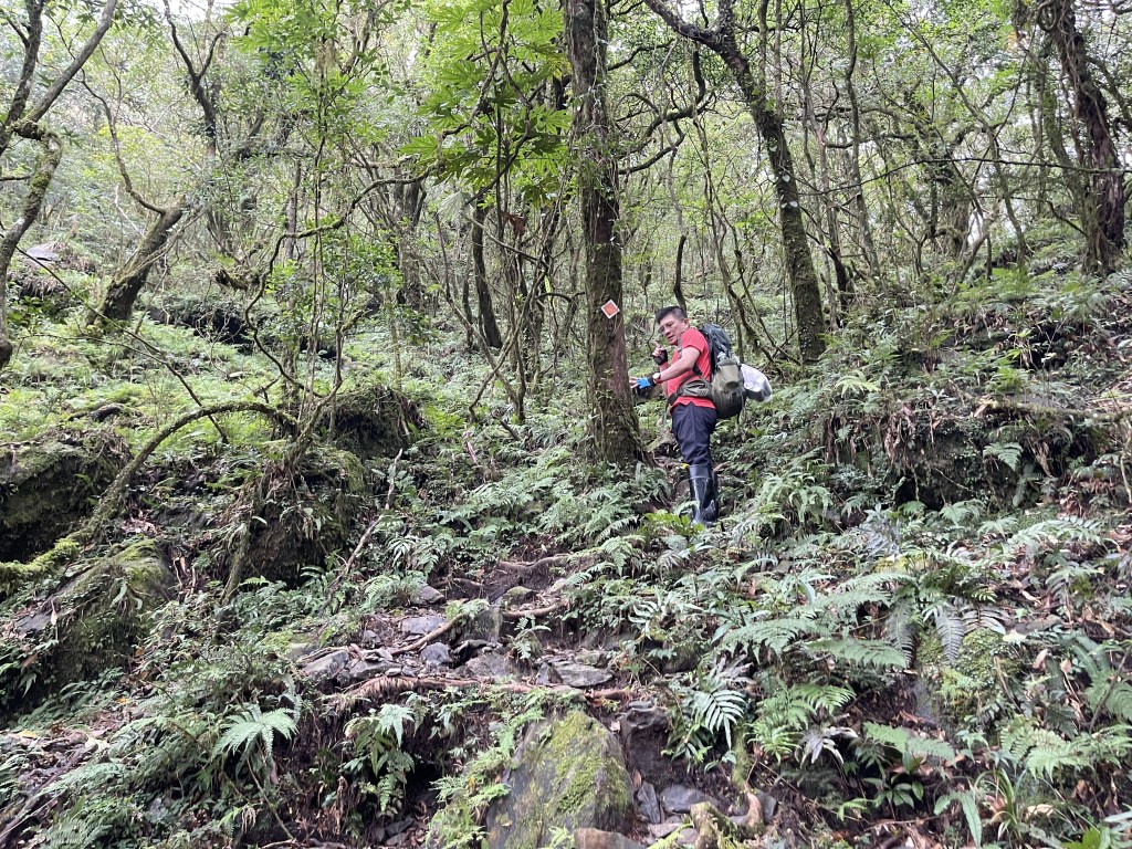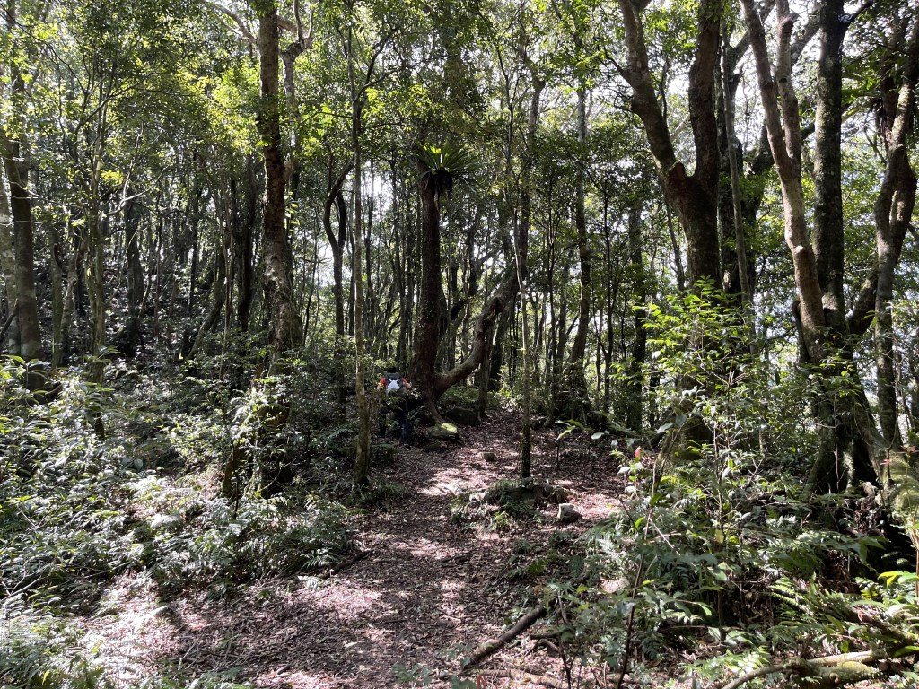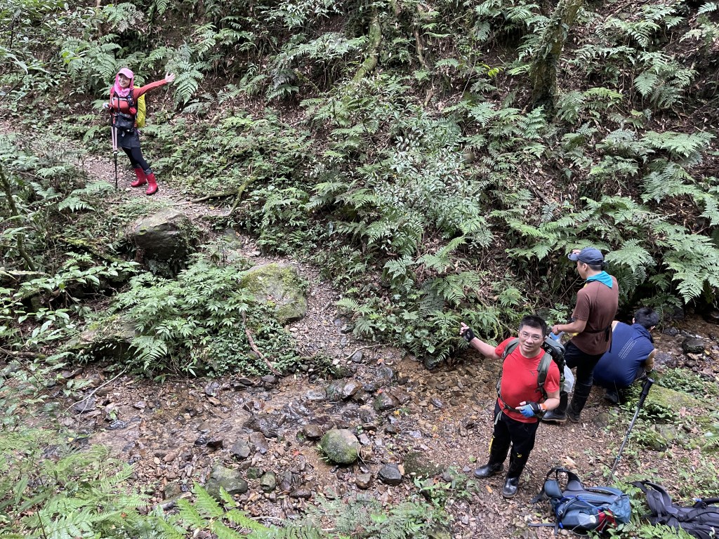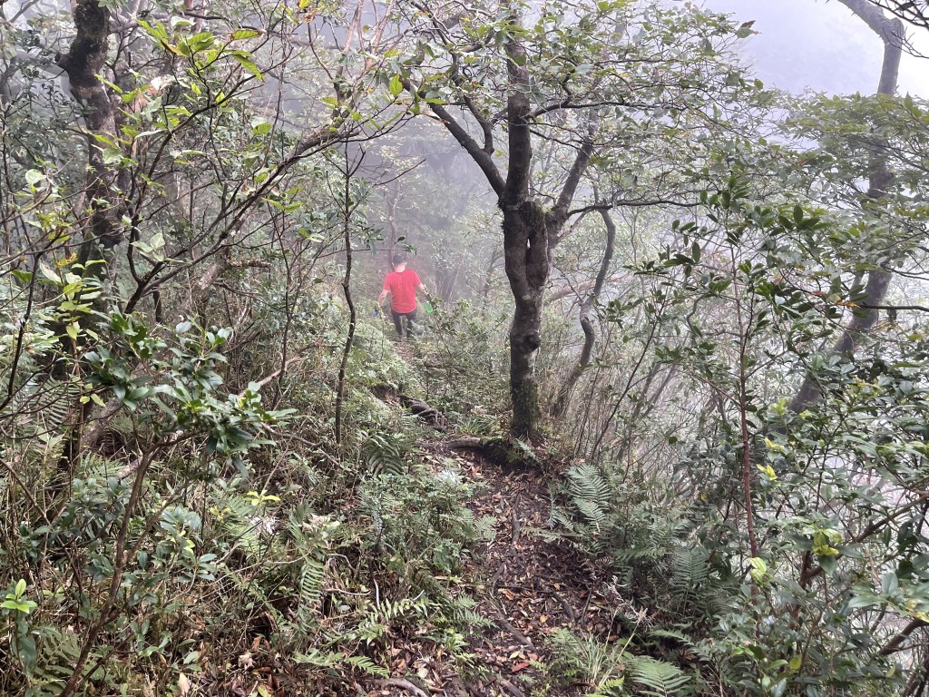抵達北插天山時就已經接近下午2點,此時大伙也不太敢耽擱太久,回程經多崖山回到三岔路口,此時往右往樂佩山及滿月圓瀑布方向走,妙妙與采庭的速度很快,只能用呼喊的方式確定在我們的前方,嘉鴻與小宋跟隨在後,此時慢吞吞的Smile突然恢復正常,居然速度上也變得比較快了,終於甦醒了!