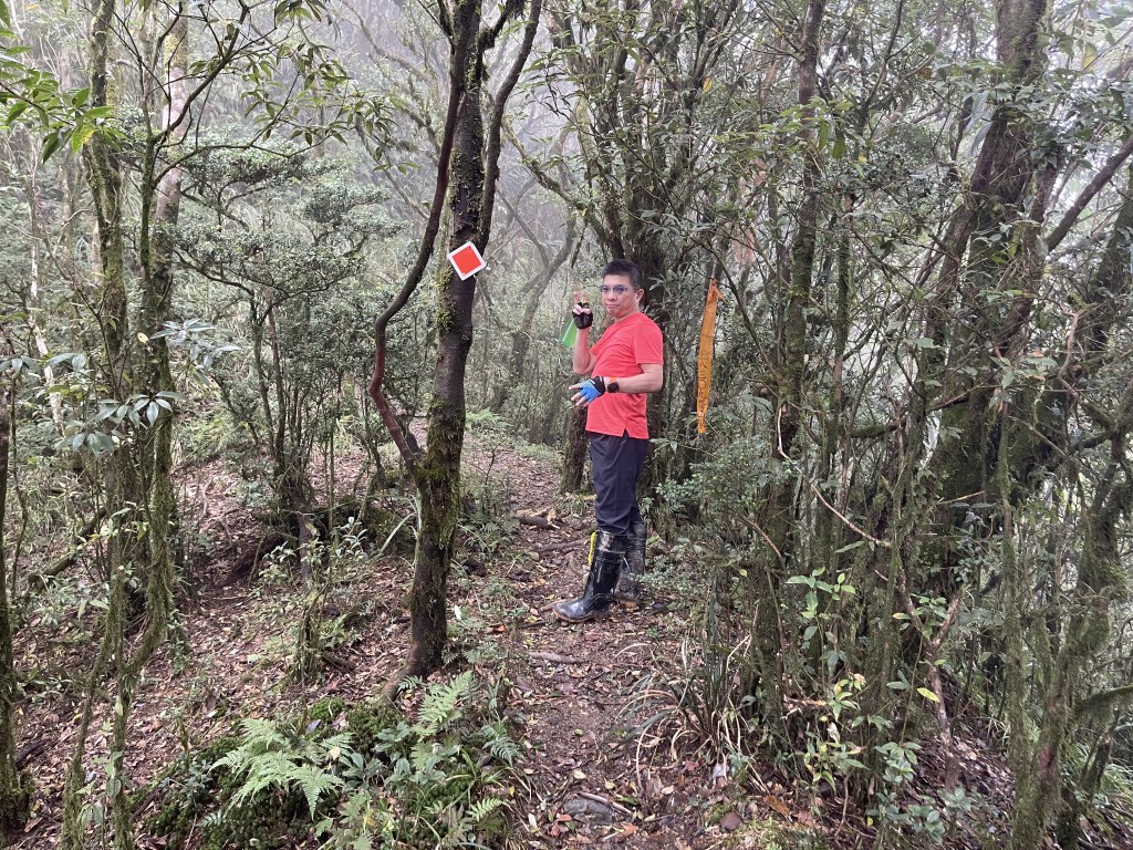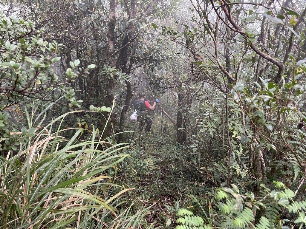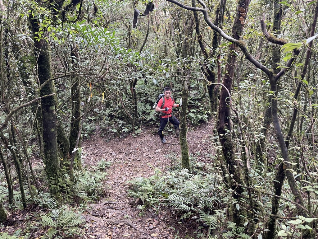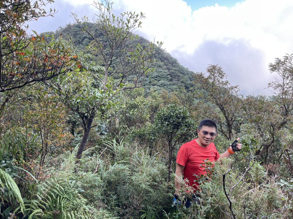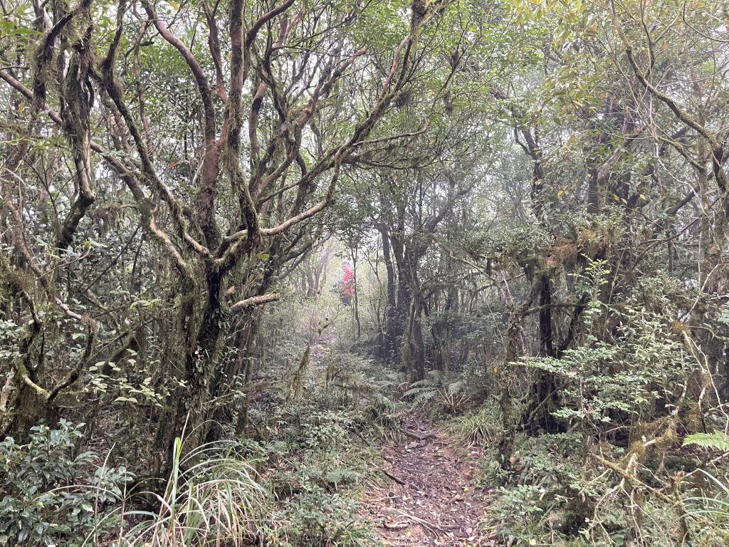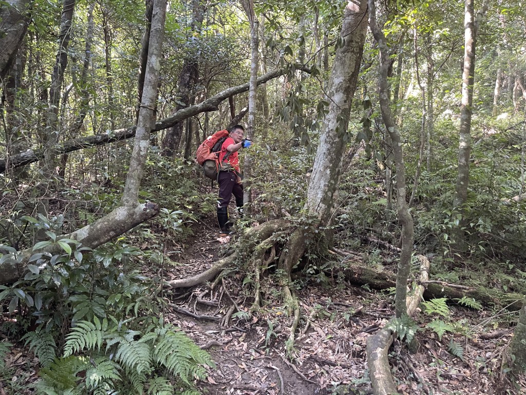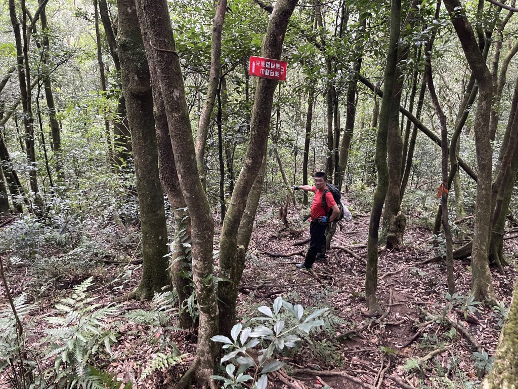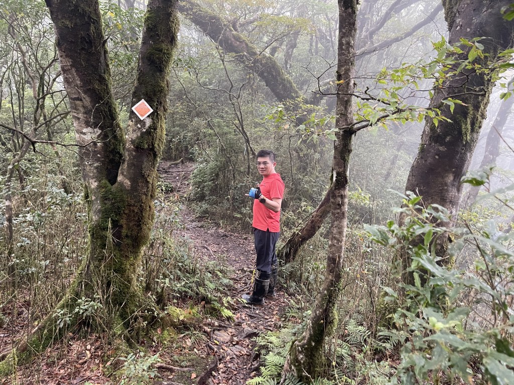 抵達北插天山時就已經接近下午2點,此時大伙也不太敢耽擱太久,回程經多崖山回到三岔路口,此時往右往樂佩山及滿月圓瀑布方向走,妙妙與采庭的速度很快,只能用呼喊的方式確定在我們的前方,嘉鴻與小宋跟隨在後,此時慢吞吞的Smile突然恢復正常,居然速度上也變得比較快了,終於甦醒了!