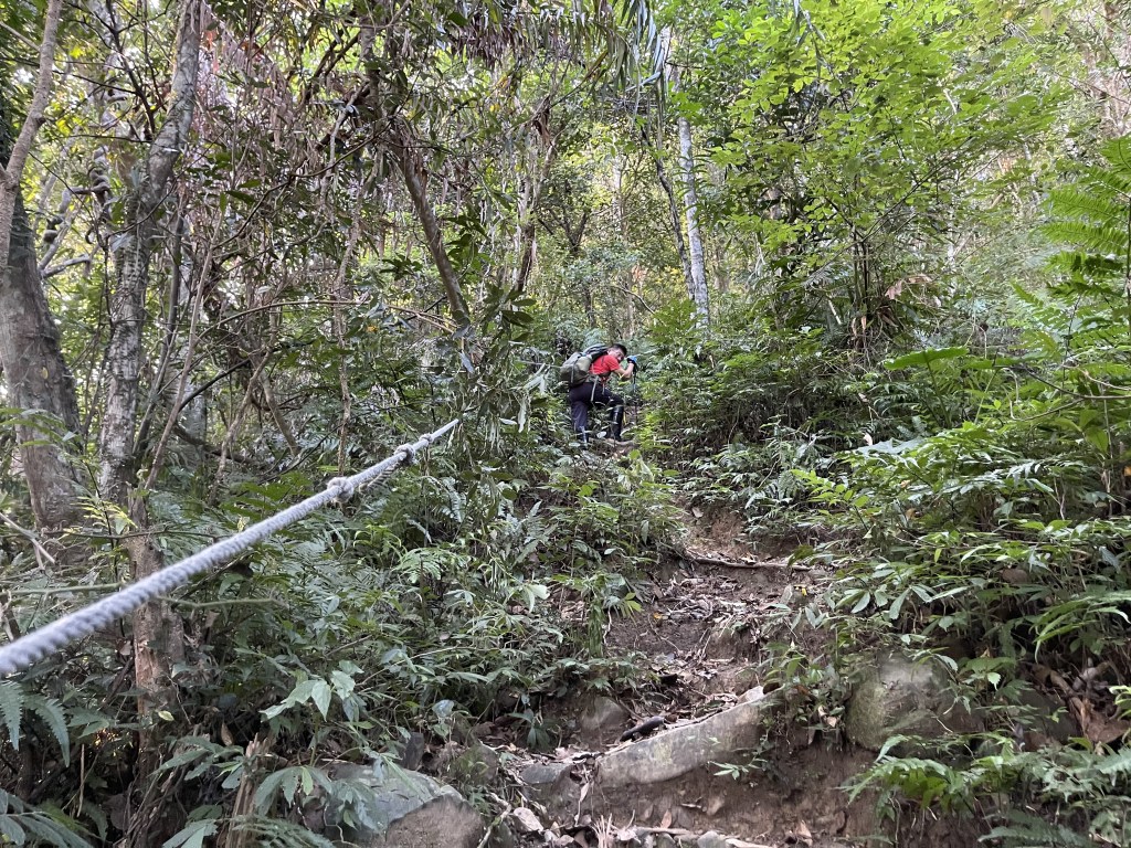 過了分遣所後,路徑持續超陡,一看到橘色的繩索出現就知道沒有在輕鬆的。通過20號後,開始進入陡峭濕滑的乾溪溝,一路到通過22號後乾溪溝才走完,也就來到三岔路口,往右上可到多崖山及北插天山,往左則是往樂佩山及滿月圓瀑布的方向。