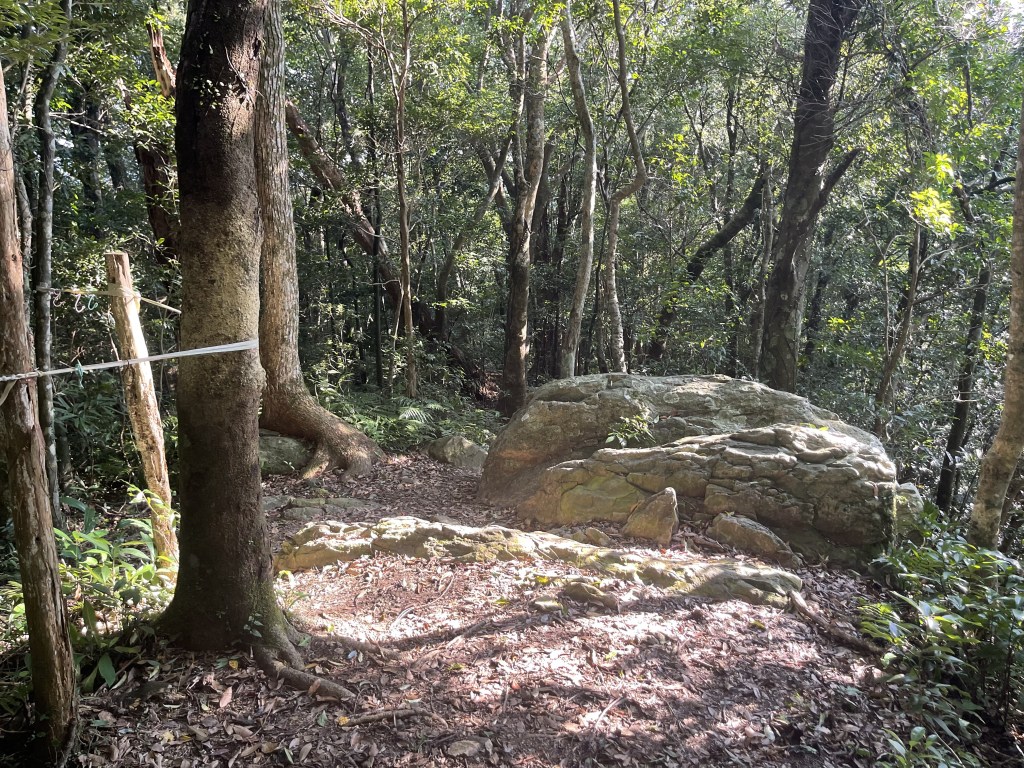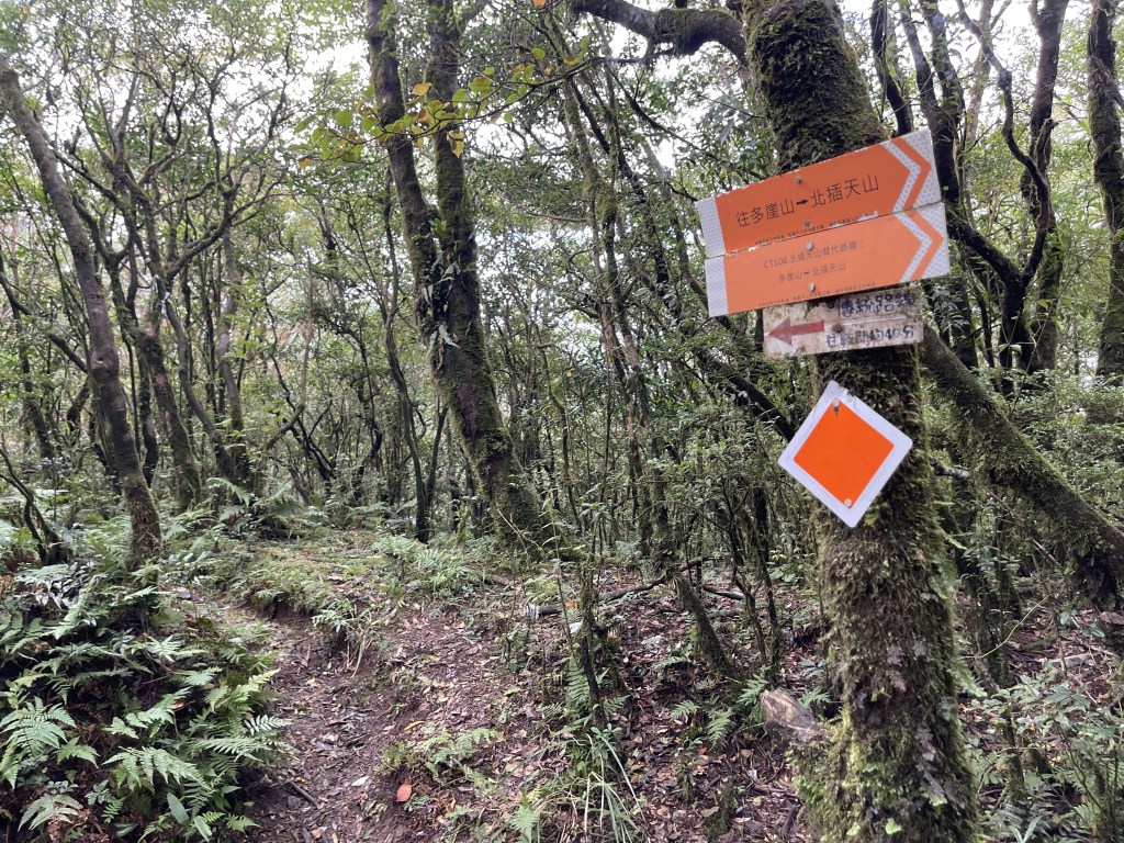 在東滿步道4.44K處,早就看不到采庭等四人,根本用飛的,可是還是得等我們啊!只是可以提早到特定點休息。Smile與我開始由4.44K處走0.9K的距離,緩緩而上且路徑平坦的來到四叉路口,這裡是往東滿步道、小烏來登山口、木屋遺址以及北插天山/多崖山的十字路口。我們選擇往左走,還要2.8K的距離經岩戶分遣所遺跡的路徑去北插天山。