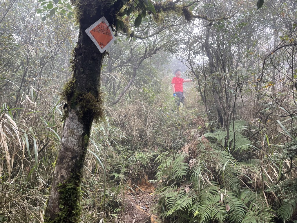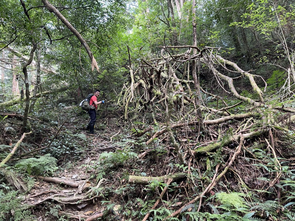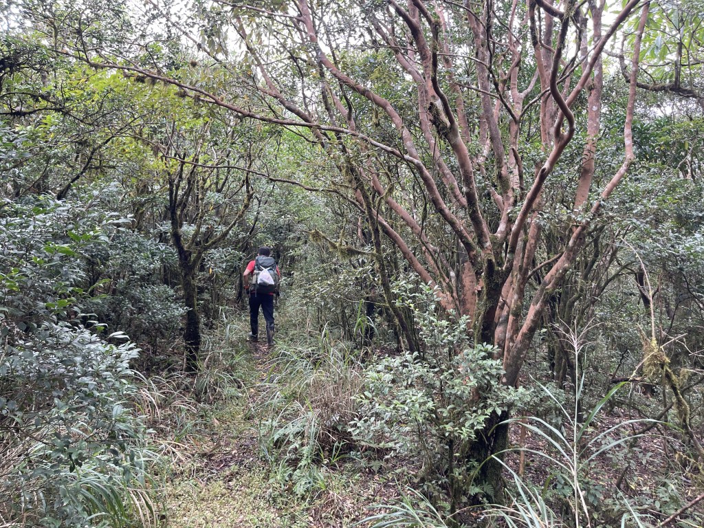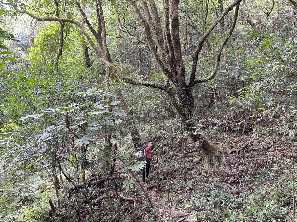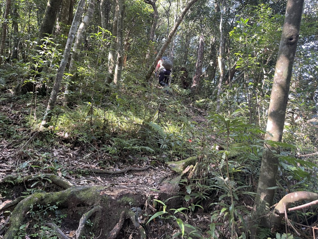 上圖:我們由鞍部繼續往前走。此時突然發現,妙妙在遠方呼喚我們?好像是由東滿步道岔的方向?原來是妙妙與采庭認為我們要走左岔,已經直接往東滿步道岔下切,下切一段後發現路線極其難走且完全沒有布條。