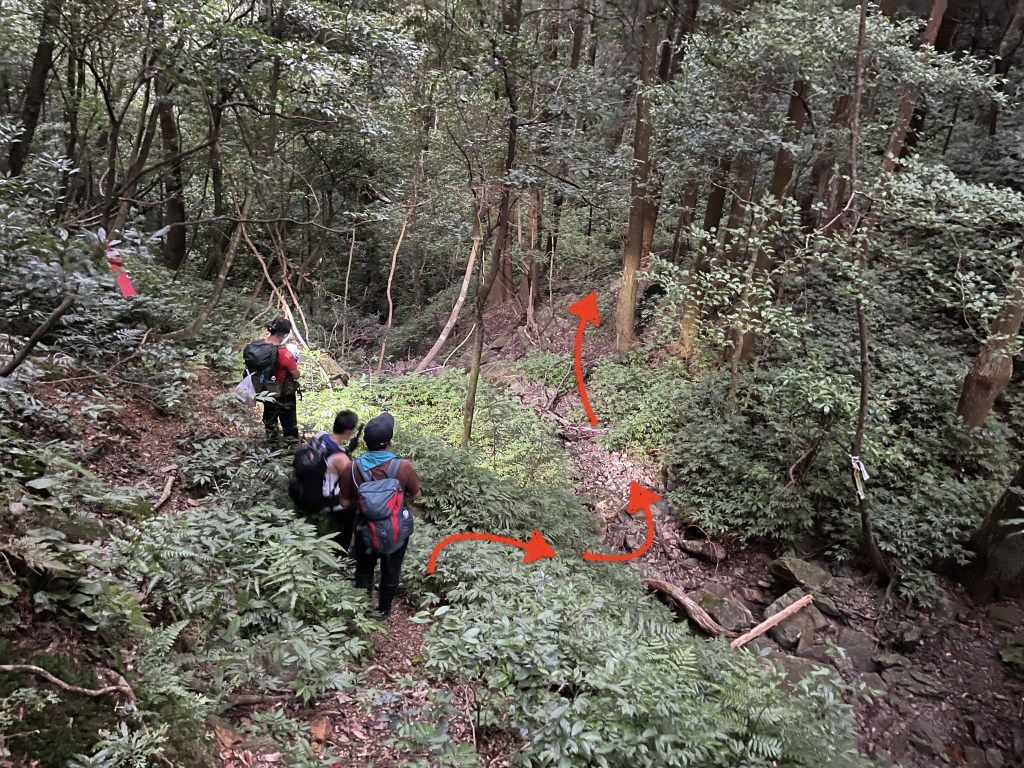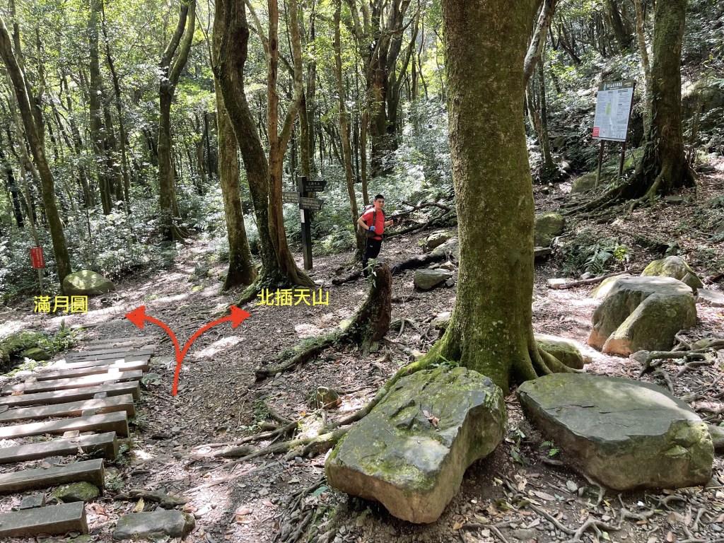 上圖:由瀑布岔右轉後直走,接著按箭頭方向走到滿月圓山岔。