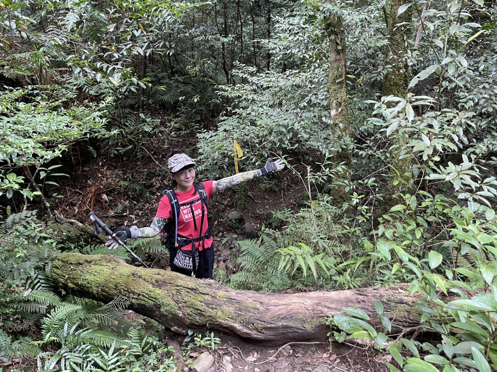 上圖:過倒木,跟Smile說,別採到有青苔的石頭或木頭。