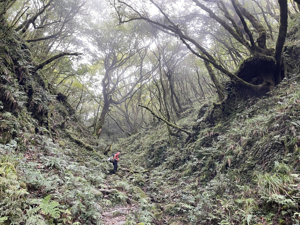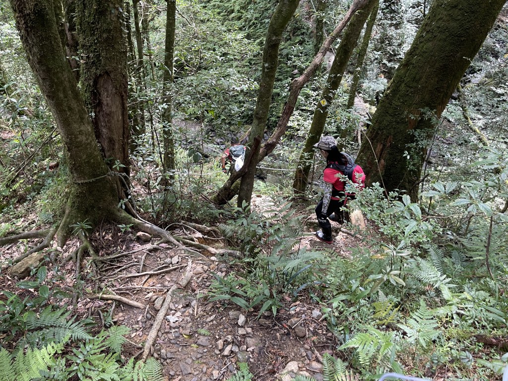 上圖:一開始陡下後,就沒有這麼好走了。從三岔路口到東滿步道岔或稱為鞍部,這段的距離只有0.9K,但我們走了快50分鐘,就知道這段路徑從陡下開始,就是難走的考驗開始。