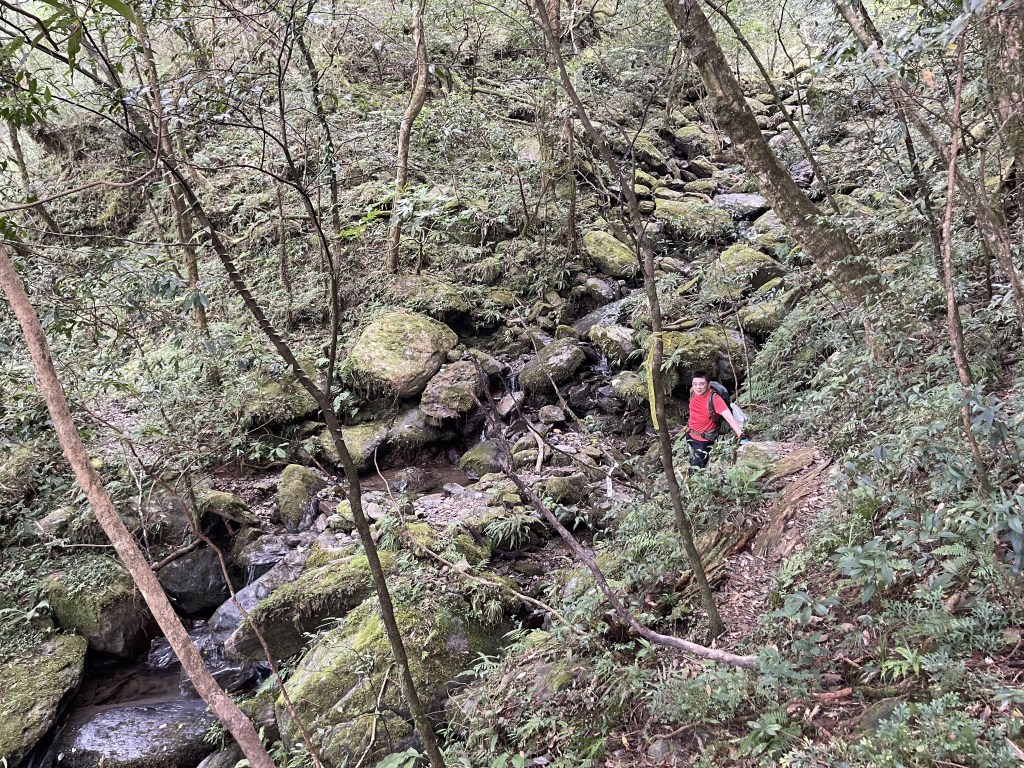 上圖:我(Gosen)在前方引路,發現又要過溪,要Smile小心,左側的溪流一下子就陡下,不要太靠近左側。