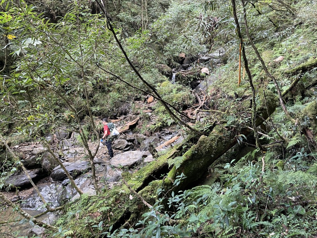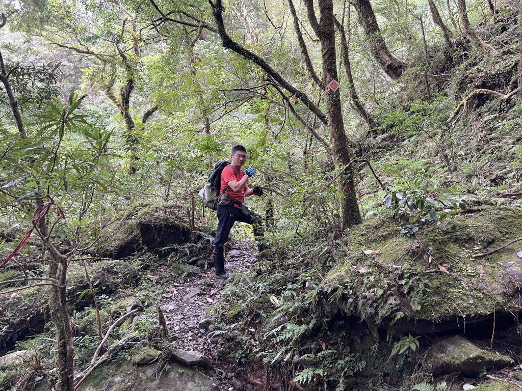 進入岩戶分遣所路線的最後2.8K路徑,一開始的路徑都是優美好走路徑,過02編號後就要過第一段的過溪,此時看到我們的前導部隊四位正在過濾清澈溪水,這時,妙妙又開始提前出發,我也催促又要拍照又比較慢的Smile先行。岩戶分遣所路線的2.8K過程中,必須要過溪五次,會看到兩棵大神木,亦會經過18號後的大門牙及岩戶分遣所,以及由20號到22號之間的大乾溪溝,並要由海拔H1219m陡上到海拔H1727m。