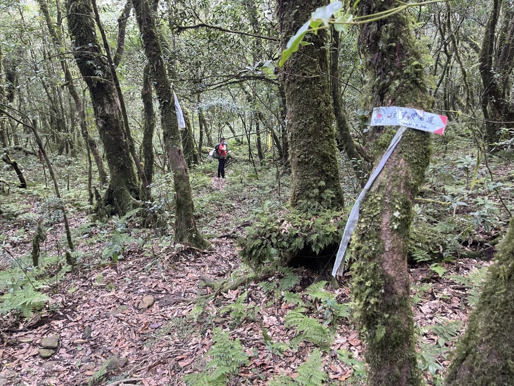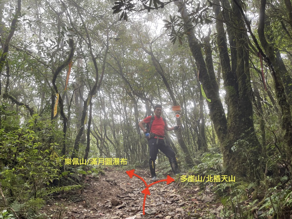 但以離線地圖來看,必須往樂佩山的方向走,在樂佩山岔再左轉往滿月圓瀑布方向走才是比較短的距離,因此嘉鴻、小宋、Smile與我(Gosen)開始往樂佩山方向走,我們四人也一直以為妙妙與采庭也是往樂佩山方向,沒有想到才走了幾步,就聽到妙妙在呼喚我們的聲音!不對啊!這聲音是由左岔方向傳來,嚇得大伙一跳,差一點分成兩隊進行不同路線,此時妙妙與采庭回到鞍部,也說明她們往左岔走,發現路徑超急陡下且一段後就看不到布條了!