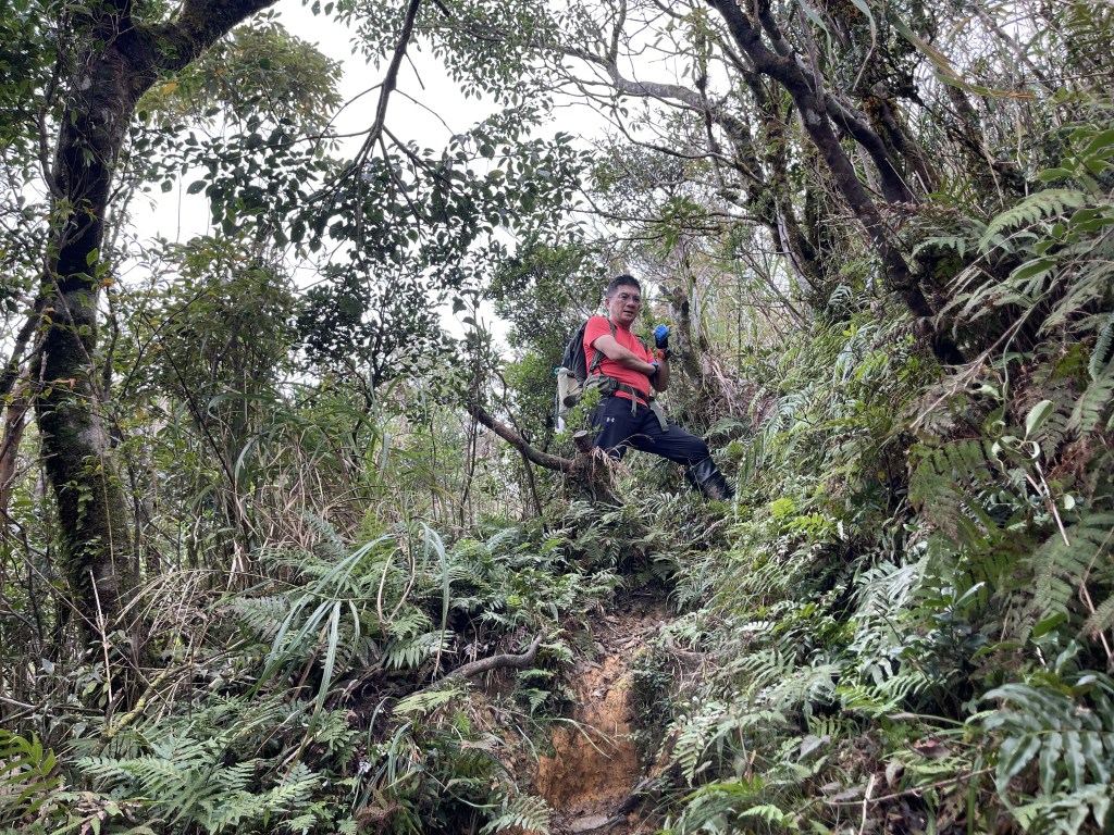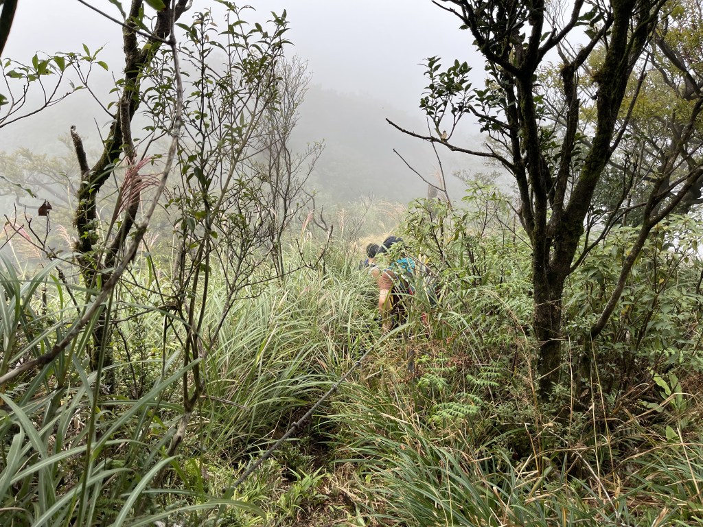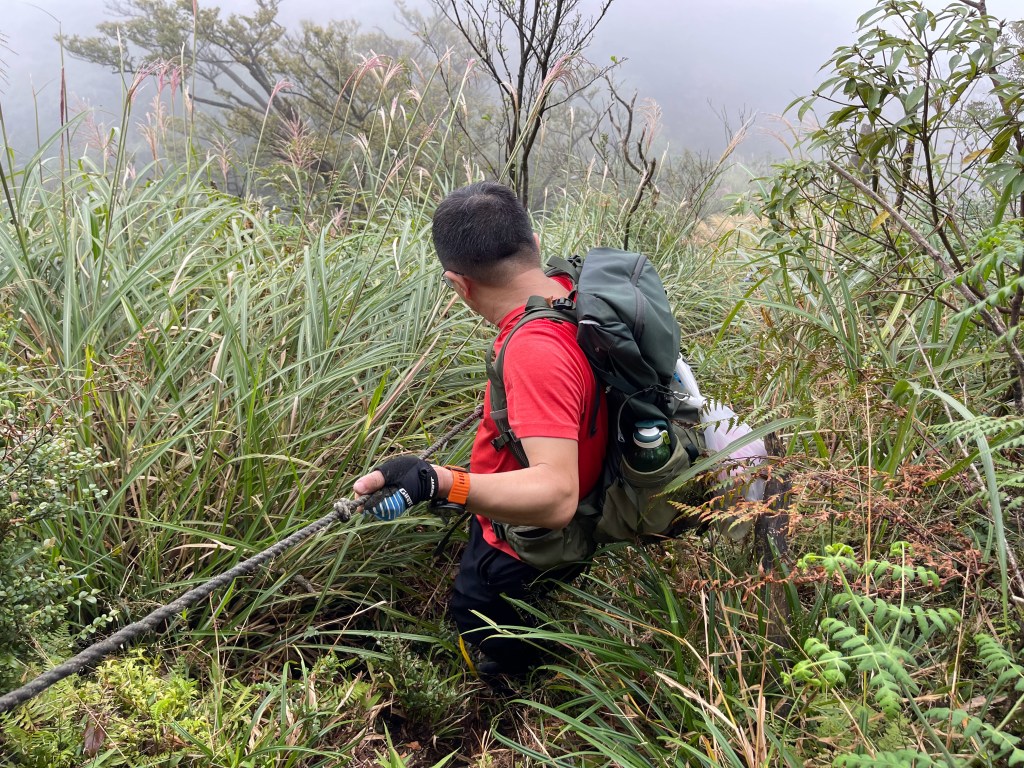 上圖:我(Gosen)正在陡下芒草區,這一段芒草區,前段有繩索,後段無繩索,要記得撥開芒草看一下底下的路徑才走。