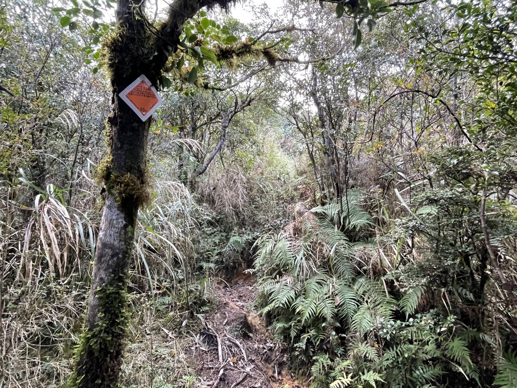 過了芒草區後,再稍微的陡上一段,就來到了樂佩山岔,在這個三岔路上有往樂佩山的路牌,我們就直接左轉開始往下走,一左轉就發現路跡清晰且布條清楚,心中暫時穩定不少,但這時已經是下午四點半,離天黑不到一個半小時可走。