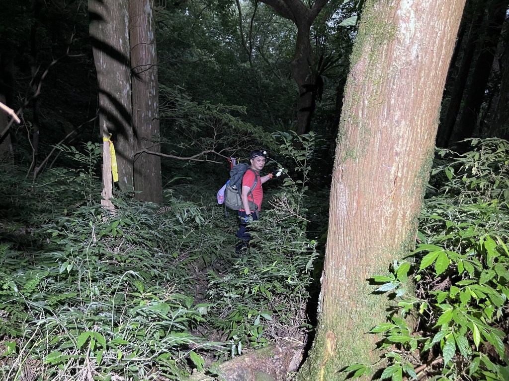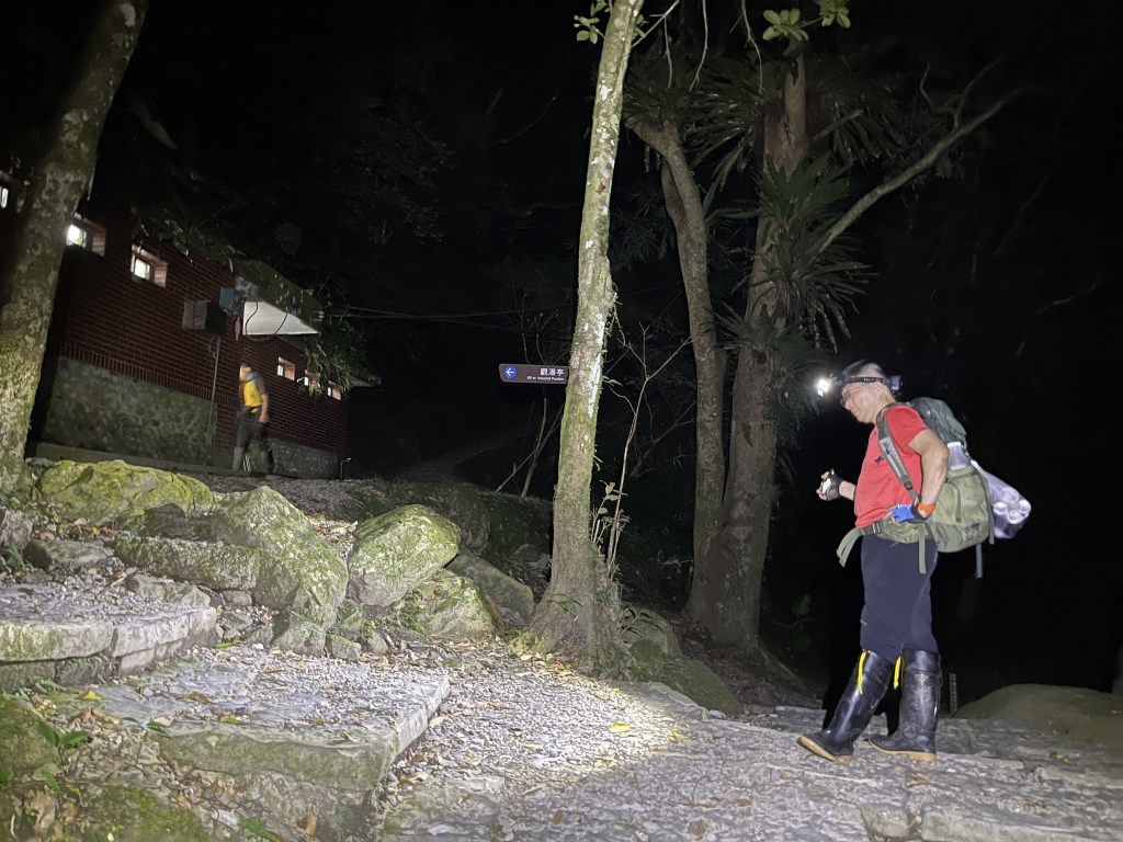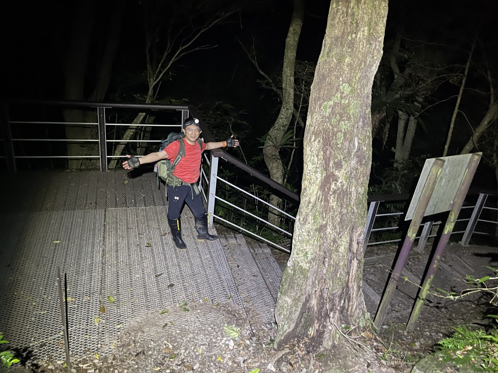 由瀑布岔下走接到瀑布步道0.4K處,大約有1.4K的距離,此時由我(Gosen)在前方帶路,Smile跟著,讓小宋走第三,嘉鴻殿後。但我與Smile走沒一、二分鐘,就會發現小宋並沒有跟住?因為這一段路上的邊坡不少,小宋走起來有些遲疑,而嘉鴻就會示範步伐,因此我們四人就一路摸黑走走停停,當然,也怕小宋再度滑倒或摔到邊坡,這時情願慢也不要出狀況。今天,起登一路等Smile,回程一路等小宋!哈哈!也是難忘的經驗!