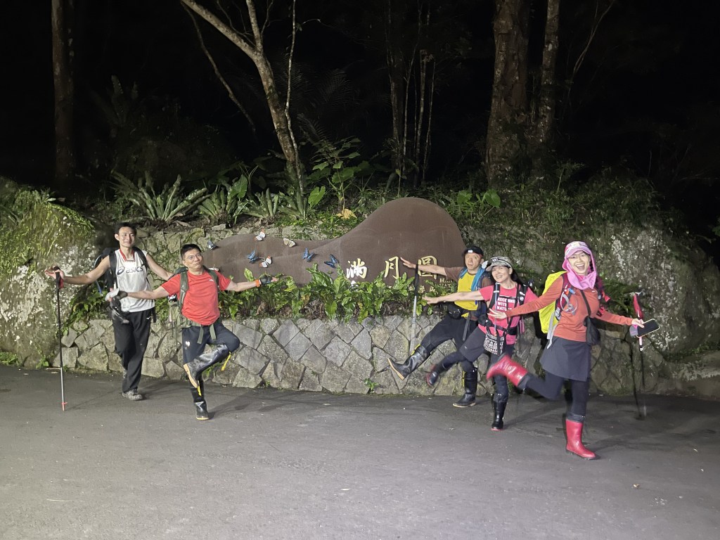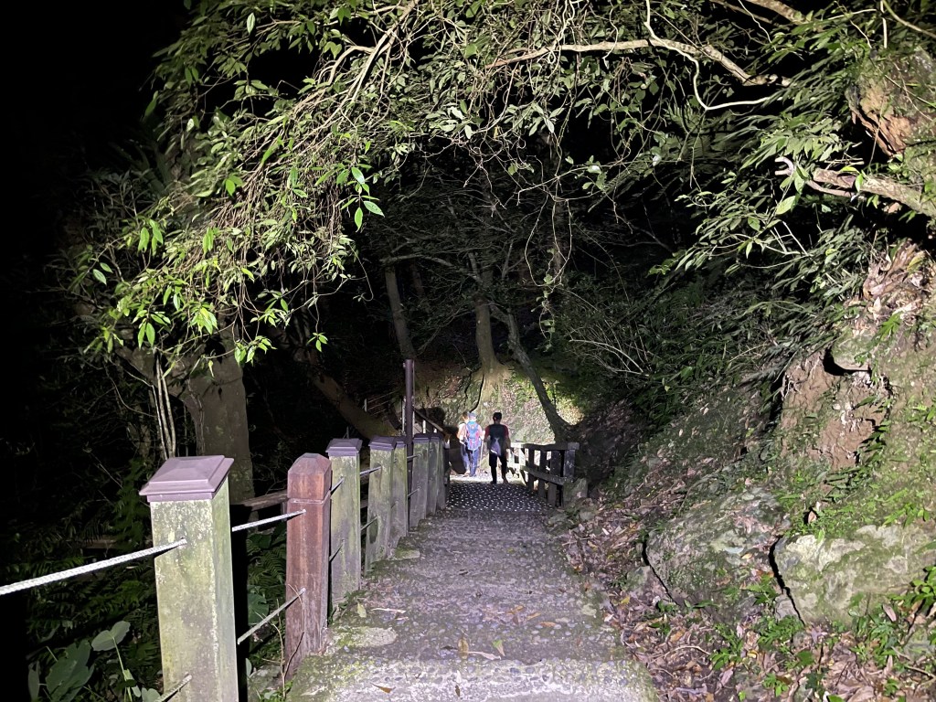 這一段路徑上,必須要過一次溪,當過了溪後不久,就看到滿月圓的警告告示牌,也就表示我們要進入滿月圓園區內了。約在下午7點20分接上瀑布步道0.4K處,接著的路徑都是人工路徑,再走2.5K可以回到停車場。在要抵達滿月圓收費亭前的涼亭,看到了妙妙與采庭,她們兩人約在晚間7點就回到收費亭這裡,接著大伙就在此如廁一番,出了收費亭再走300m回到停車場,完成了今天的挑戰。