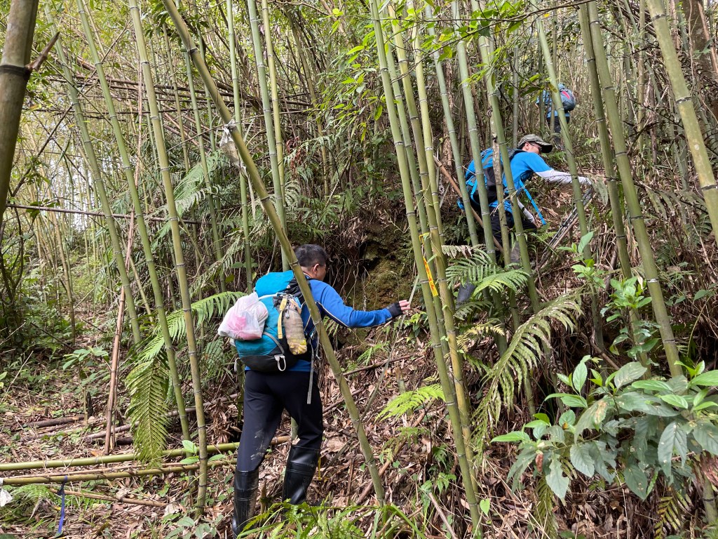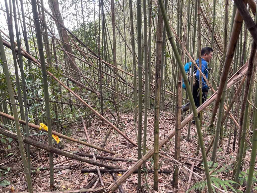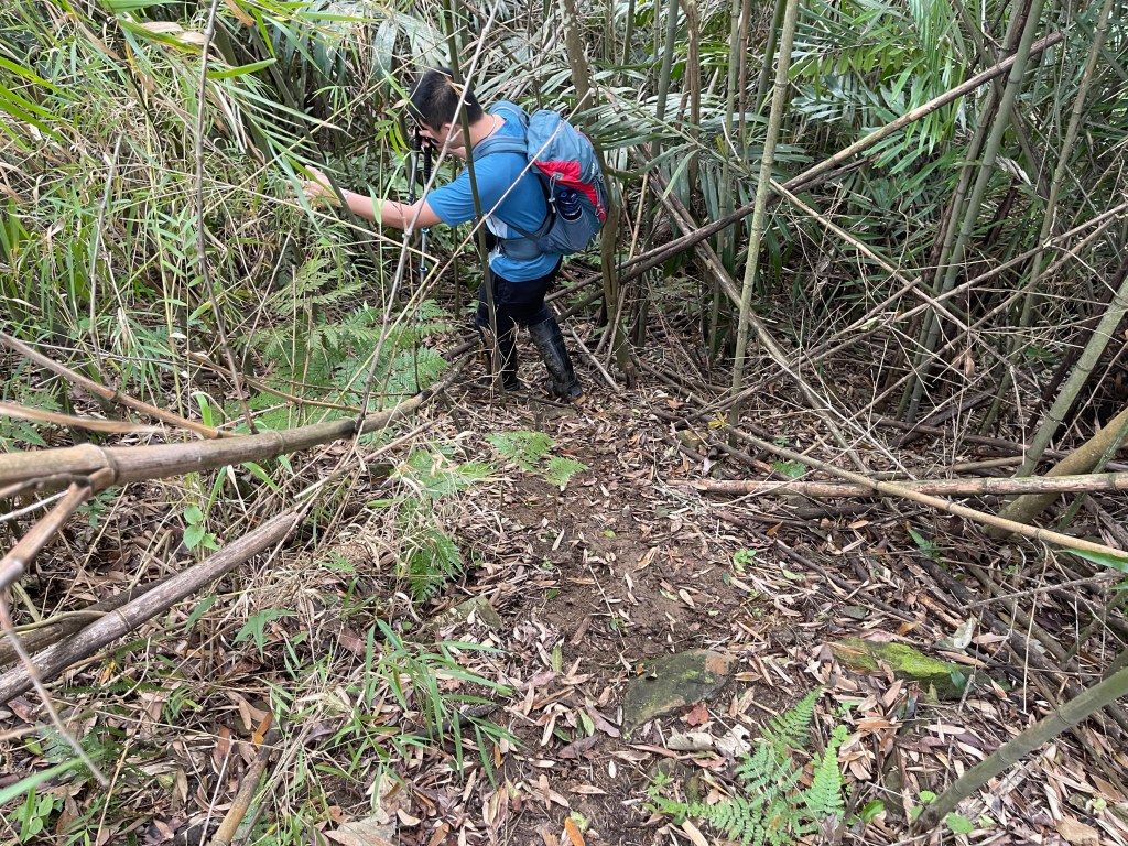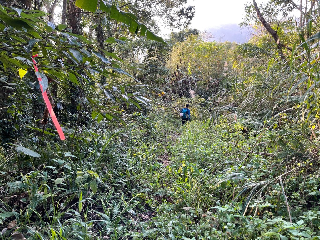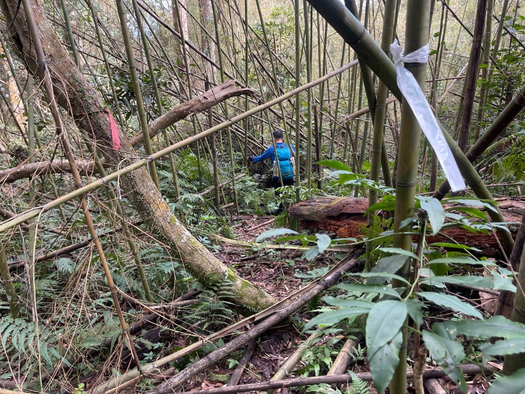 (2)過了巴卡山後,會先經過一段非常凌亂的竹林,原來的路徑布條已經不太清楚,因此,我們遵循GPS的方向,在原路徑平行的右側約10m,另外沿路綁了幾條布條,也許可以幫到朋友們。陡上距離100m的竹林後,接著馬上要穿越距離100m的芒草區,原以為這一段芒草區可能要耗很多時間,沒有想到路徑算是清楚的,過了芒草區就到達今天的最高點847峰,接著就要注意開始往右下切走,記得!別一直繼續沿著看起來好走的稜線走喔!
