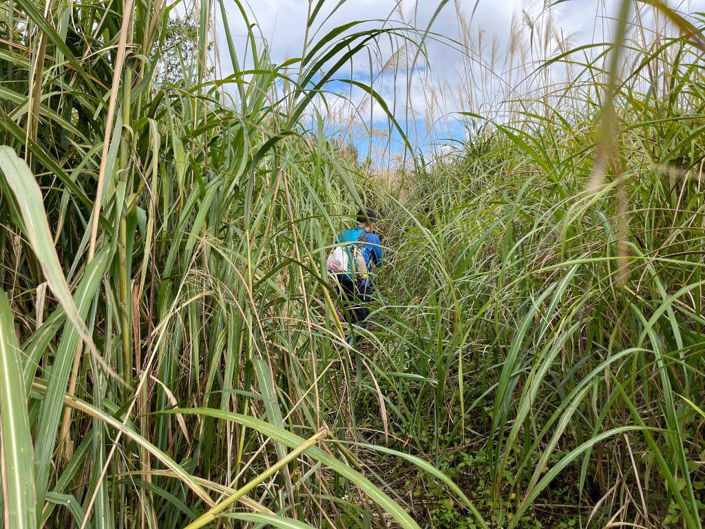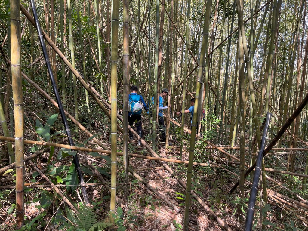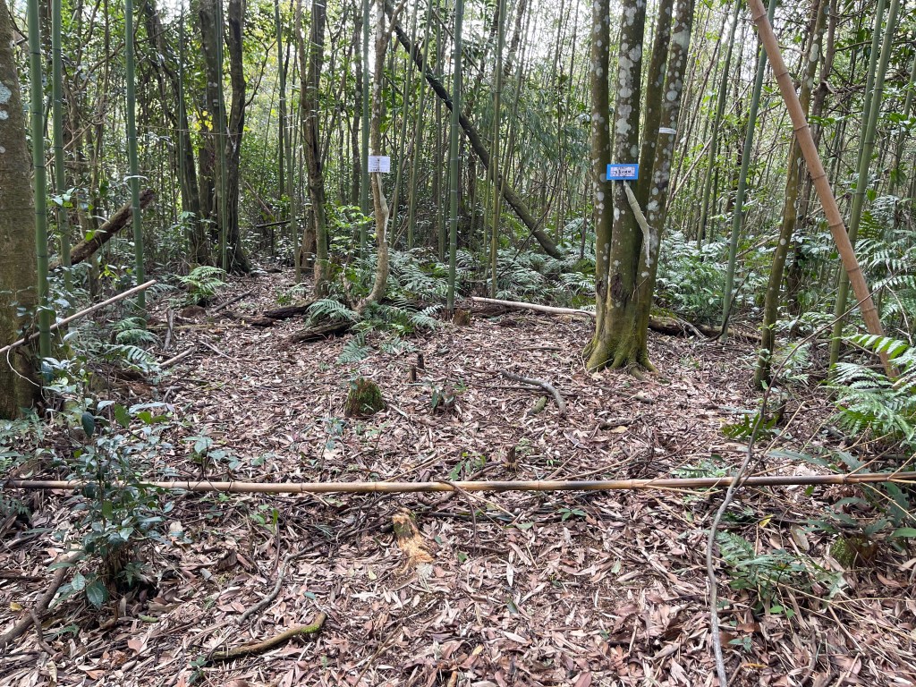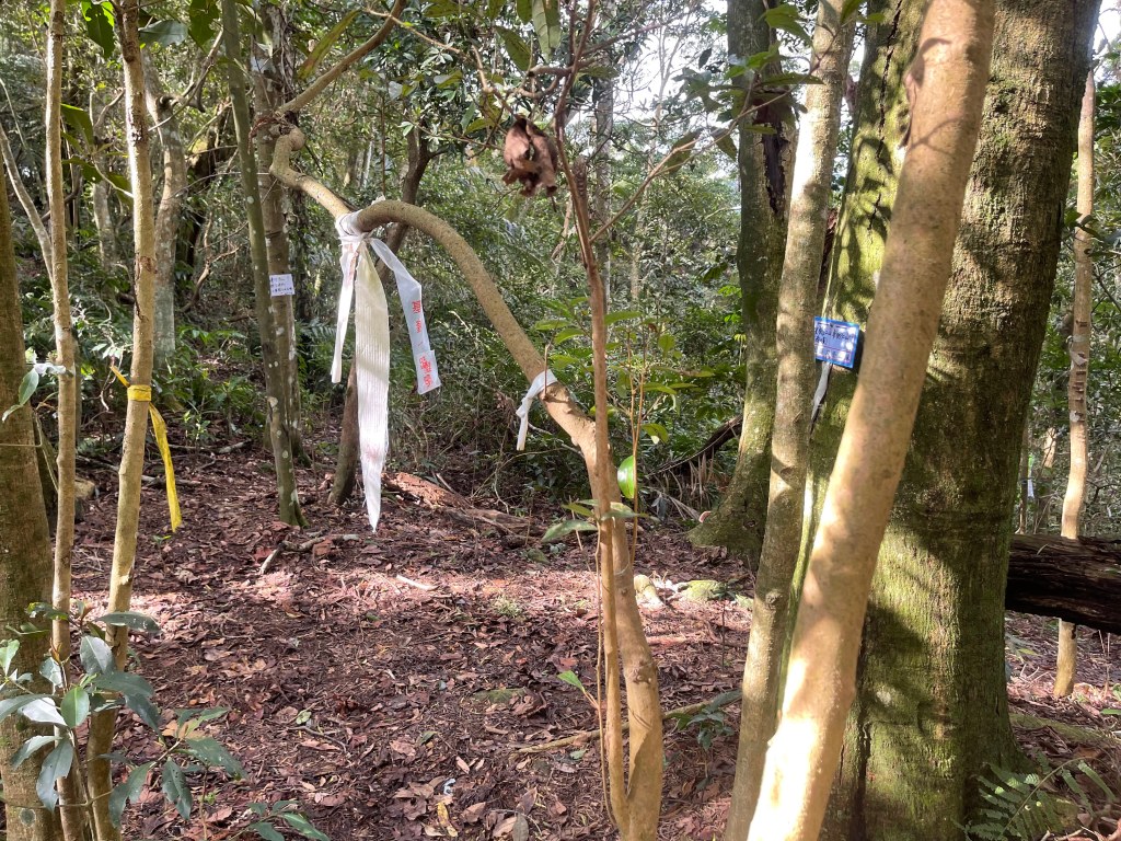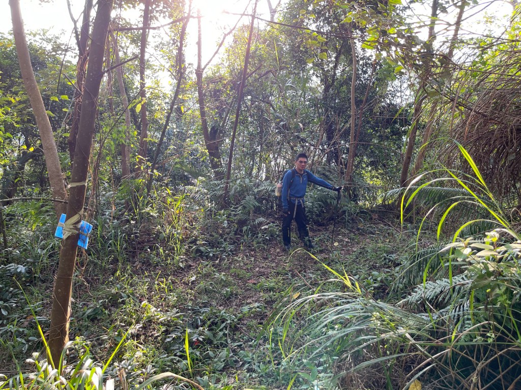 (2)過了巴卡山後,會先經過一段非常凌亂的竹林,原來的路徑布條已經不太清楚,因此,我們遵循GPS的方向,在原路徑平行的右側約10m,另外沿路綁了幾條布條,也許可以幫到朋友們。陡上距離100m的竹林後,接著馬上要穿越距離100m的芒草區,原以為這一段芒草區可能要耗很多時間,沒有想到路徑算是清楚的,過了芒草區就到達今天的最高點847峰,接著就要注意開始往右下切走,記得!別一直繼續沿著看起來好走的稜線走喔!