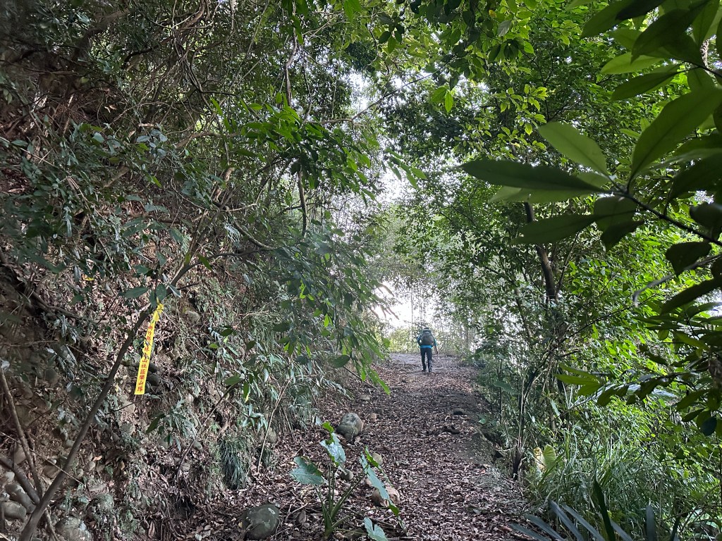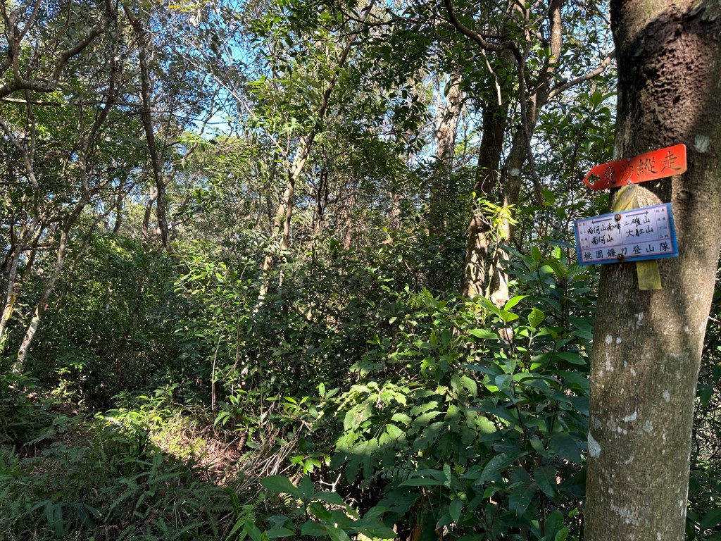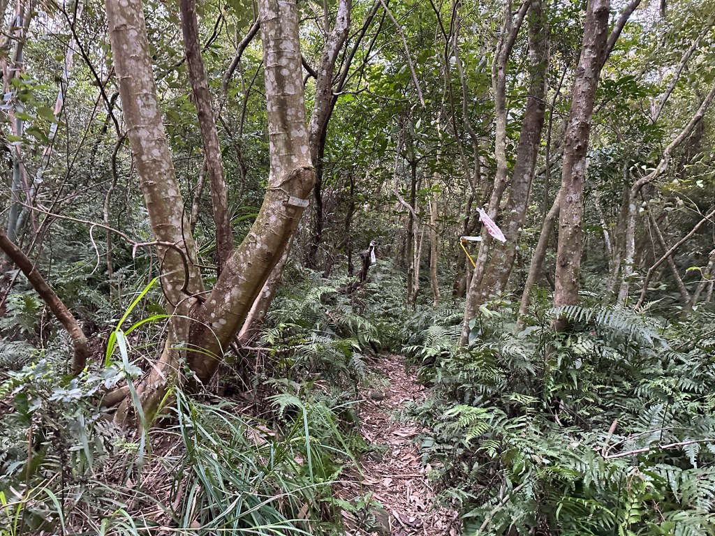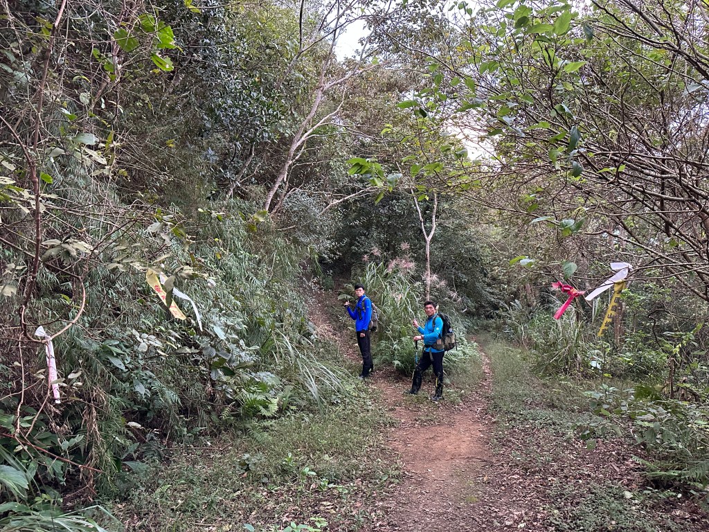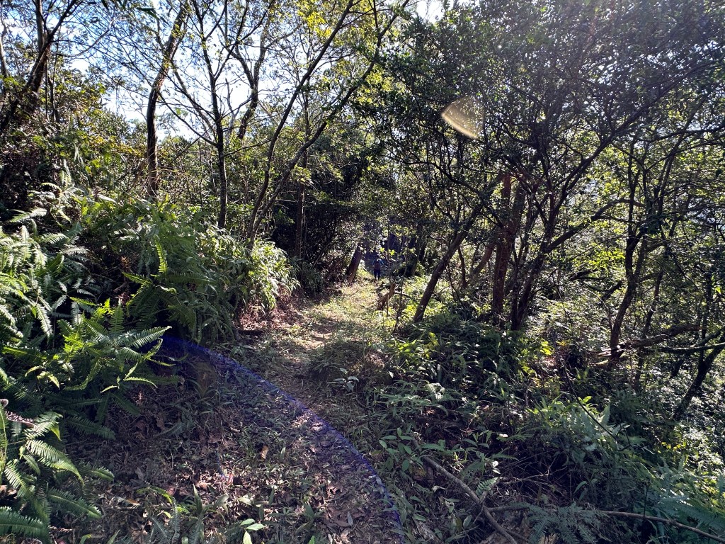 由土地公廟往茄苳窩山之間的一路陡上路徑,除著小部份路徑陡滑外,路跡都算得上清楚,上了稜線後的後段路徑都是緩緩而上,變得相對好走很多。抵達第三峰:茄苳窩山,再往前走300m,經過右側山谷為私人土地後即抵達今天的第四峰:小尾山,小尾山這沒有三角點?所以,我(Gosen)只好拿出手機的跑馬燈來當作是三角點的名牌。