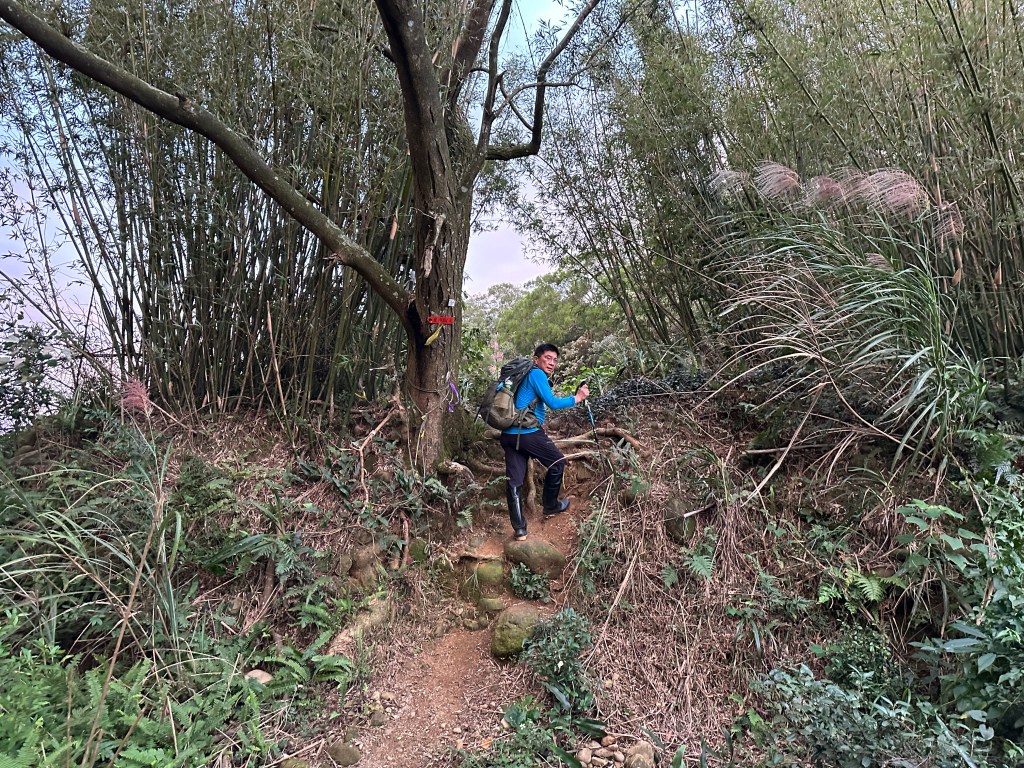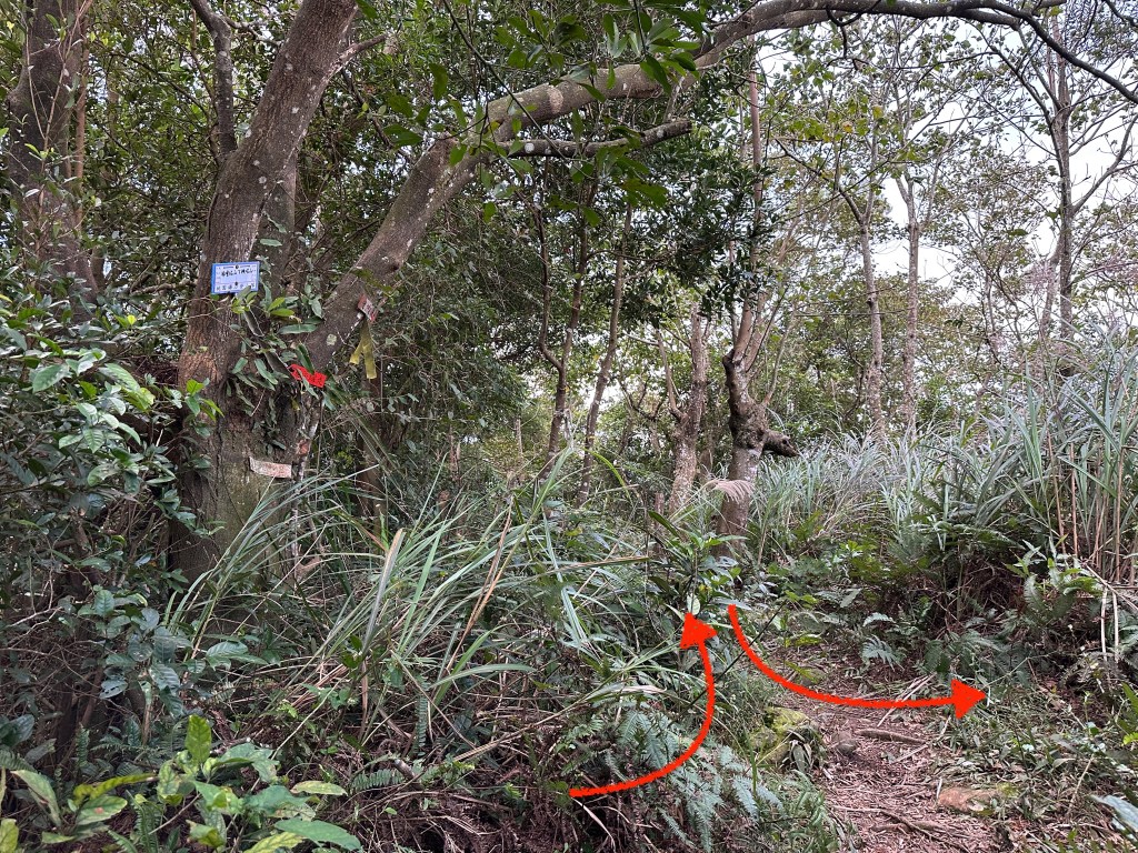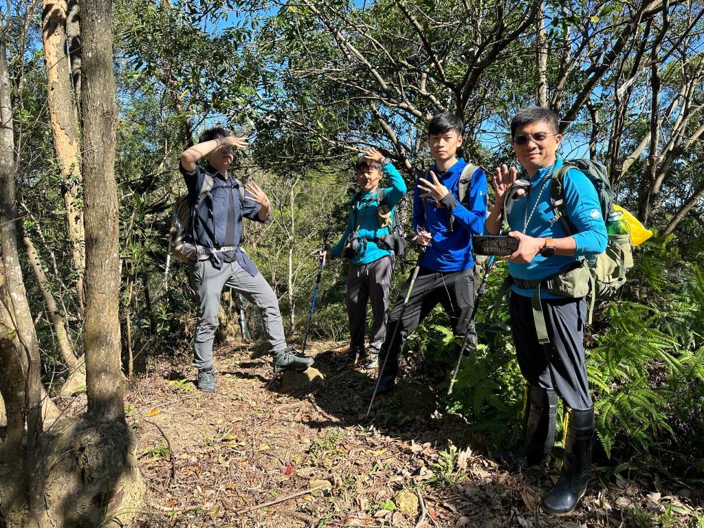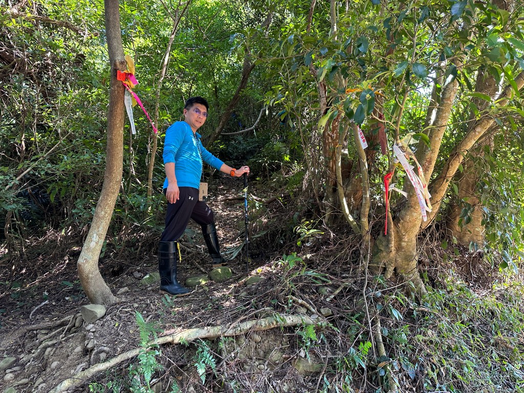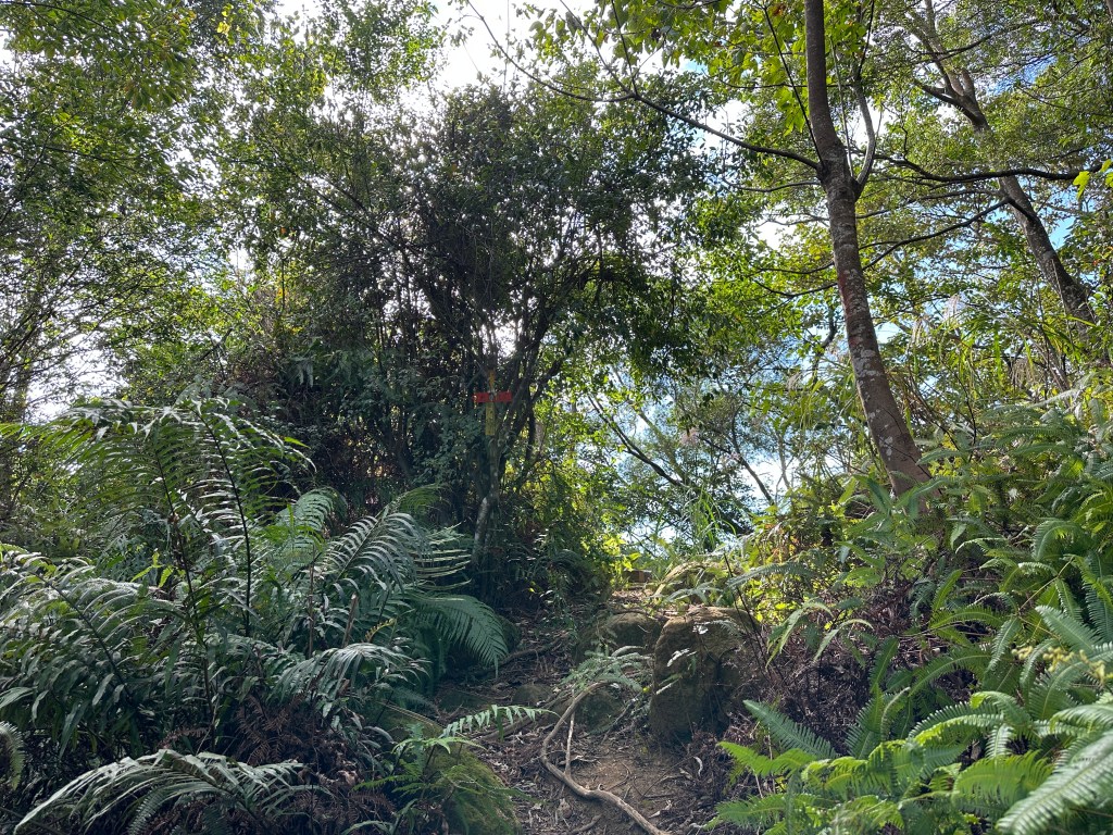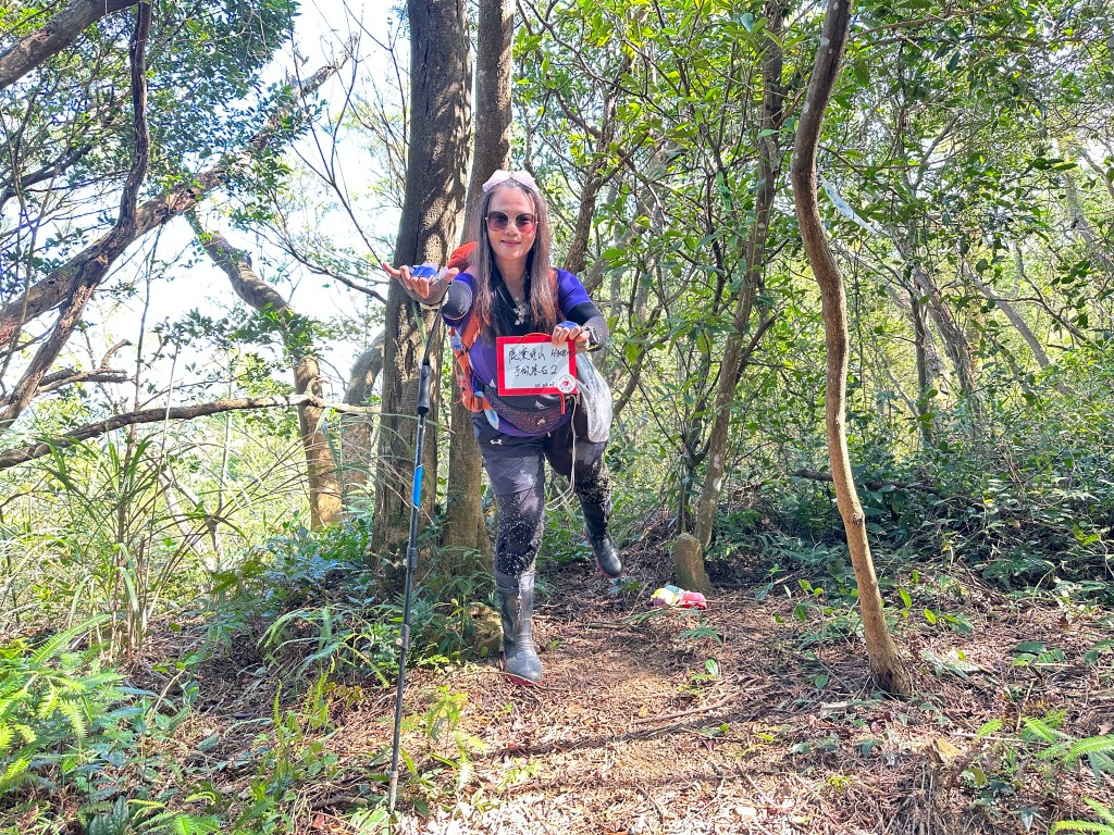 由土地公廟往茄苳窩山之間的一路陡上路徑,除著小部份路徑陡滑外,路跡都算得上清楚,上了稜線後的後段路徑都是緩緩而上,變得相對好走很多。抵達第三峰:茄苳窩山,再往前走300m,經過右側山谷為私人土地後即抵達今天的第四峰:小尾山,小尾山這沒有三角點?所以,我(Gosen)只好拿出手機的跑馬燈來當作是三角點的名牌。