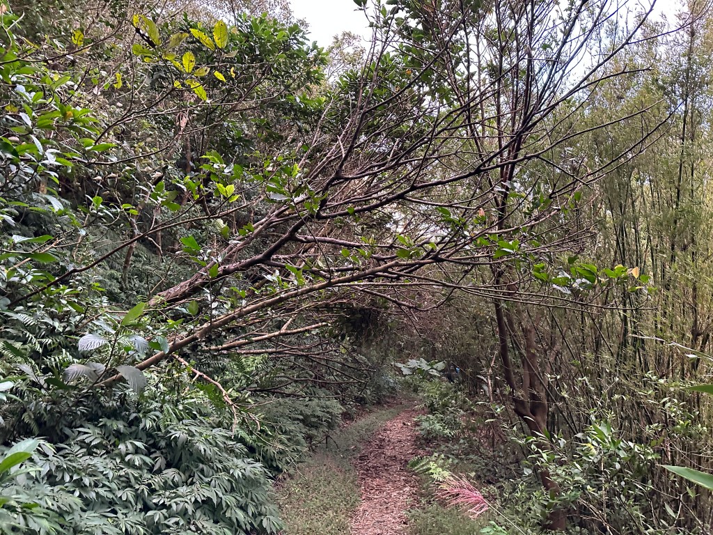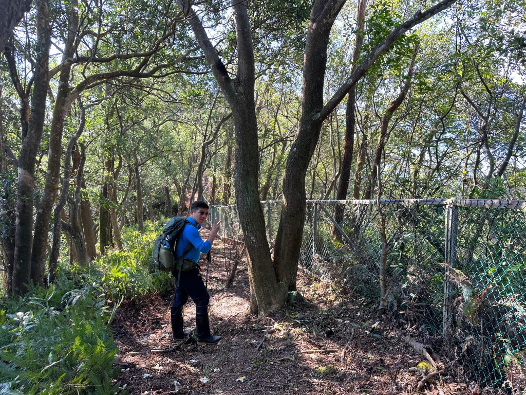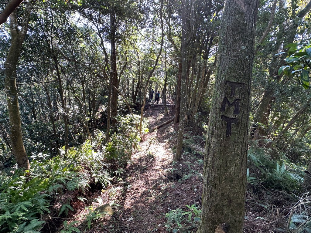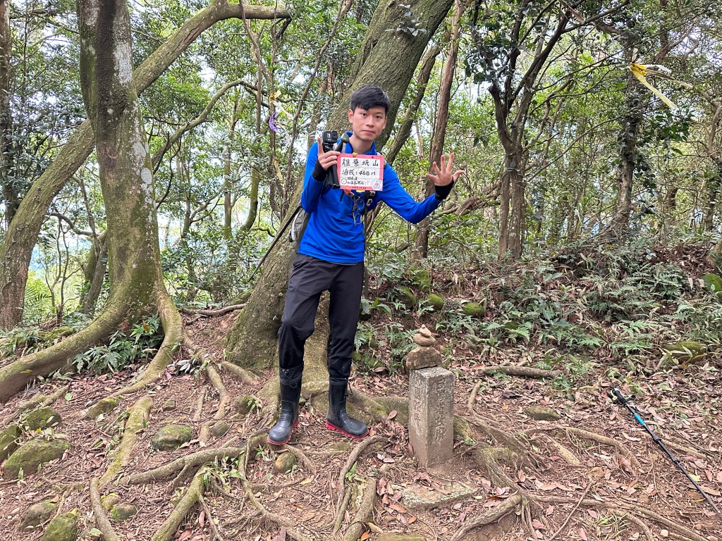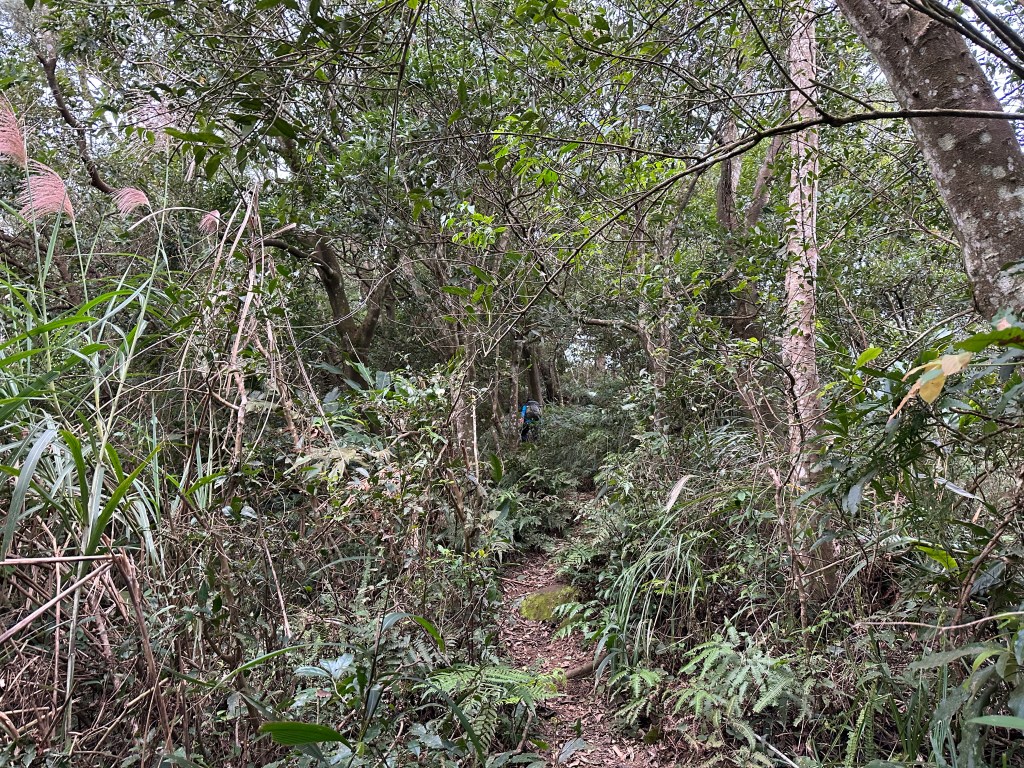 由土地公廟往茄苳窩山之間的一路陡上路徑,除著小部份路徑陡滑外,路跡都算得上清楚,上了稜線後的後段路徑都是緩緩而上,變得相對好走很多。抵達第三峰:茄苳窩山,再往前走300m,經過右側山谷為私人土地後即抵達今天的第四峰:小尾山,小尾山這沒有三角點?所以,我(Gosen)只好拿出手機的跑馬燈來當作是三角點的名牌。