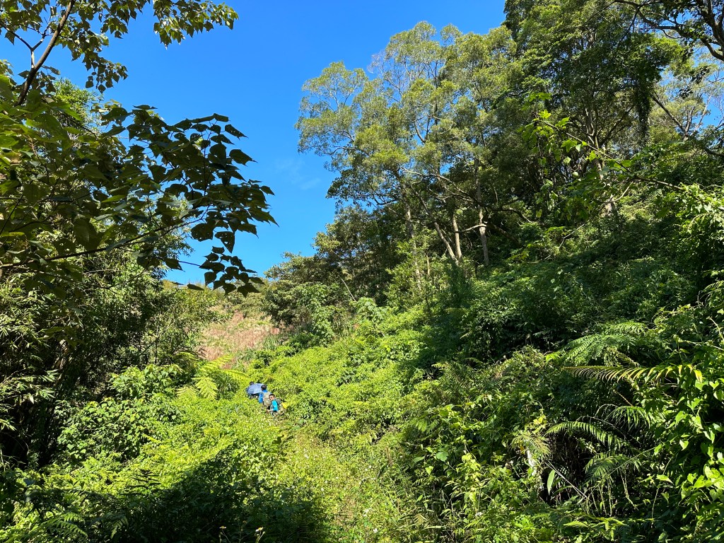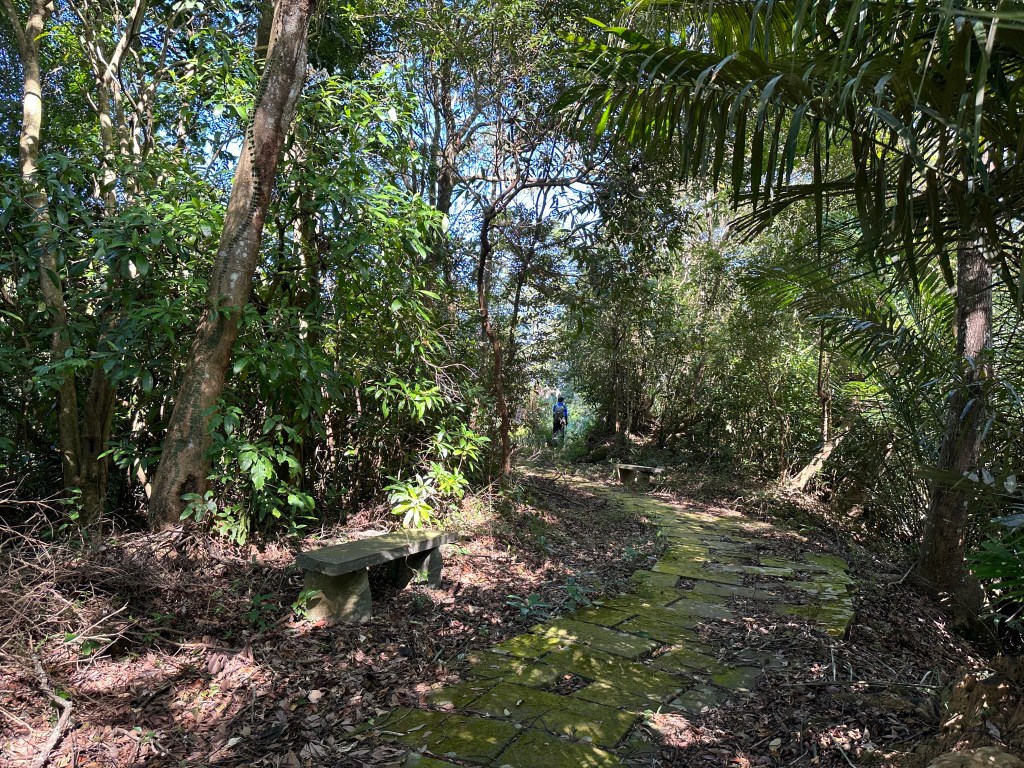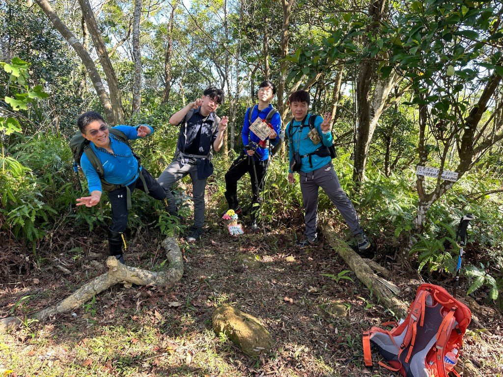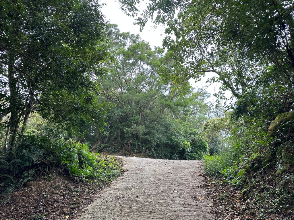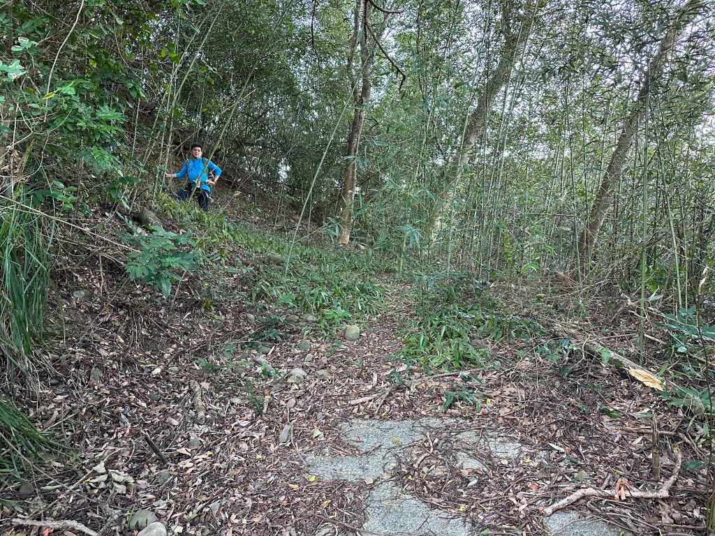 離開小尾山,沿著好走路徑走2.3K的柏油產業道路一路陡下,經過歷史古蹟湧聯橋,接上五和街走到牛欄滄公車站後左轉進入產業道路,緩上繼續走1.5K進入第五峰:龍眼園窩山。原路折回,繼續沿著產業道路走800m後右轉,開始陡上,此時陡上的產業道路上出現了右岔的階梯,其實應該繼續往產業道路走即可走上到第六峰:鹿寮坑山,看這個階梯看起來就像是捷徑路,一伙人就直接往右岔階梯來上,結果發現路徑底是宋七力顯相園,但鹿寮坑山在顯相園後方山坡的上方,唉!真是偷雞不著蝕把米,只好直接往蠻陡的山坡陡攻而上抵達。