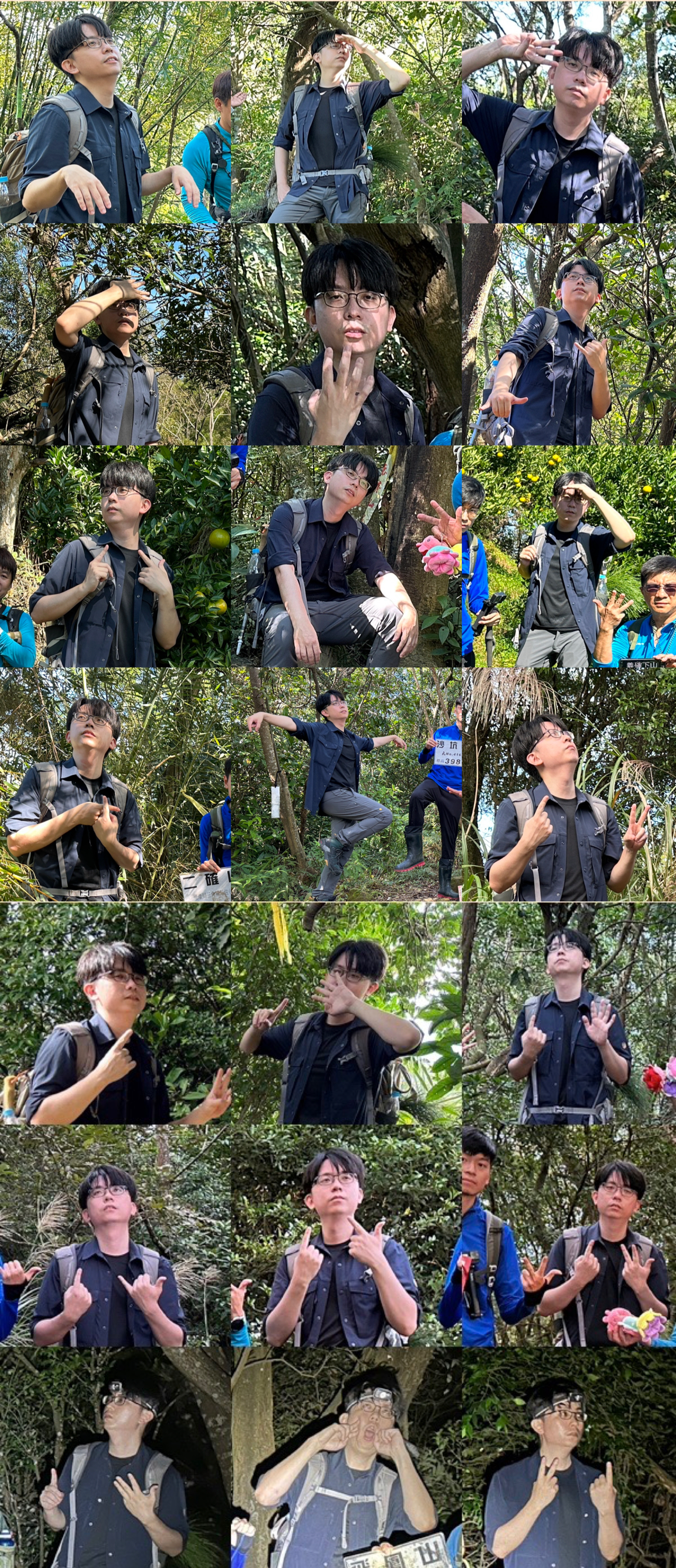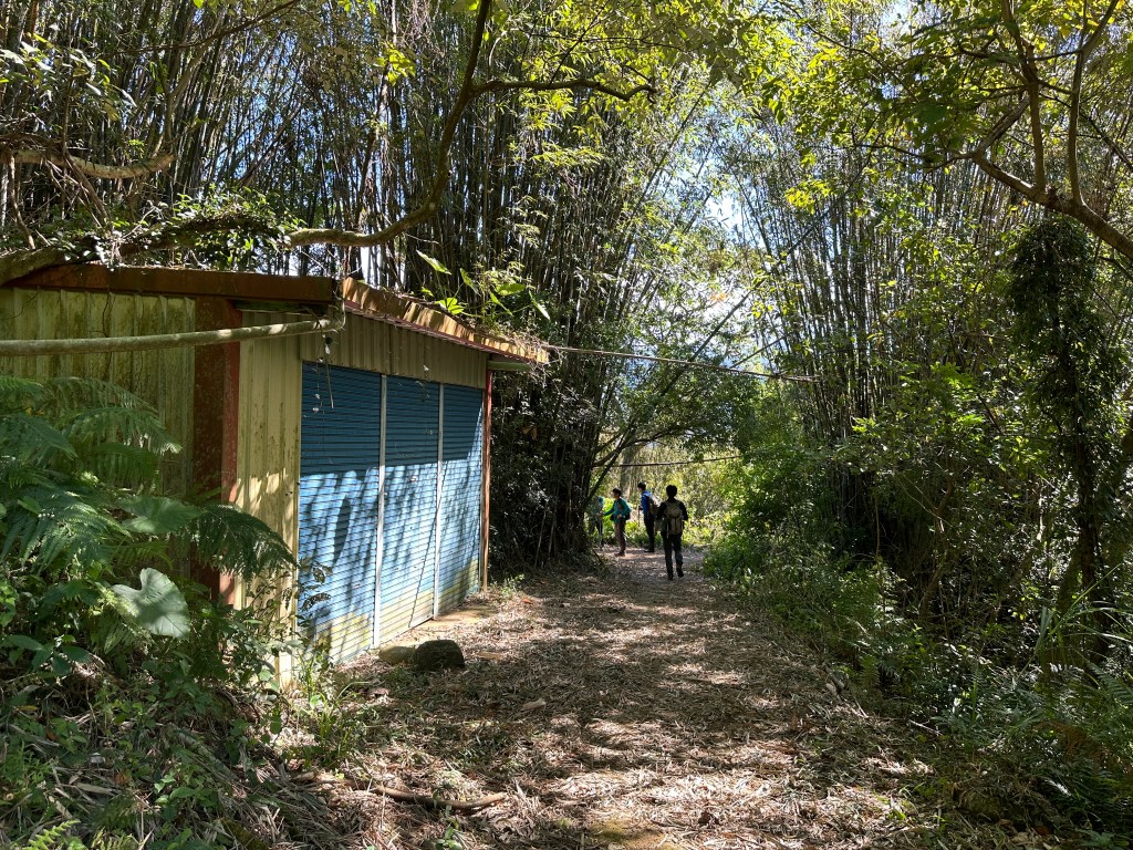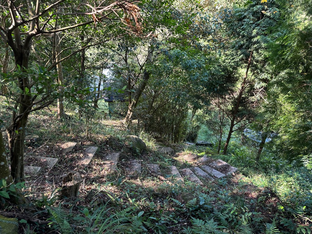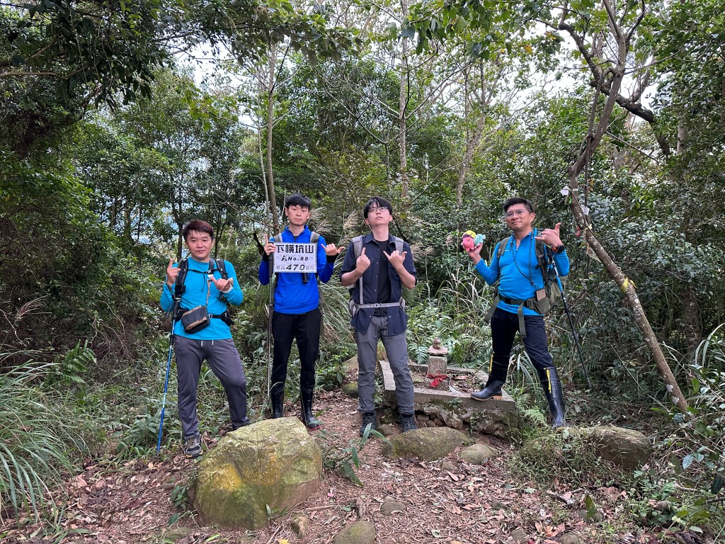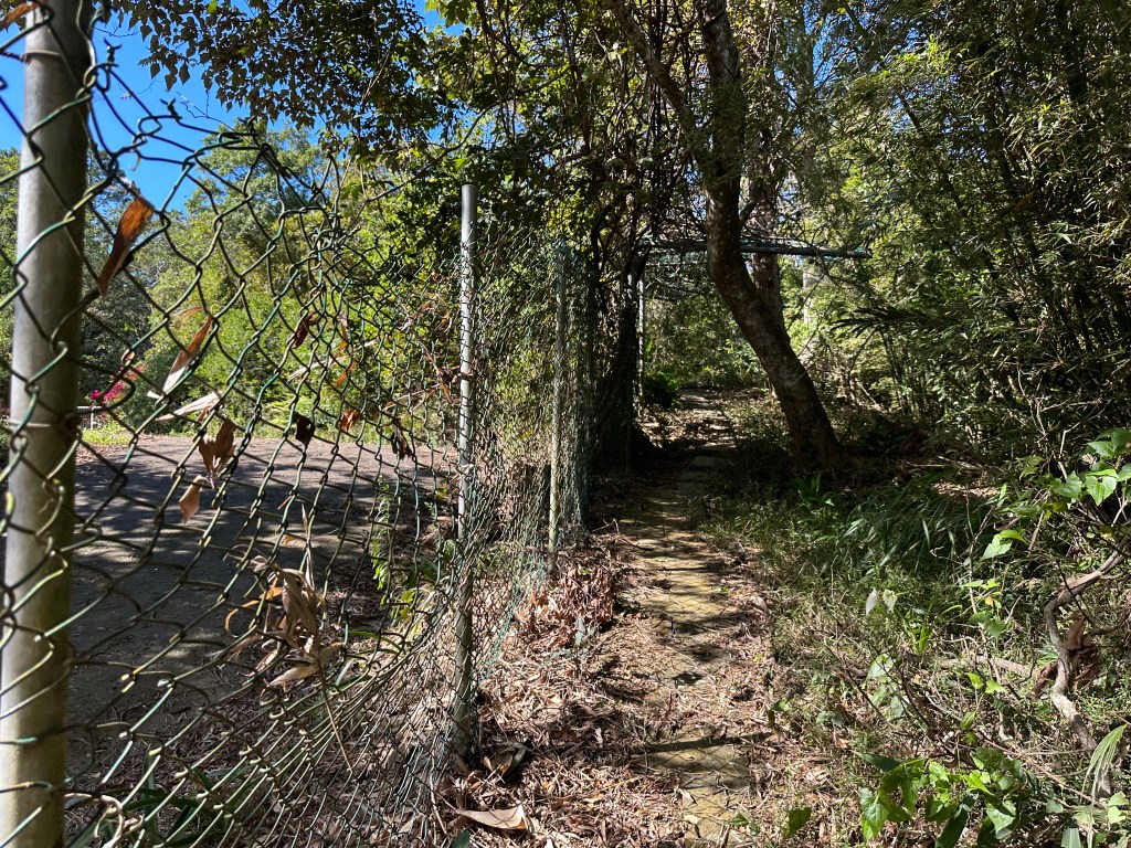 離開小尾山,沿著好走路徑走2.3K的柏油產業道路一路陡下,經過歷史古蹟湧聯橋,接上五和街走到牛欄滄公車站後左轉進入產業道路,緩上繼續走1.5K進入第五峰:龍眼園窩山。原路折回,繼續沿著產業道路走800m後右轉,開始陡上,此時陡上的產業道路上出現了右岔的階梯,其實應該繼續往產業道路走即可走上到第六峰:鹿寮坑山,看這個階梯看起來就像是捷徑路,一伙人就直接往右岔階梯來上,結果發現路徑底是宋七力顯相園,但鹿寮坑山在顯相園後方山坡的上方,唉!真是偷雞不著蝕把米,只好直接往蠻陡的山坡陡攻而上抵達。