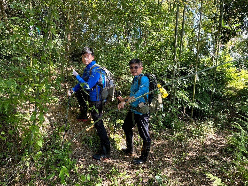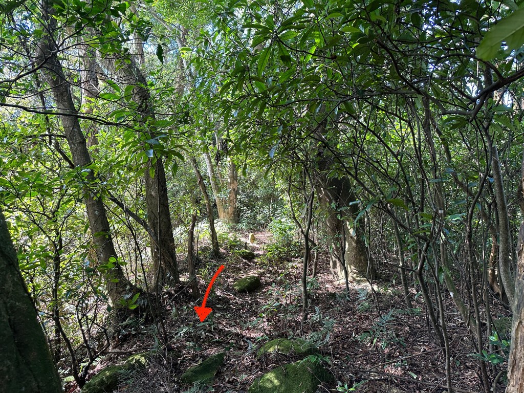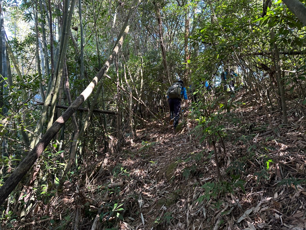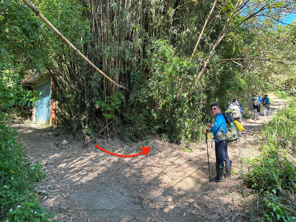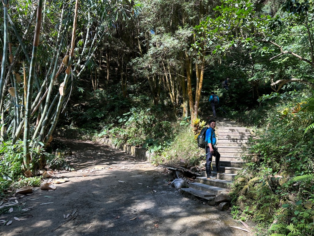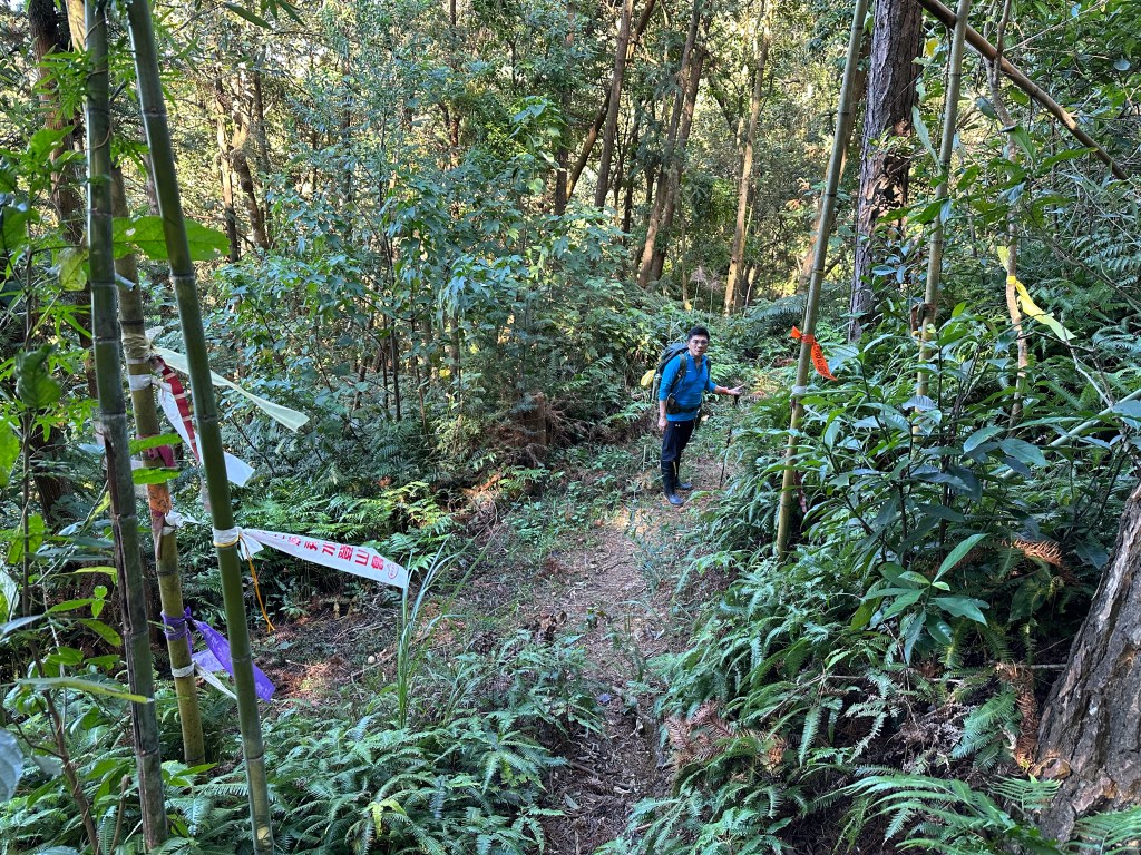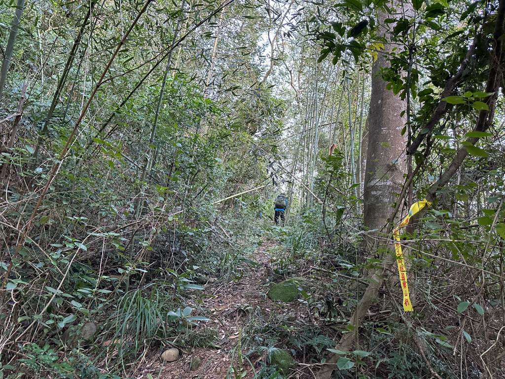 繼續上路,Tim、David、Steven飛也似的走得很前面了,只剩下我(Gosen)持續等待一路拍照的Smile, 在稜線上走了約600m後,路徑轉為寬大林道型態,但此林道在此右轉而下,這是錯誤的路線!在此不能跟隨右轉,而是繼續直走進入山徑裡,我一時不察在此稍微小跑了一下,結果多走了100m的距離,感覺不對再拉回稜線路上,接著的200m路徑就開始拉繩陡下,直到接上竹26鄉道,接上竹26鄉道前會由一個鐵梯而下。