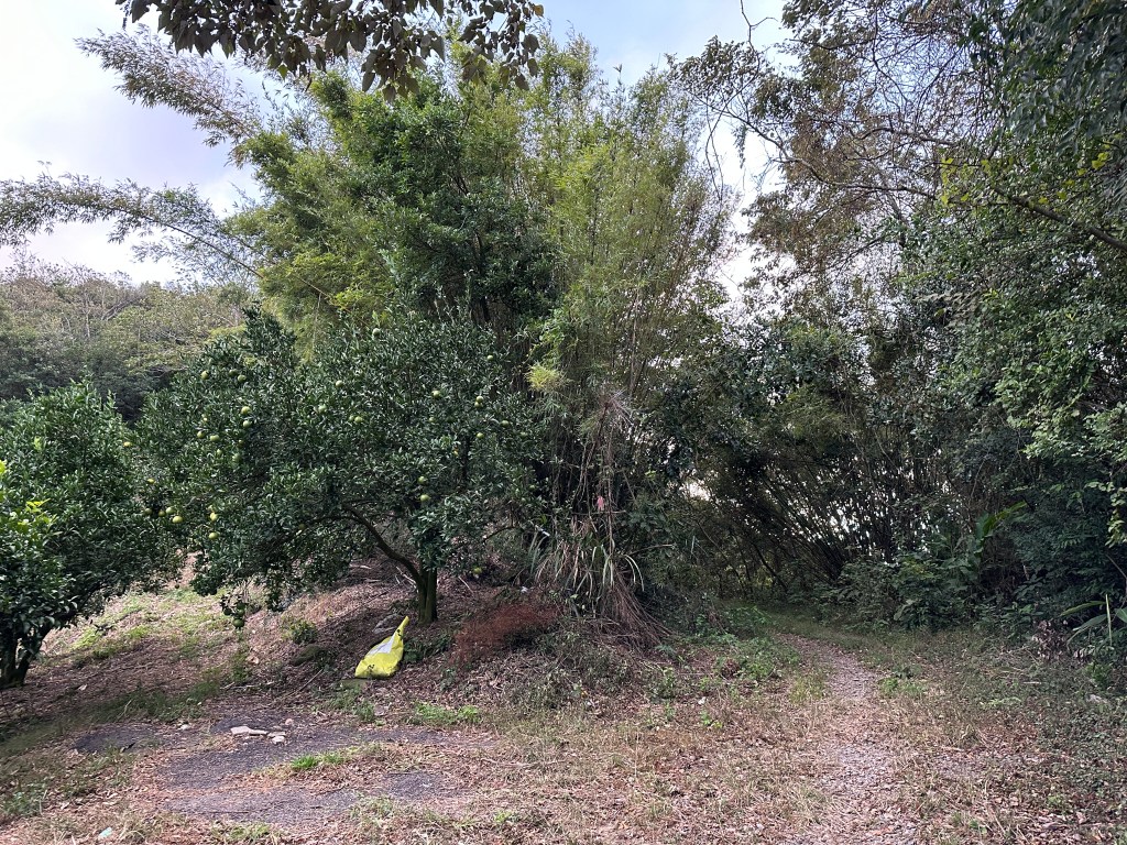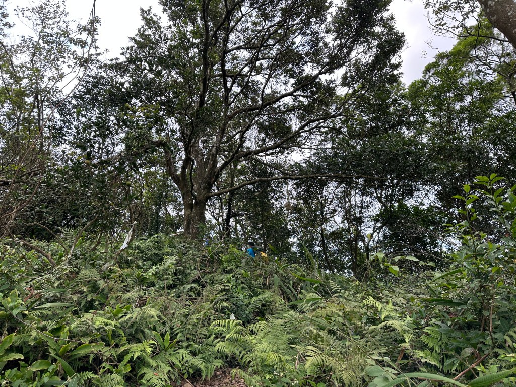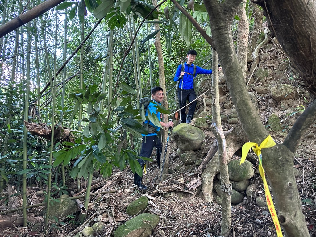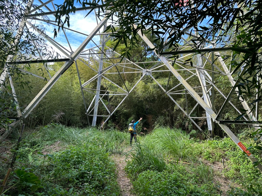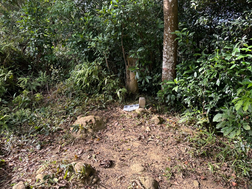 過了鹿寮坑山後,緊接著就接上鹿彭沿稜,馬上就會經過大型電塔,記得要繞過電塔繼續沿著稜線走,不要往電塔左側的往下路徑,走錯了就會直接接上產業公路。由鹿寮坑山往彭厝窩山的距離為1K,路徑好走,接近彭厝窩山時,要利用離線地圖來對一下,因為彭厝窩山的三角點是座落在稜線下方約20m的果園斜坡上,並不是在稜線上喔!我們稍微找了一下,終於找到三角點,今天的第七峰:彭厝窩山。