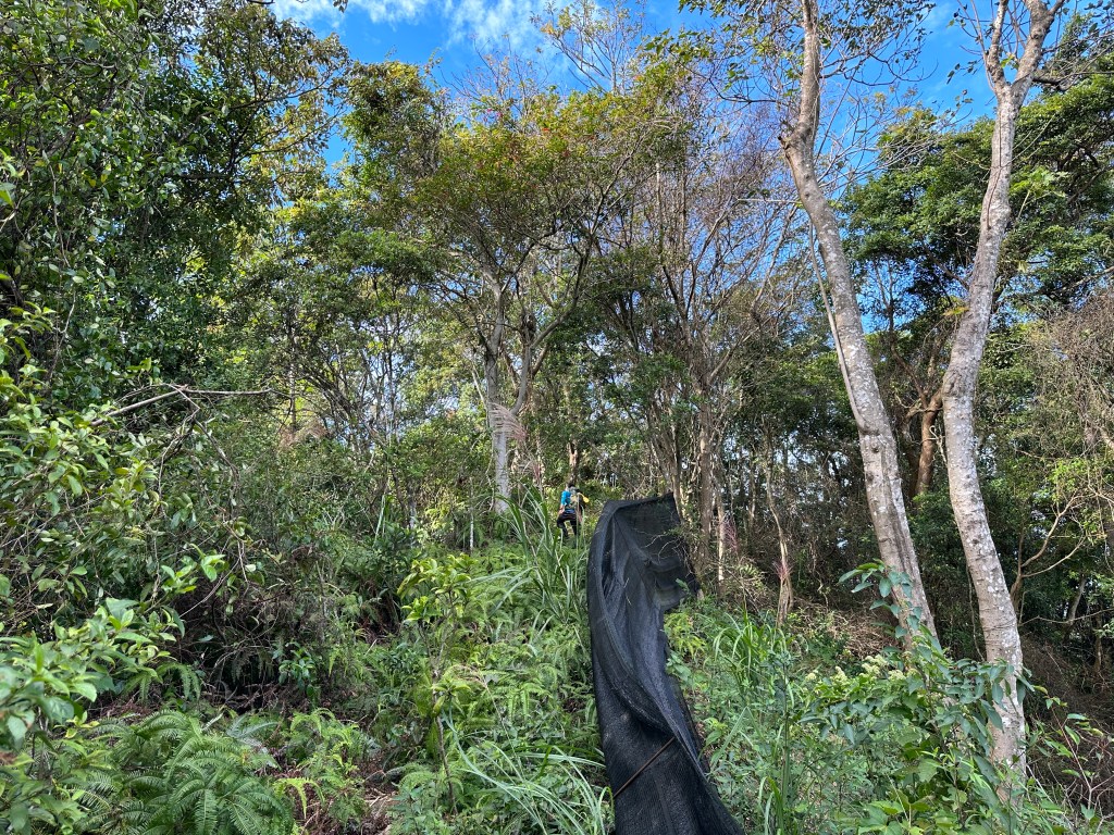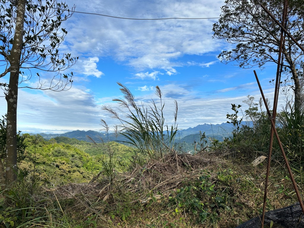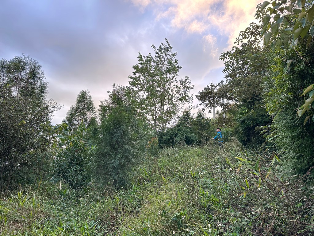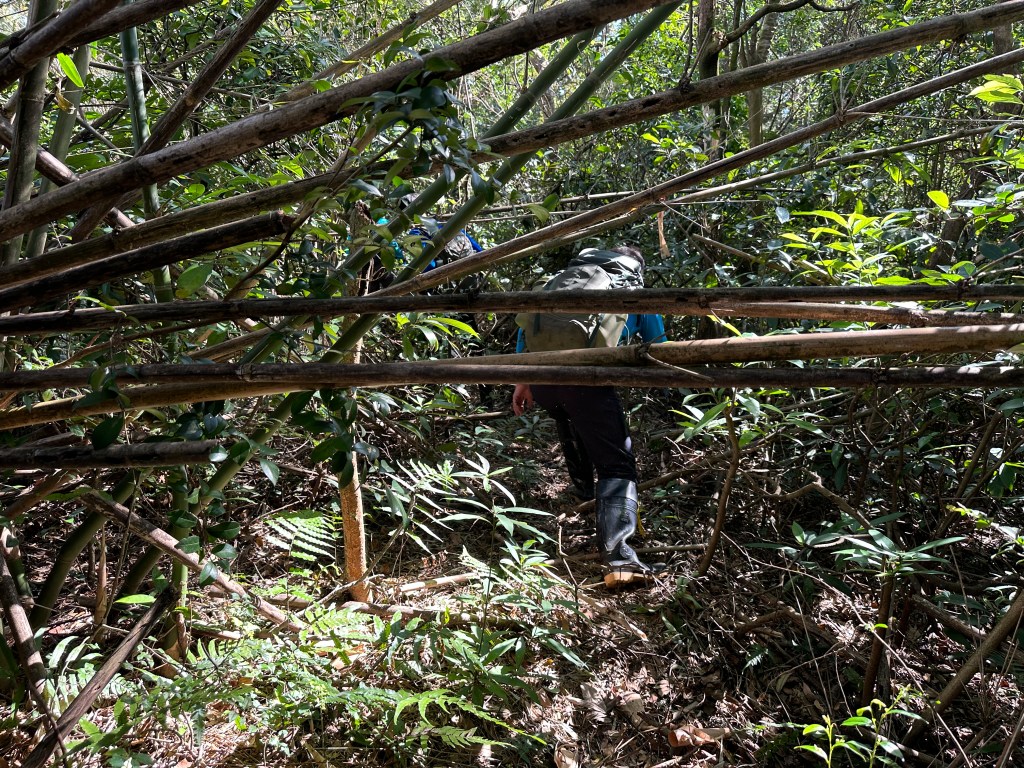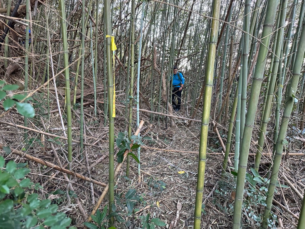 過了鹿寮坑山後,緊接著就接上鹿彭沿稜,馬上就會經過大型電塔,記得要繞過電塔繼續沿著稜線走,不要往電塔左側的往下路徑,走錯了就會直接接上產業公路。由鹿寮坑山往彭厝窩山的距離為1K,路徑好走,接近彭厝窩山時,要利用離線地圖來對一下,因為彭厝窩山的三角點是座落在稜線下方約20m的果園斜坡上,並不是在稜線上喔!我們稍微找了一下,終於找到三角點,今天的第七峰:彭厝窩山。