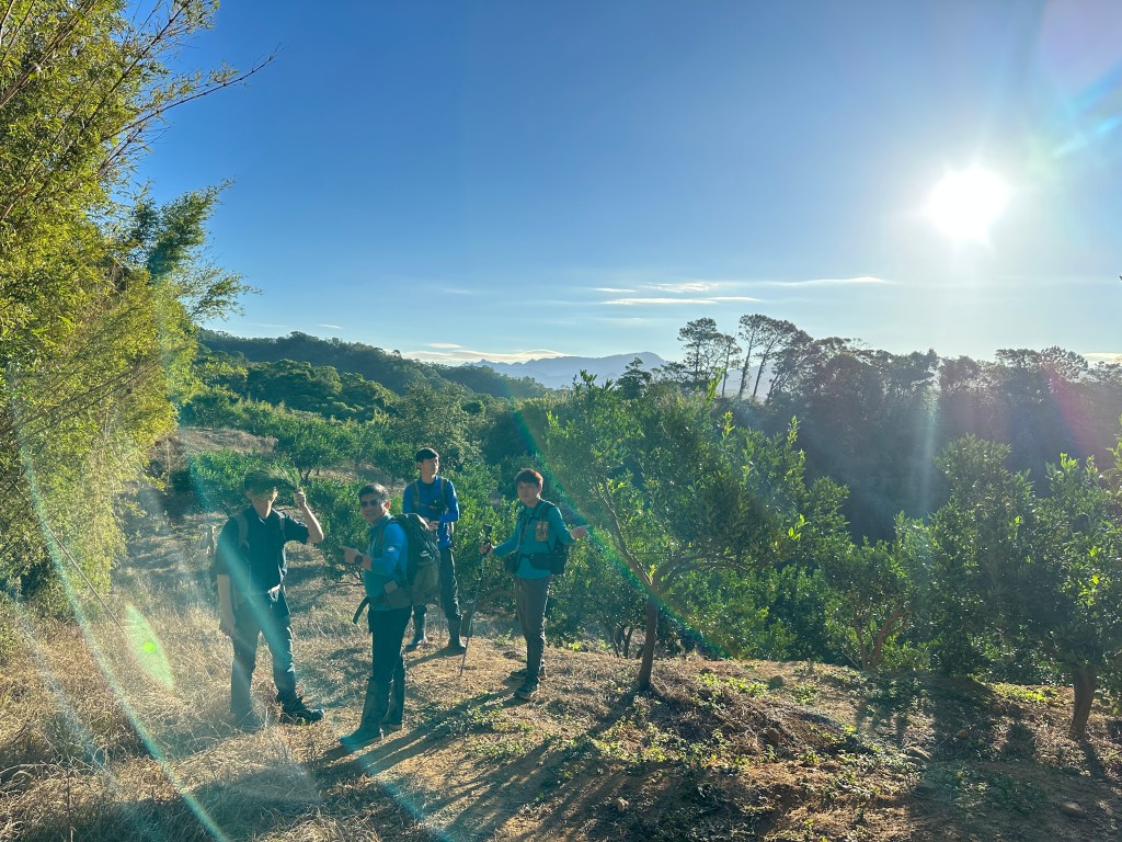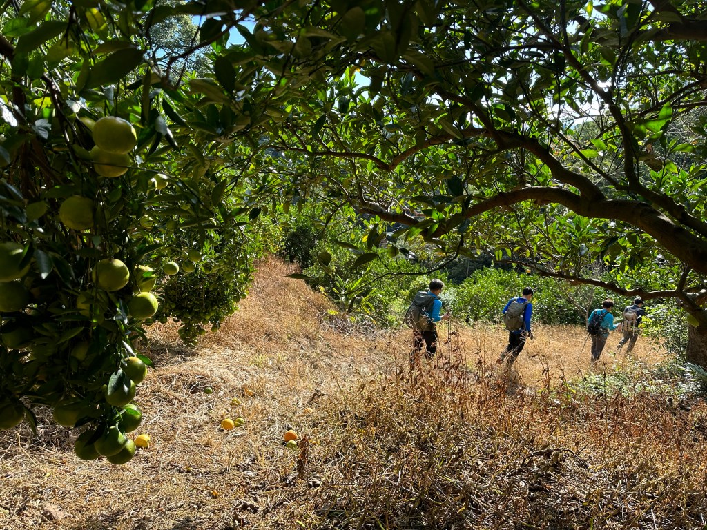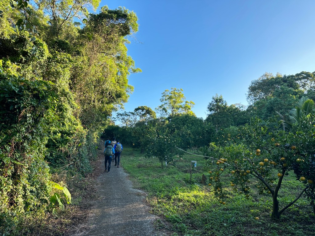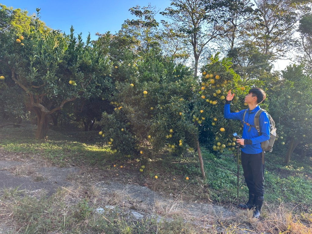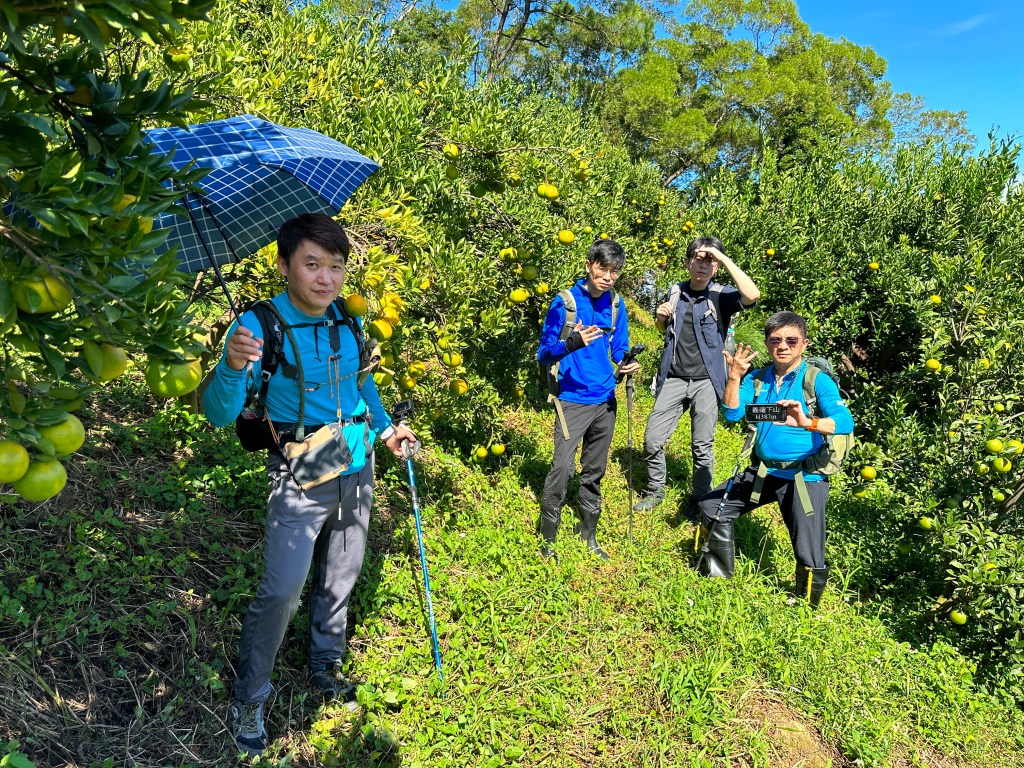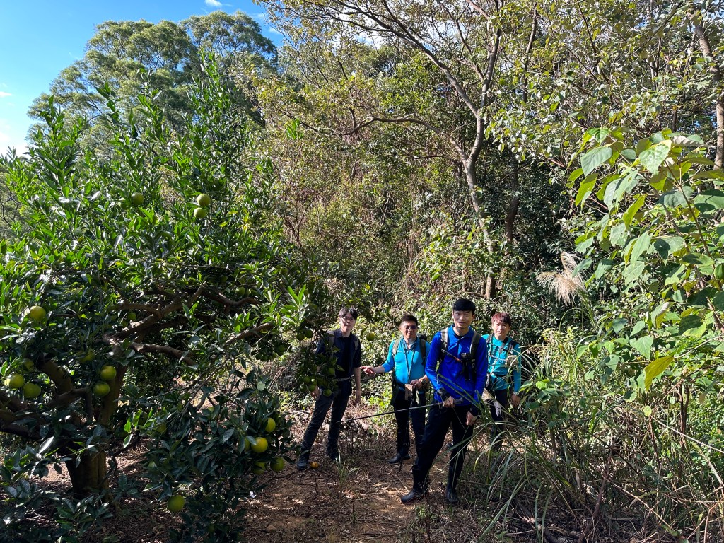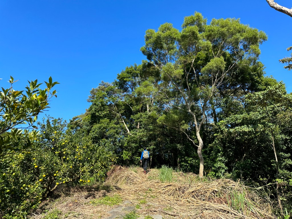 拍完照後,繼續沿著稜線路上前行,只能說路徑非常優美,從三爺坑山到第二峰的龜殼山,距離有2K,海拔上下起伏不超過30m,沿路有一半是水泥路,走來輕鬆愜意,走一小段路就走進了橘子園裡,此時恰好遇到果園的男主與女主帶著狗狗正在果園中散步,突然看到我們五人出現有些驚訝!我們告知男主今天的行程後,男主一直說我們太瘋狂了,哈哈!