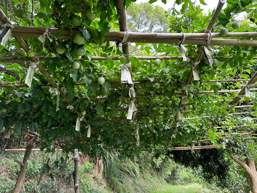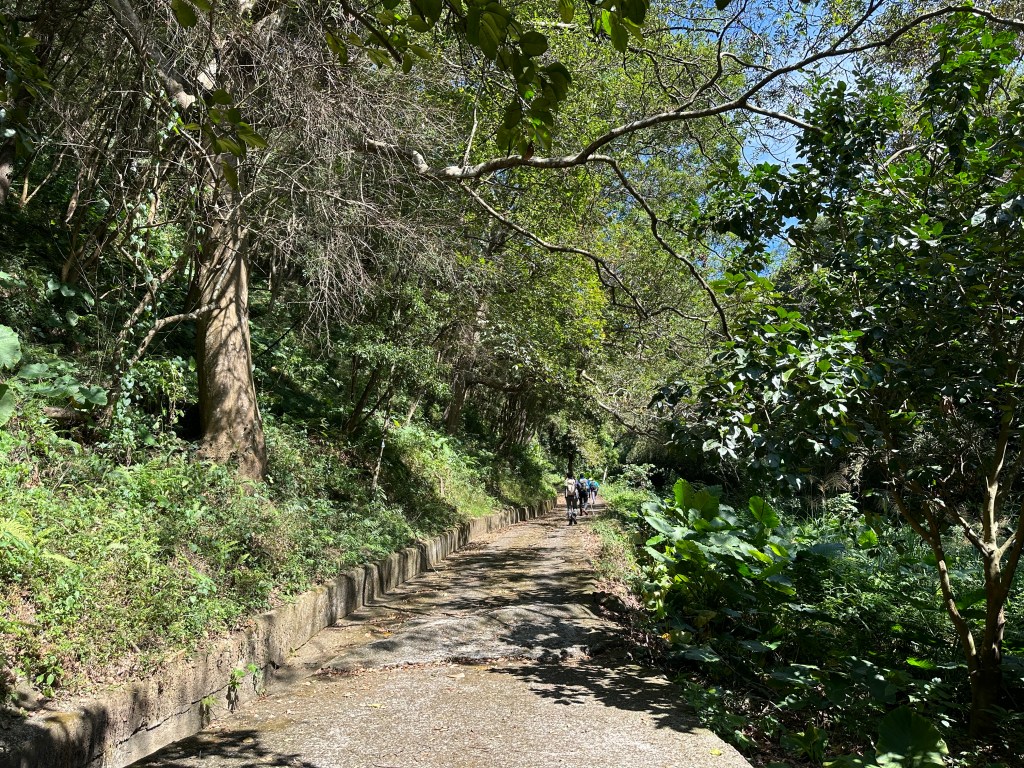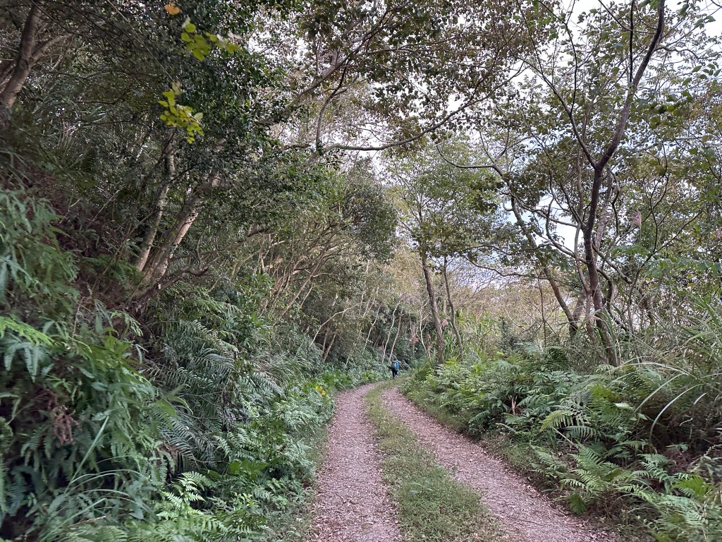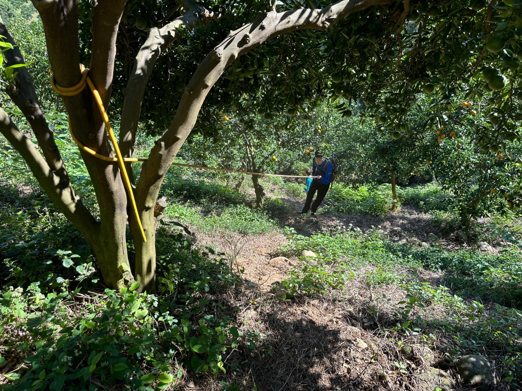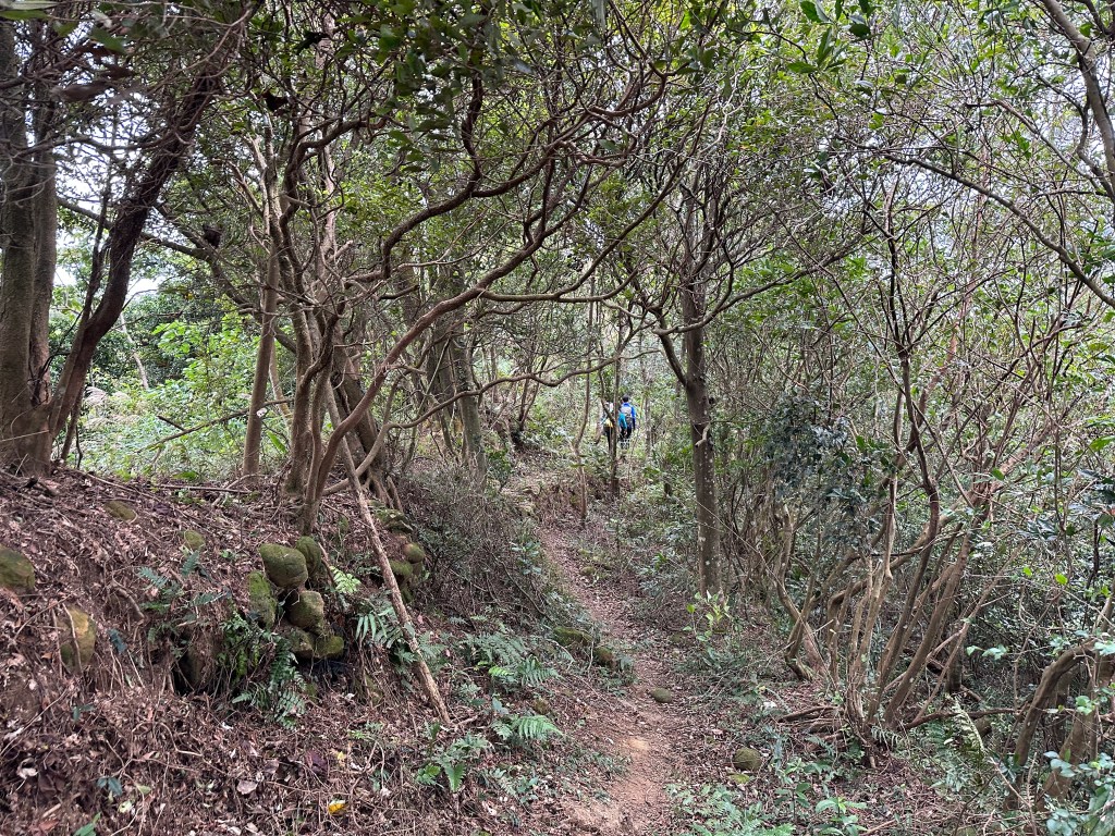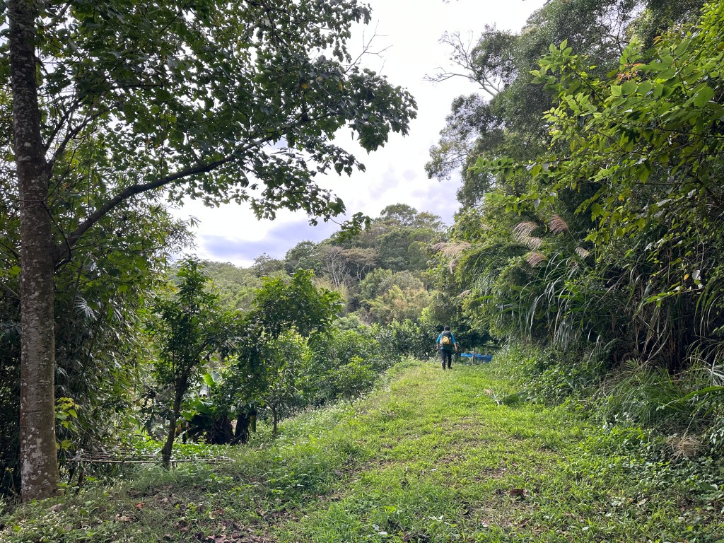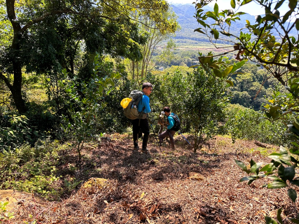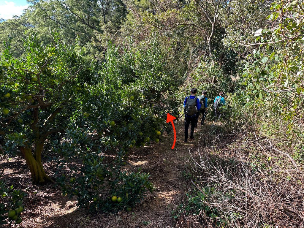 拍完照後,繼續沿著稜線路上前行,只能說路徑非常優美,從三爺坑山到第二峰的龜殼山,距離有2K,海拔上下起伏不超過30m,沿路有一半是水泥路,走來輕鬆愜意,走一小段路就走進了橘子園裡,此時恰好遇到果園的男主與女主帶著狗狗正在果園中散步,突然看到我們五人出現有些驚訝!我們告知男主今天的行程後,男主一直說我們太瘋狂了,哈哈!