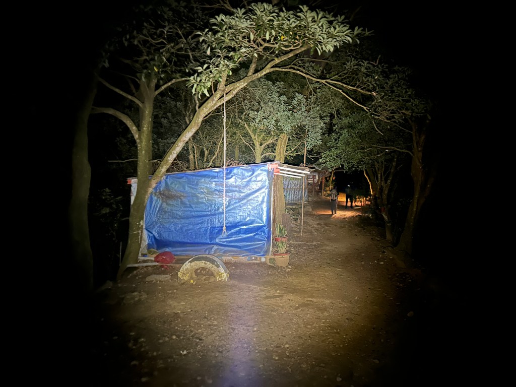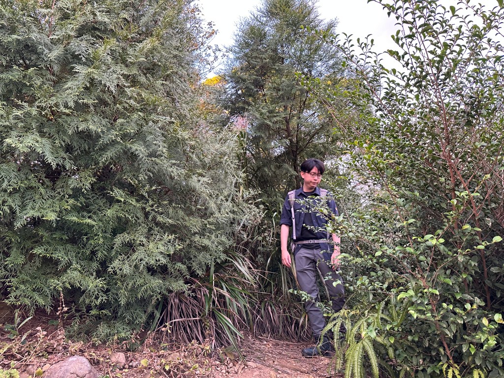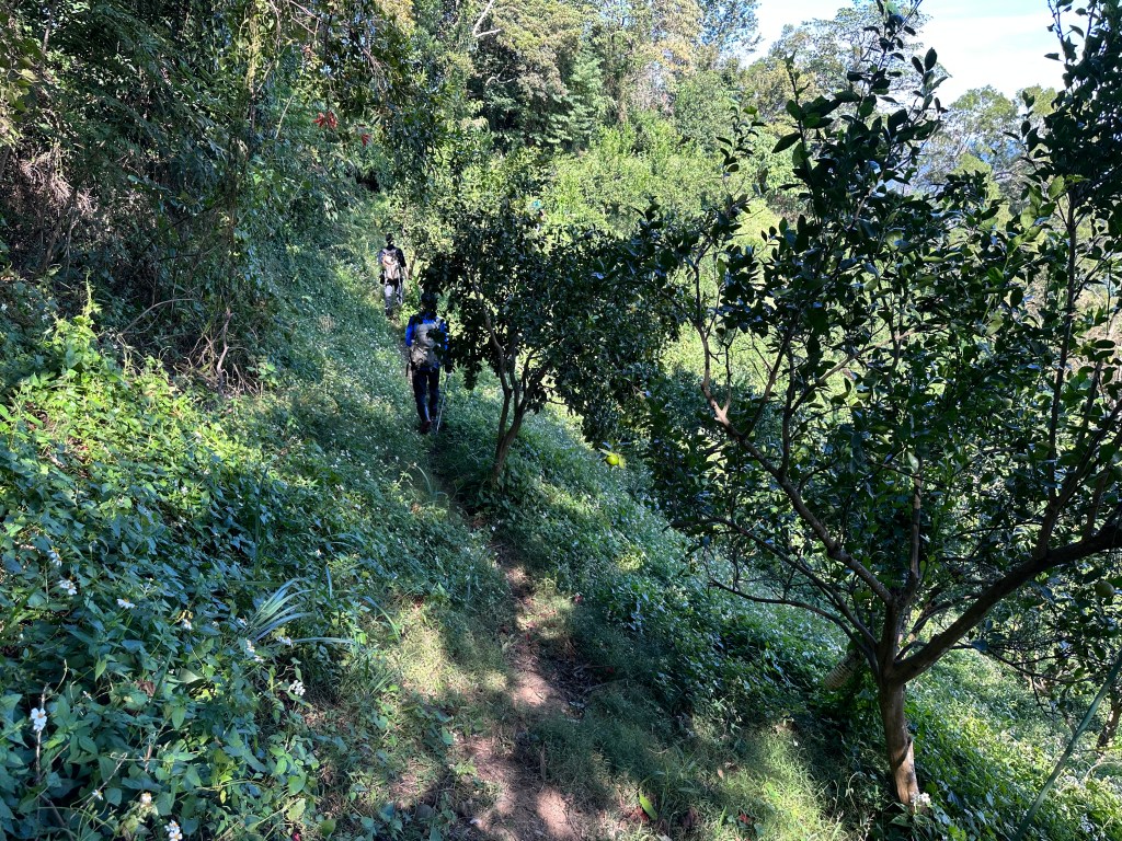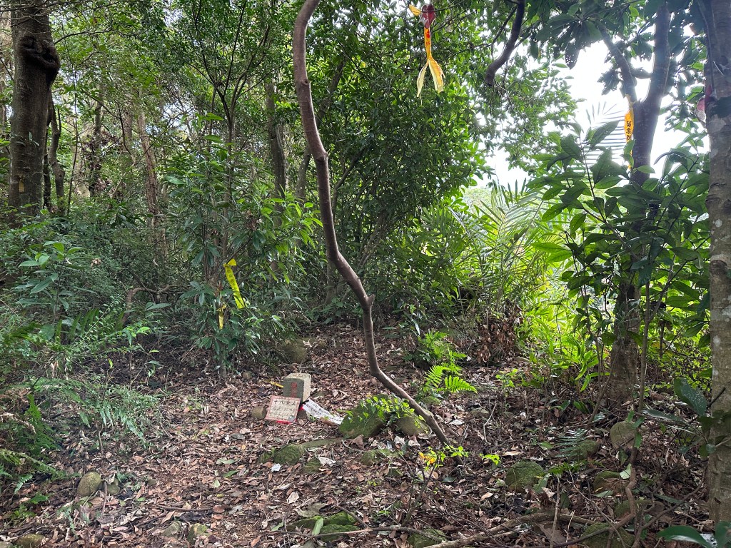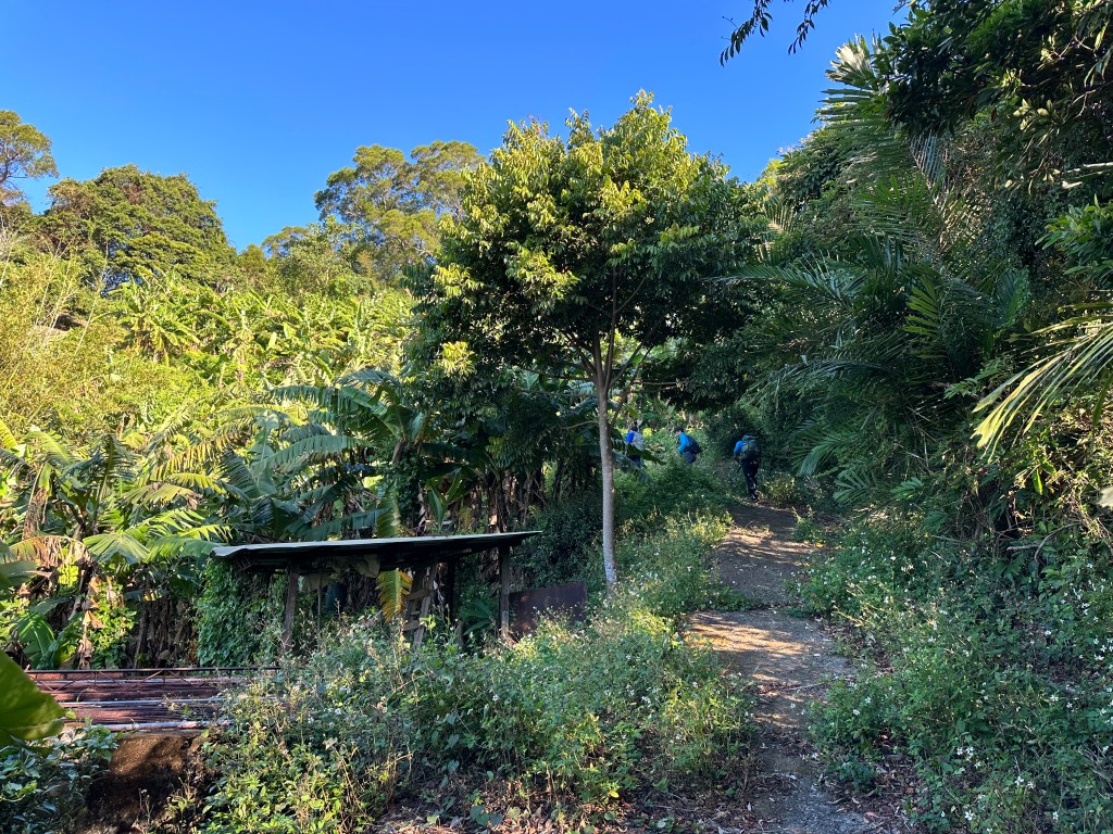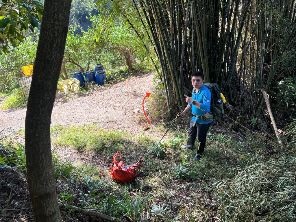 由十六份山回程走900m再度回到大榕樹岔,接著就右轉往顯伯公方向走,到顯伯公要1.7K,路徑條件不差,就在山徑與果園之間穿插而行,在下午4點15分左右抵達,這裡有廁所可供使用,也跟顯伯公(土地公)祈禱保佑我們一行五人平安下山,此時離下午約5點半天黑,時間也只剩下一小時左右,看來今天是一定要摸黑了。