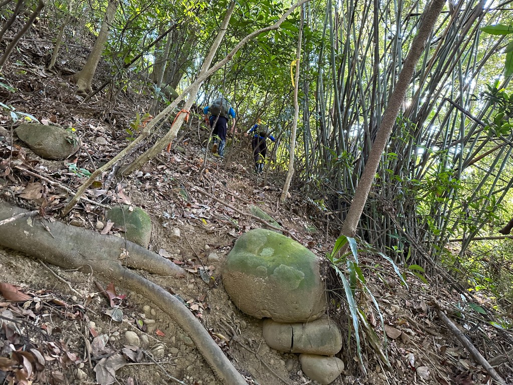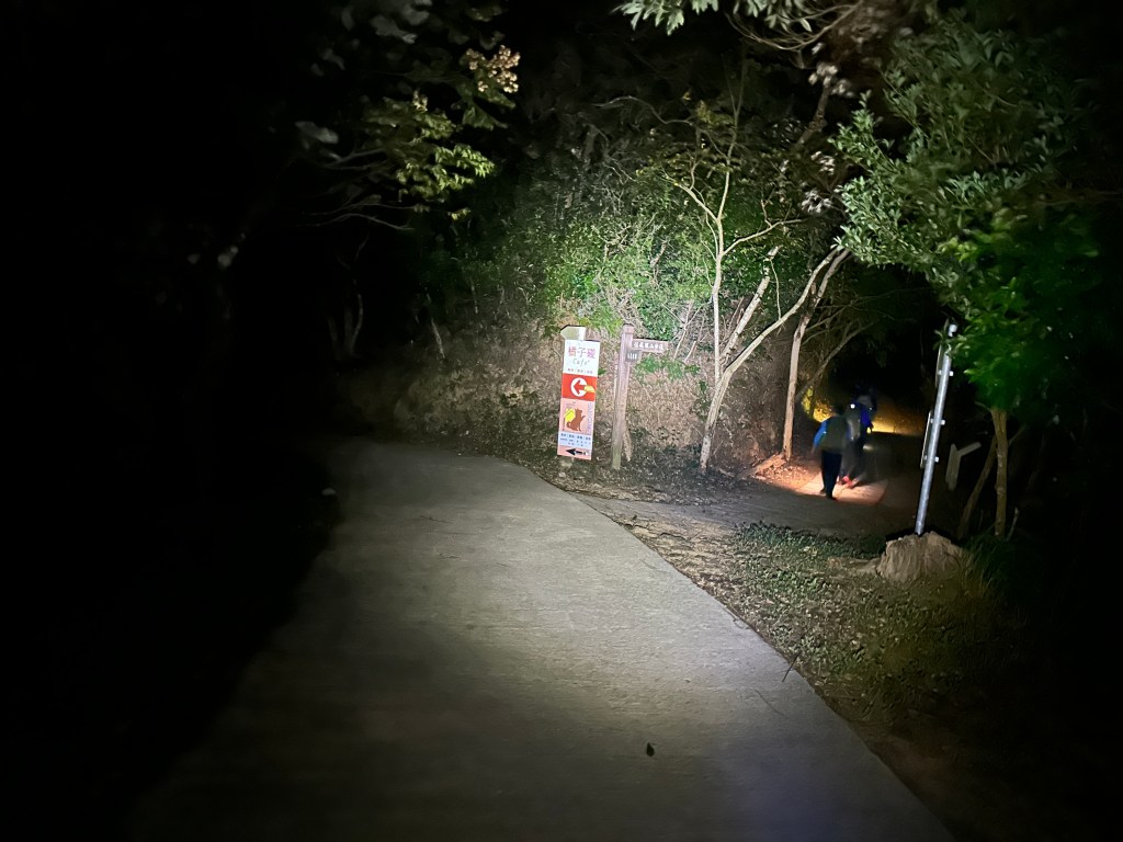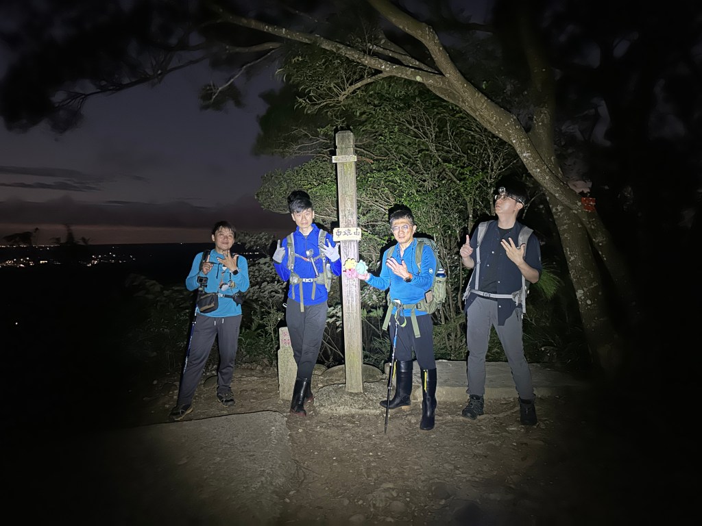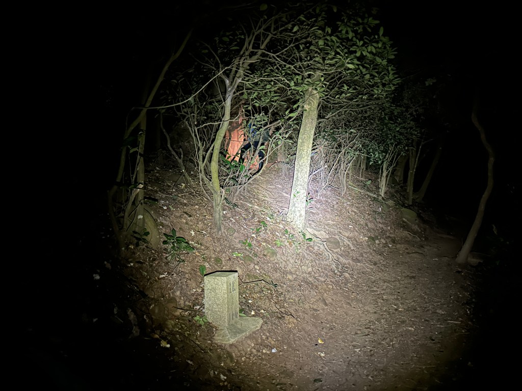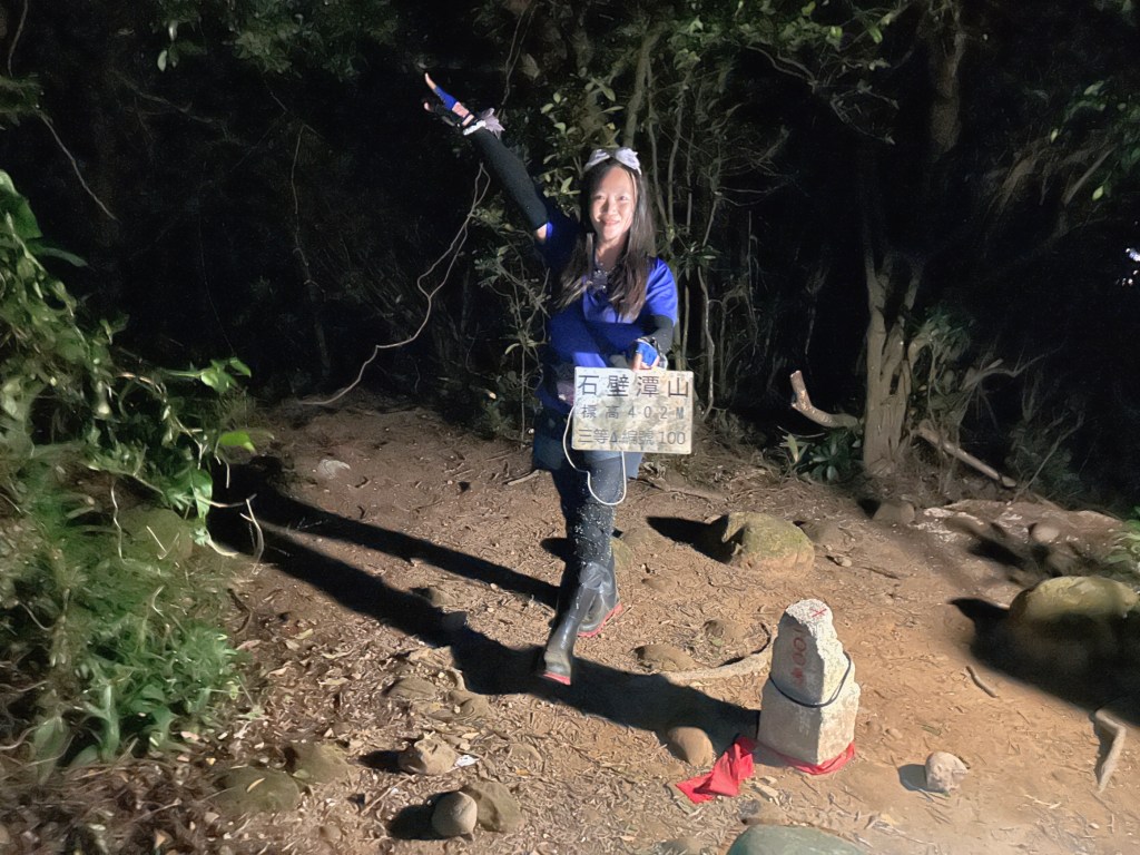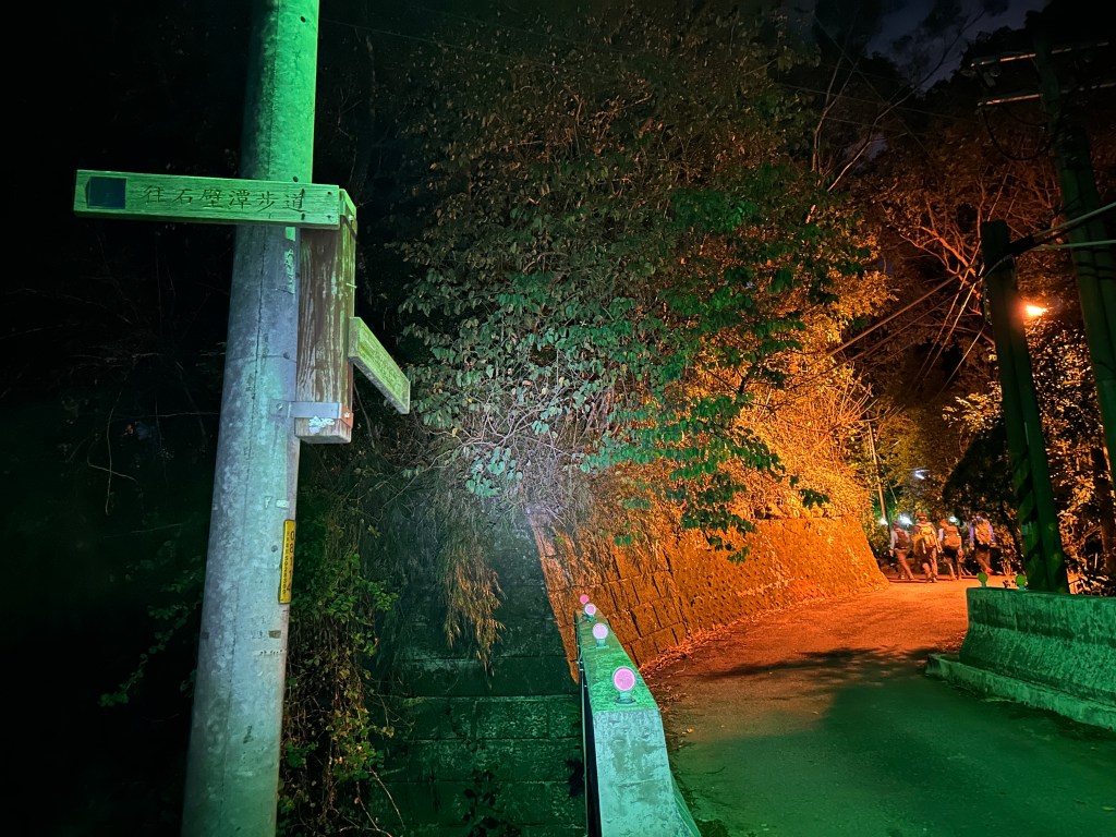 從飛鳳山走階梯步道回到相思崖、三岔路,開始轉往石壁潭山走,由三岔路到石壁潭山需要距離1.4K,路徑寬廣但路徑上石頭不斷干擾了走路的速度,兼摸黑導致這一段1.4K走了將近35分鐘,抵達石壁潭山,今天的第二十一峰!終於完成了!此時已經過了晚間7點。