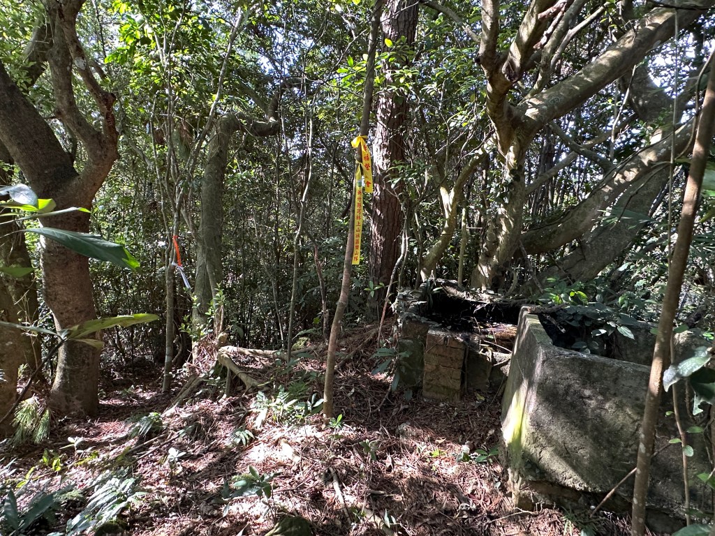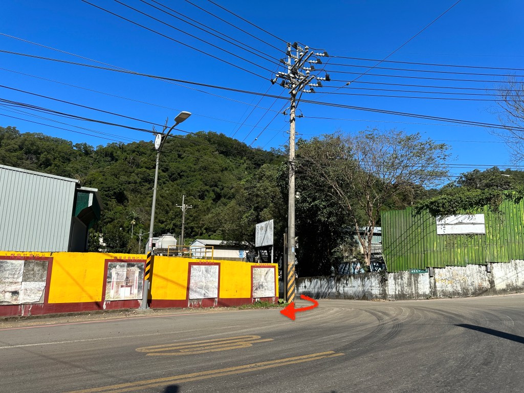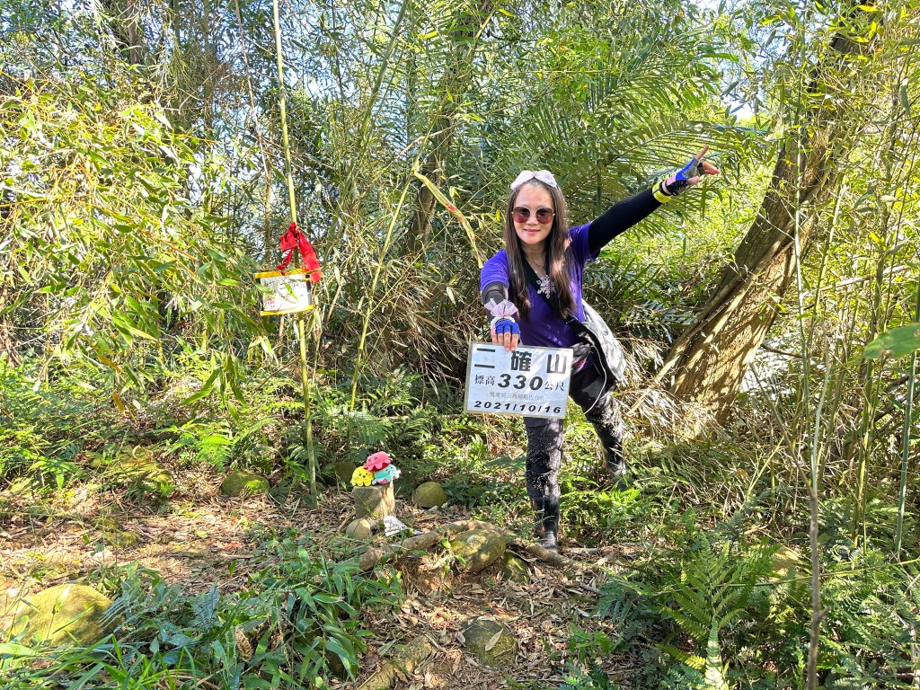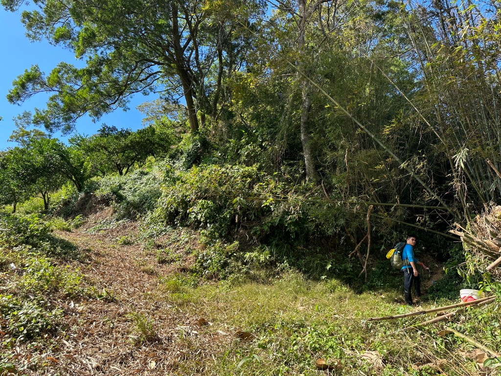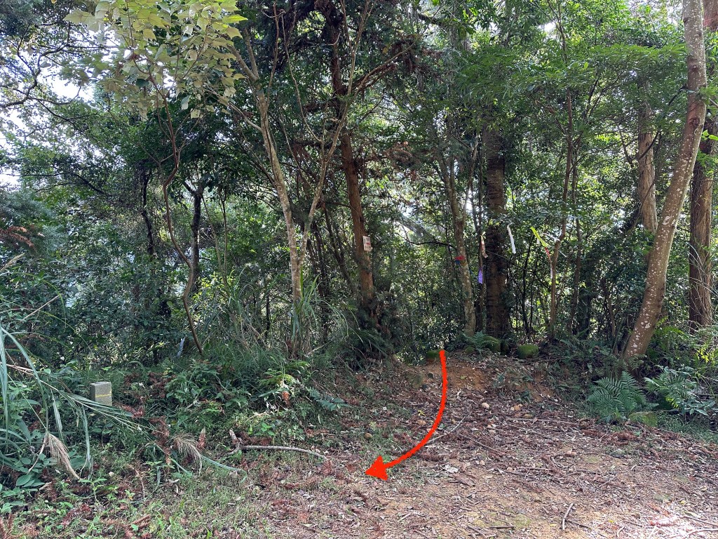 接著,可以往上20m走回稜線路,再沿著稜線路走200m接上產業道路,也可以繼續往下走20m接上彭厝窩產業道路,循著彭厝窩產業道路走200m也一樣可以接上產業道路,這表示稜線路與彭厝窩產業道路兩條路線是平行的。接上產業道路後左轉走100m後,就往右岔而上進入山徑裡,100m後就會看到小小的永福堂土地公廟,但,土地公不見了?持續陡上走400m的距離抵達今天的第八峰:義確山,再往前走不到100m就會抵達第九峰:義確下山,但義確下山座落在果園內,三角點已經不見了?所以,我們再度採用手機跑馬燈來標記位置!