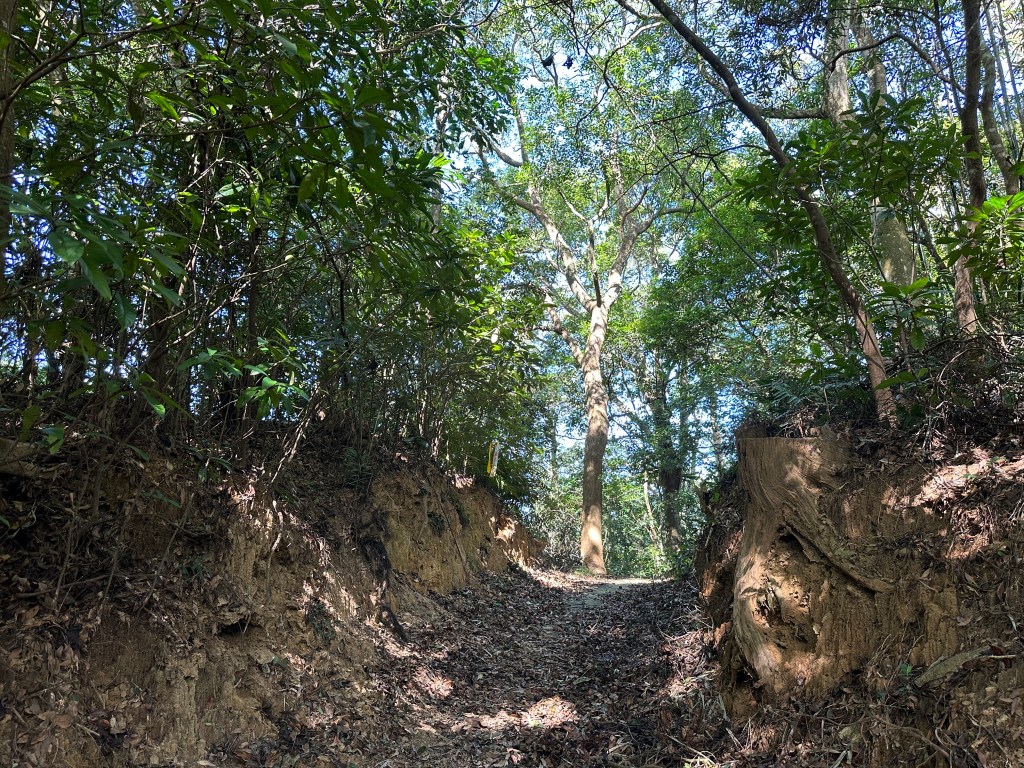 繼續走500m,都在果園裡,從果園下切可到二確山,今天的第十峰。從二確山回走切回到飛沙縱走路徑上,通過左側一個小山谷,看著對面的三合院,以及山谷中的落羽松,真覺得這裡是世外桃源!先沿著私人土地的圍籬右側緩上,再接上寬大路徑陡上一小段,走900m後抵達今天的第十一峰:沙坑山,沙坑山這裡有涼亭座椅,我們五人就在此休息午餐並拍照,花了23分鐘。