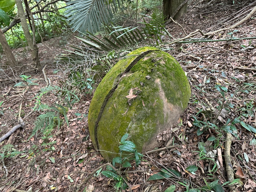 就在經過山上的民宅後,來到了今天的第二峰:龜殼山,這三角點躲在細小產業道路的右側一些,要仔細的尋找一下。接著,離開龜殼山,沿著產業道路折返約100m後,直接往左岔入山徑中,由龜殼山到茄苳窩山之間的距離有2.8K,要由海拔H304m的龜殼山陡下到海拔約H220m的產業道路上,這中途會經過果園,路徑沿著果園走到要脫離果園時,記得別看到路徑優美就一直往前行,而是在要脫離果園時就沿著果園左轉而下,我們在此不小心繼續前行了約100m才發現有誤,再折回往果園而下,下走一小段接著接上產業道路,經過了式穀祠石板伯公(土地公廟),再來就再度進入山徑開始要陡上到海拔H381m的茄苳窩山。