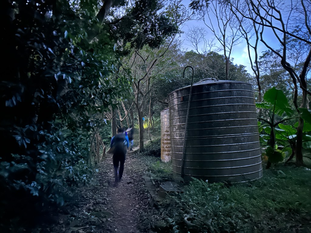 由停車處到三爺坑山的距離為0.9K,要陡升海拔約150m的高度,逐漸陡上過程中都是走在水泥路的產業道路上,中途有一小段小崩塌造成路徑陡滑,通過之後再陡上一段就上了稜線,路徑轉為平緩且偶爾出現有水泥路徑,經過鐵製大水塔後就直接走到今天的第一峰:三爺坑山。