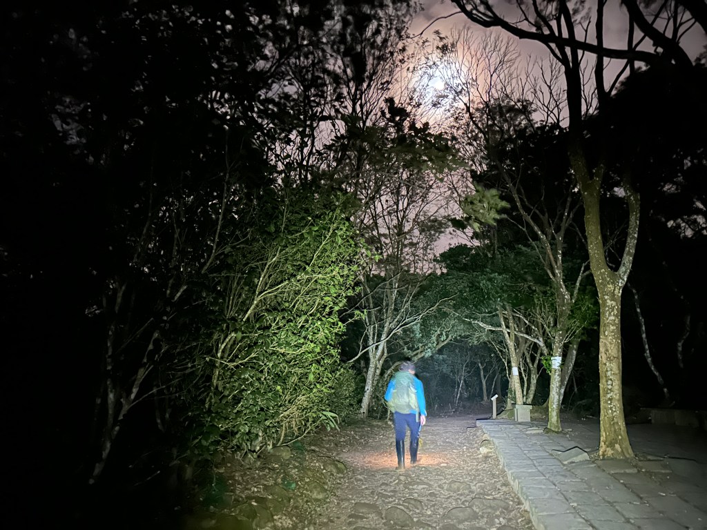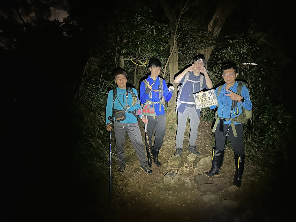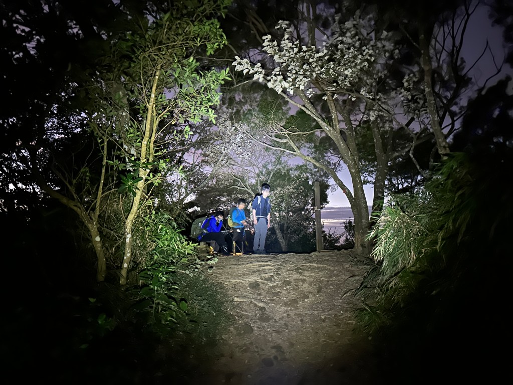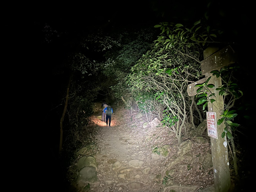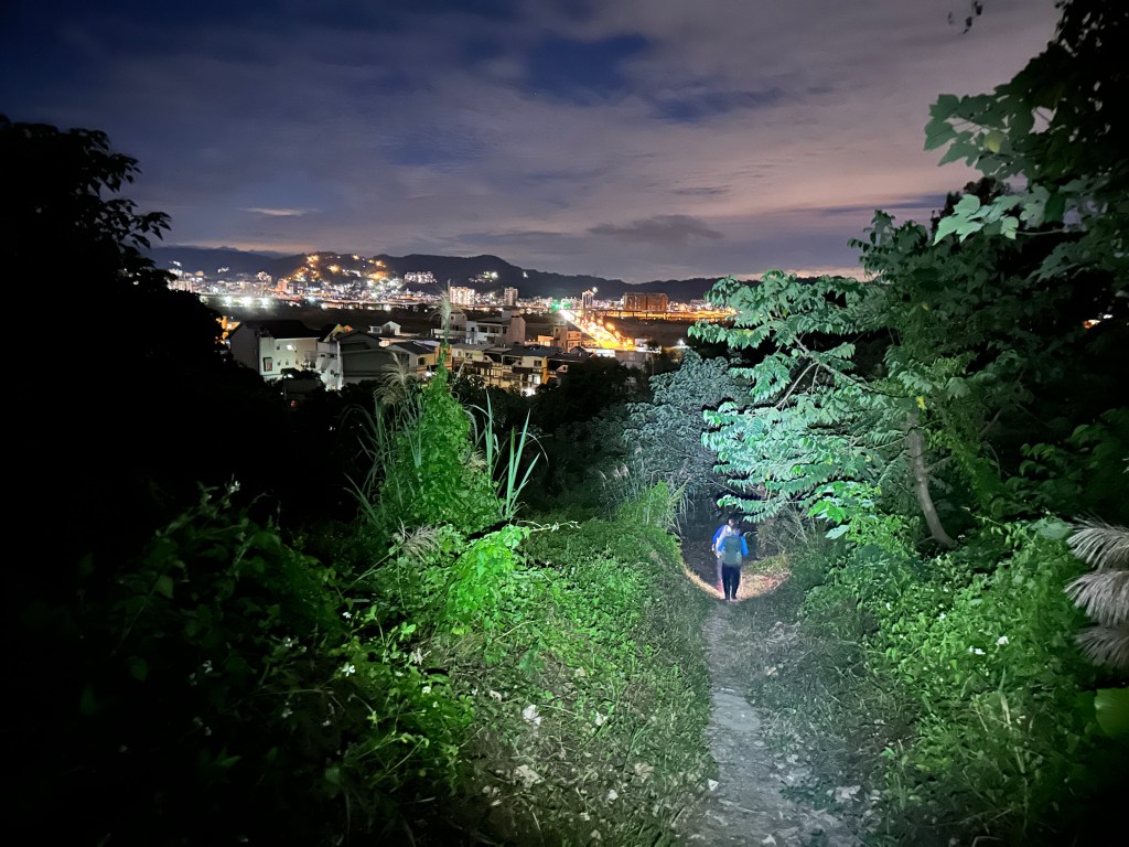 由牛欄坑山再往前走600m走到三岔路涼亭,此時天色仍光但森林已黑,大伙也將頭燈都給準備好,再沿著V型階梯步道先下再上走400m抵達第十九峰:中坑山,在此也可看到遠處湖口的城市亮光。這時天色既然已黑,大伙就在此稍微休息一下,接著不再加快腳步,反而放慢往飛鳳山方向走。