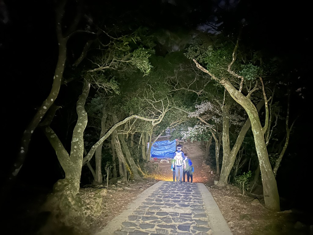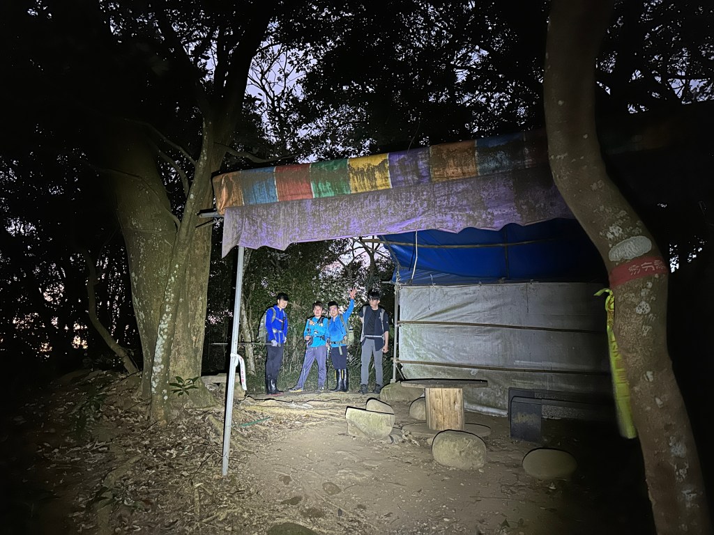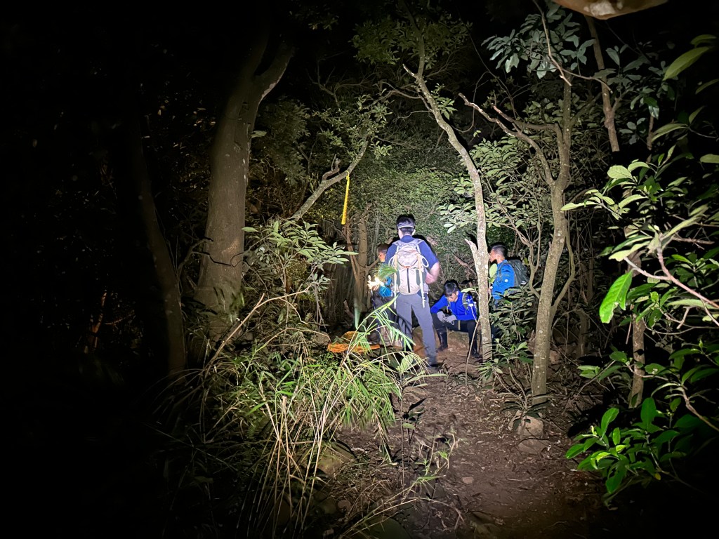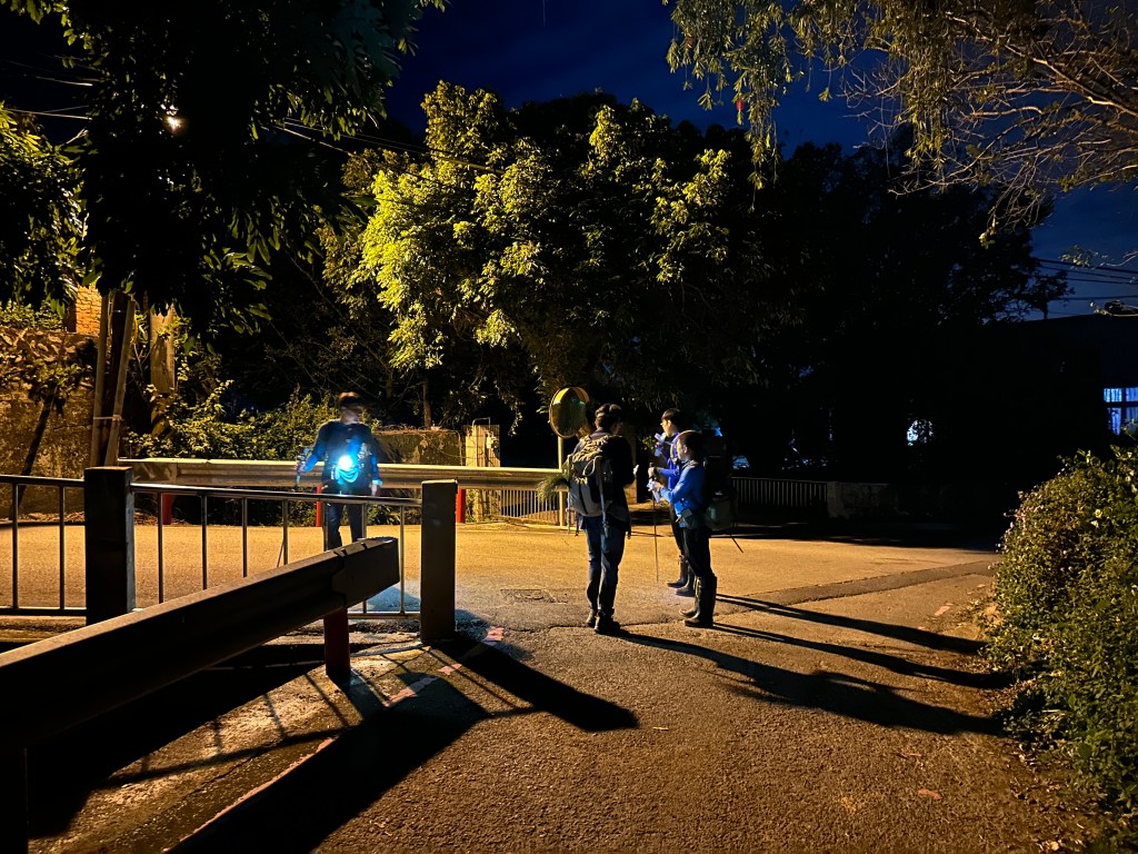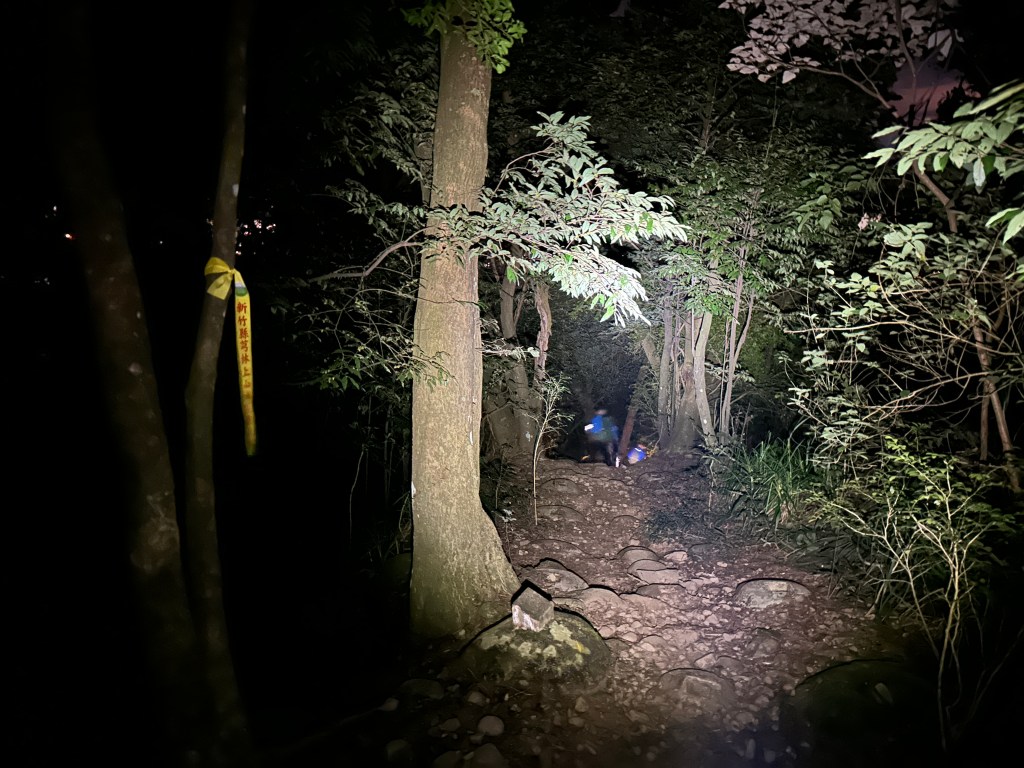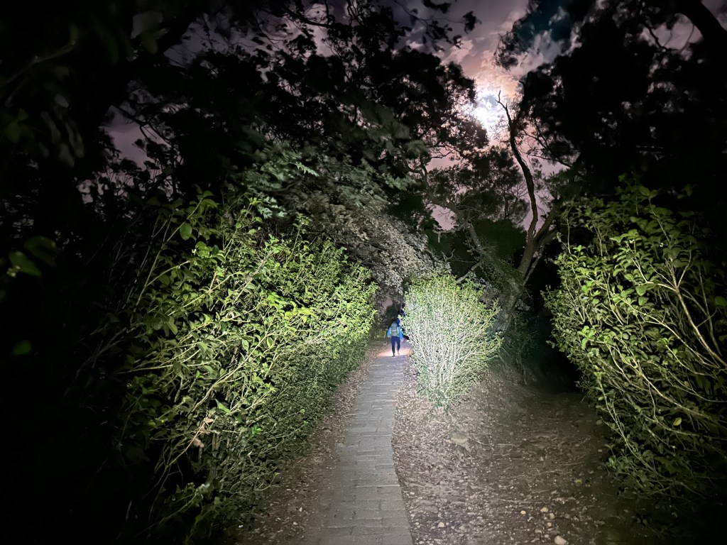 由牛欄坑山再往前走600m走到三岔路涼亭,此時天色仍光但森林已黑,大伙也將頭燈都給準備好,再沿著V型階梯步道先下再上走400m抵達第十九峰:中坑山,在此也可看到遠處湖口的城市亮光。這時天色既然已黑,大伙就在此稍微休息一下,接著不再加快腳步,反而放慢往飛鳳山方向走。