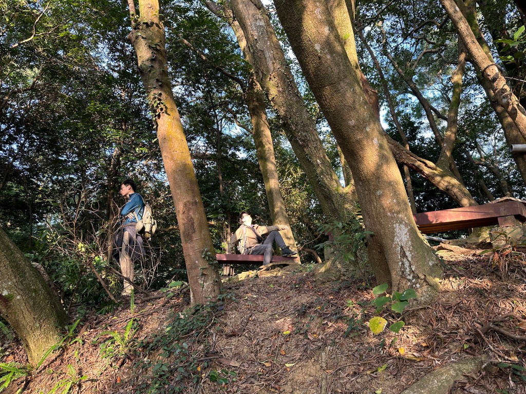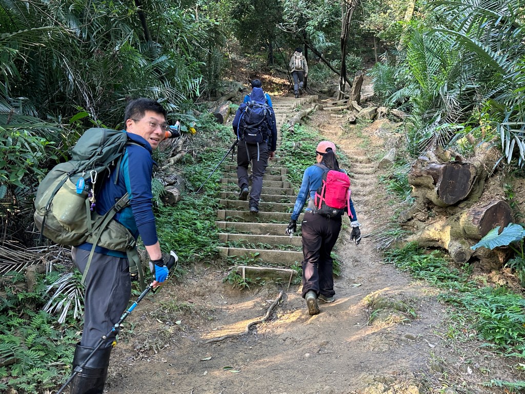 往前直走,不要理會左右兩側的岔路,接著就緩上,0.9K的距離就會抵達福德坑山東峰,或稱為鳶山東峰,今天的第二峰。接著再往前走0.4K,最後200m要陡上高度50m,這一段走在木階梯上,會感受到雙腿的肌肉一直在運作,一口氣走上來其實很喘也很爽!但是就一路聽到在後面的Smile一直唉唉叫!上來後,就抵達長春嶺,今天的第三峰。今天,長春嶺上有好多的山友,都恰好走到此或恰好在此休息。