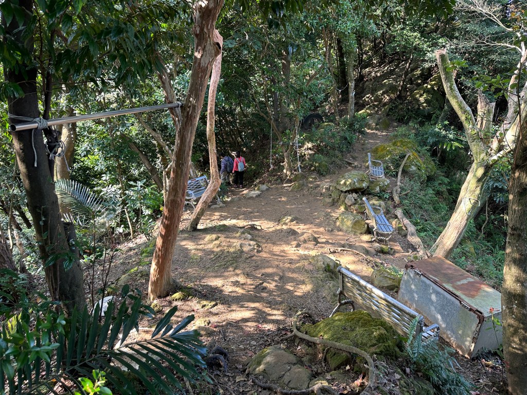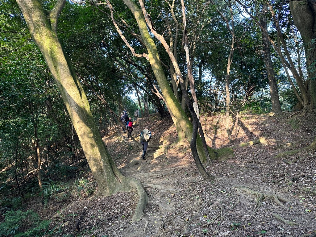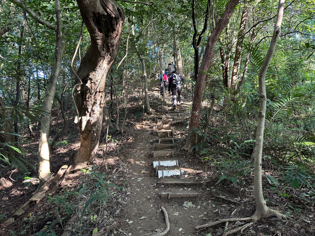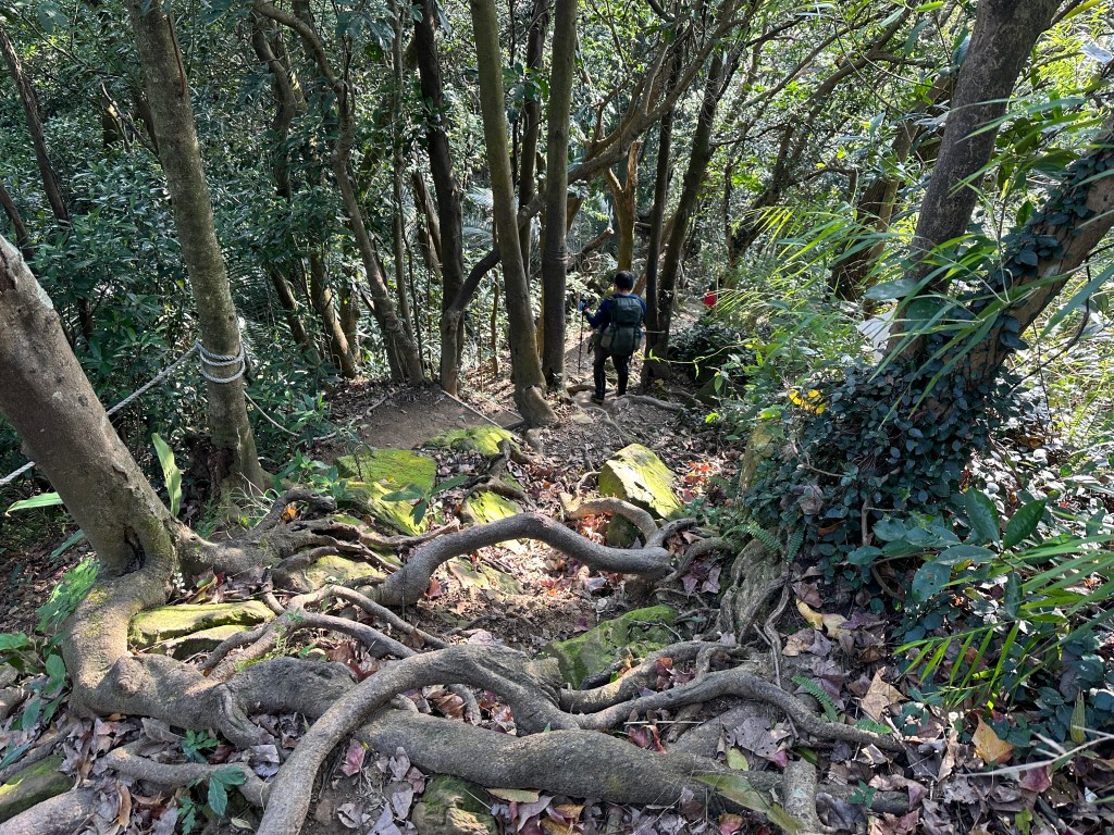 由三合院登山口起登後,接著就一路陡上,要在0.6K的距離裡由海拔H49m陡上到鳶尾山的海拔157m,路徑非常清楚但算得上很陡,中途會看到了一棵八腳怪樹!陡上到鳶尾山就出現一個平台,有木椅可供休息。接著由木梯陡下,接上平緩路徑也就與另一條鳶尾山登山口上來的路徑相接。
