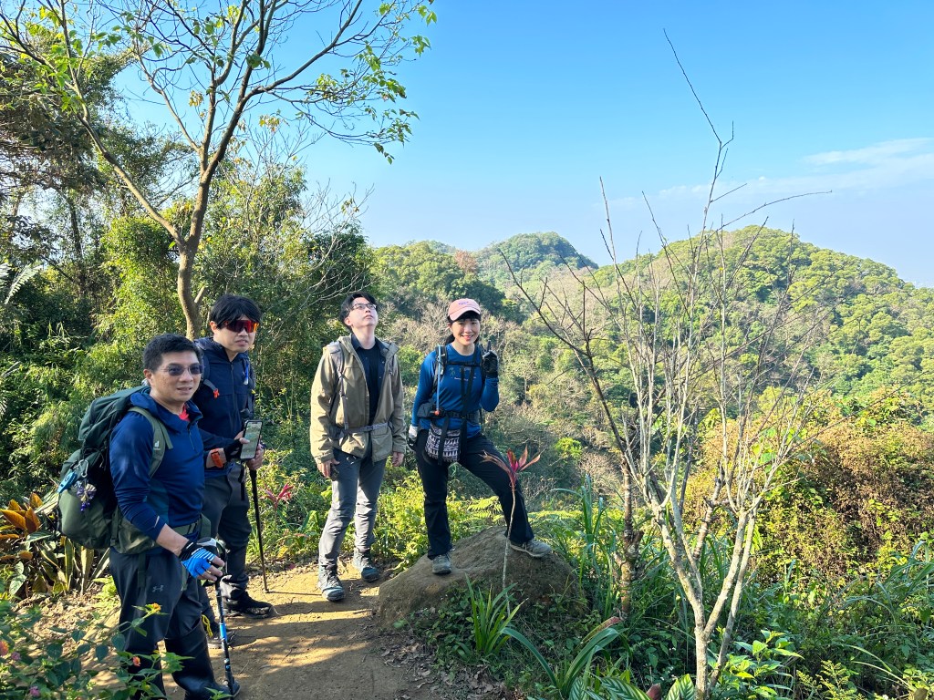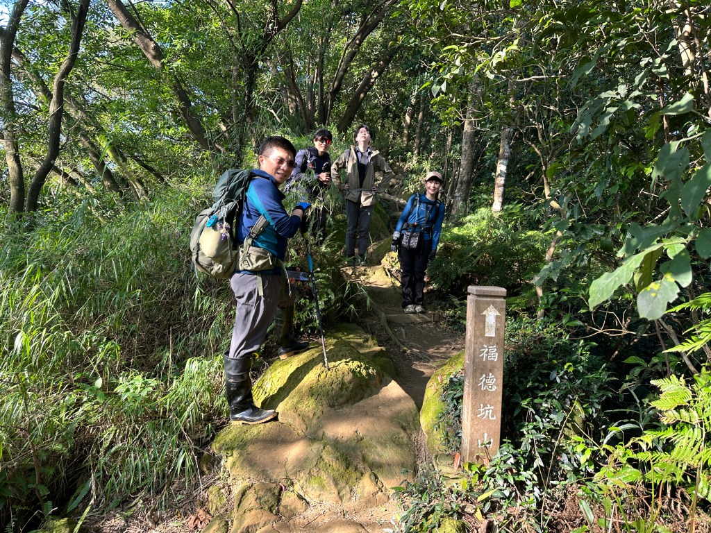 大伙拍完照後,駐足了一段時間,立即往長春嶺回走,但此時,Steven發現這裡太美,不走了,就獨自一人在此空拍攝影,我們只好要他自己來追上我們。當回到長春嶺後,拍完照,就開始往鳶山方向走,也就是往福德坑山方向走,要走0.7K的距離,過程中陡上的幅度不大,會先走到福德嶺,在此Steven追上了大伙,再往前走100m就抵達福德坑山,也就是鳶山,這是排名019的小百岳,也是今天整日行程中的最高位置,此時也有不少的山友正經過此處,這是我們今日的第四峰。