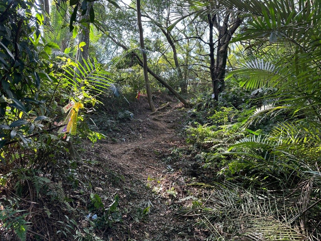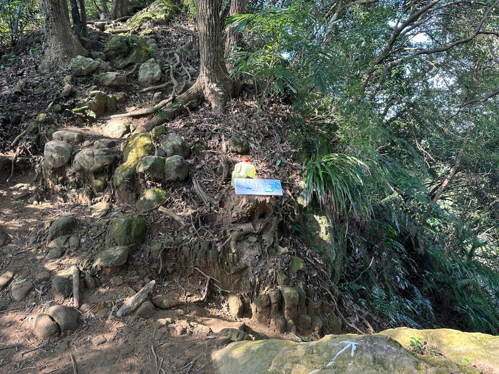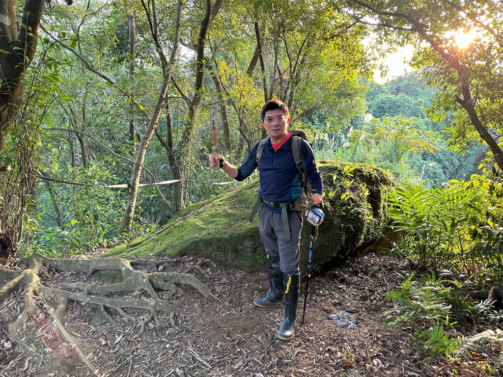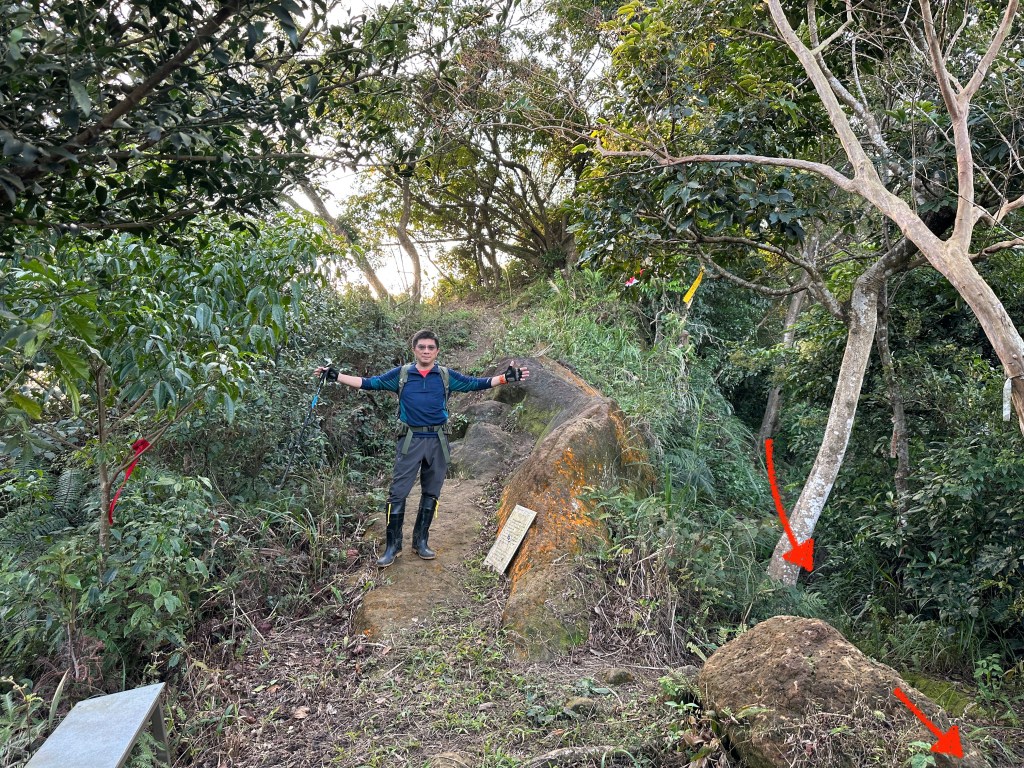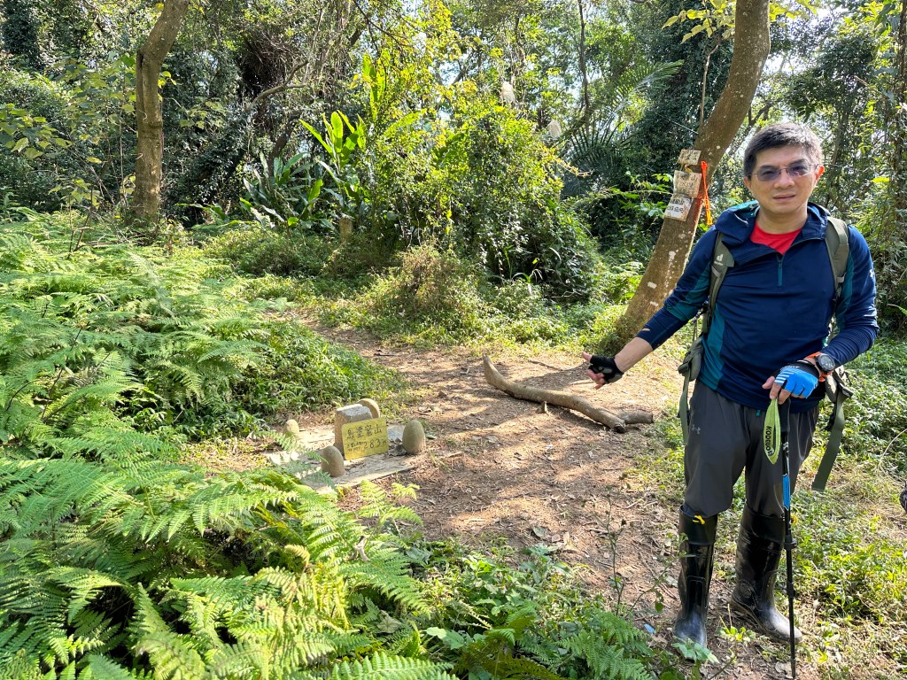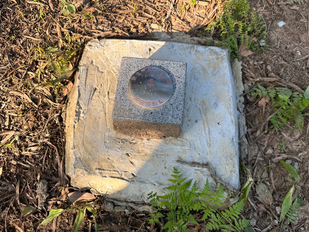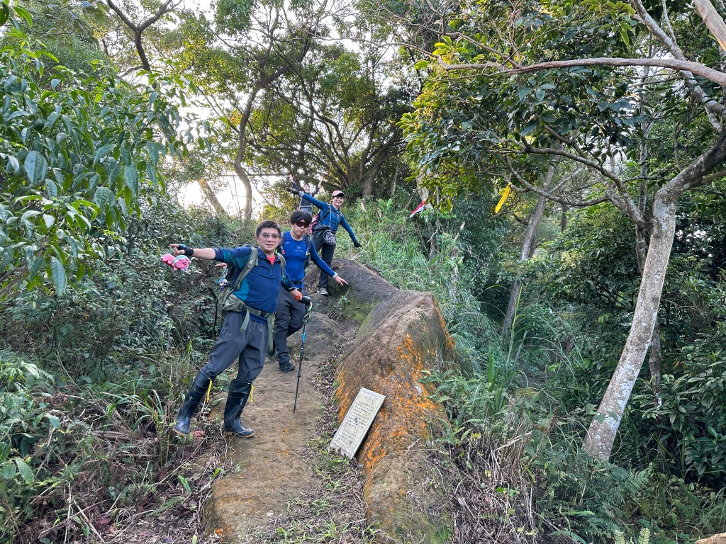 從壽山往第九峰石牛山走,距離需要3.8K,路徑不算難走,但是植披不少,有一兩段容易走錯,要對著離線地圖的軌跡或GPX的路線來走,過程中會出現有不少的里程碑,中途會經過一個四等加密控制點的山頭,這一段我們走了約1.5小時,就來到了石牛山,相傳是鄭成功時代,土地公將作亂的牛精給釘在此處。